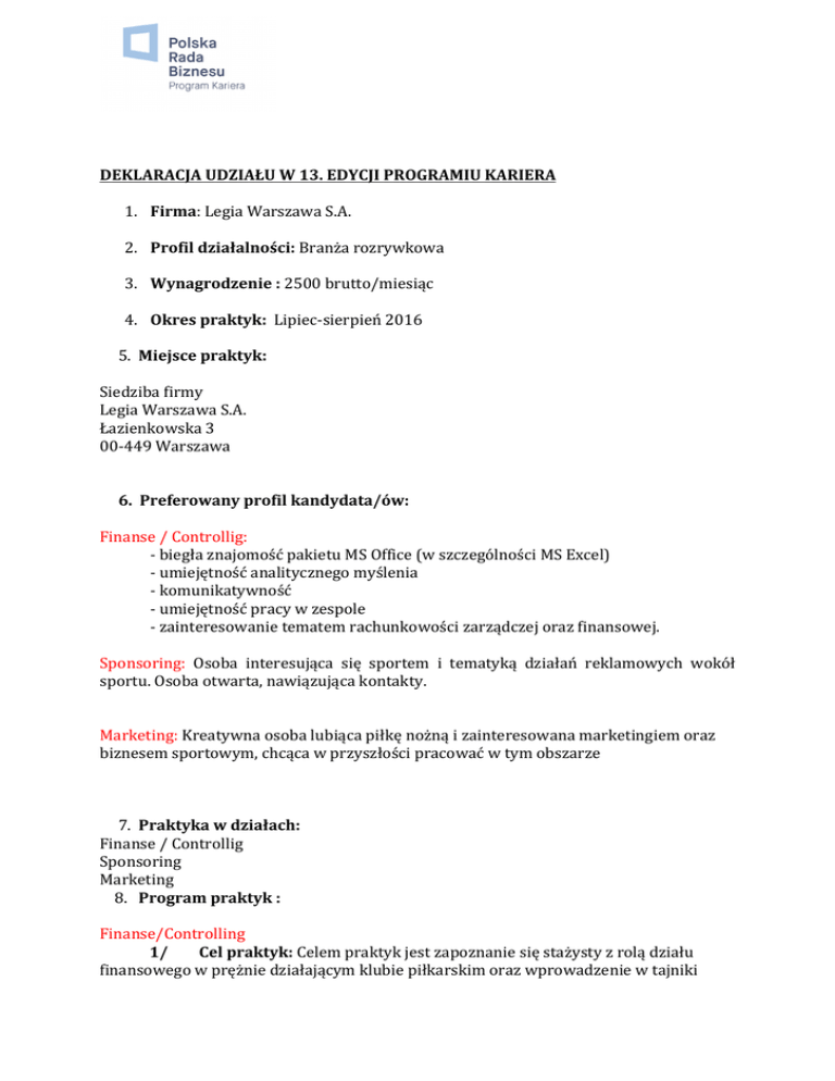 DEKLARACJA UDZIAŁU W 13. EDYCJI PROGRAMIU KARIERA 1. Firma: Legia Warszawa S.A. 2. Profil działalności: Branża rozrywkowa 3. Wynagrodzenie : 2500 brutto/miesiąc 4. Okres praktyk: Lipiec-‐sierpień 2016 5. Miejsce praktyk: Siedziba firmy Legia Warszawa S.A. Łazienkowska 3 00-‐449 Warszawa 6. Preferowany profil kandydata/ów: Finanse / Controllig: -‐ biegła znajomość pakietu MS Office (w szczególności MS Excel) -‐ umiejętność analitycznego myślenia -‐ komunikatywność -‐ umiejętność pracy w zespole -‐ zainteresowanie tematem rachunkowości zarządczej oraz finansowej. Sponsoring: Osoba interesująca się sportem i tematyką działań reklamowych wokół sportu. Osoba otwarta, nawiązująca kontakty. Marketing: Kreatywna osoba lubiąca piłkę nożną i zainteresowana marketingiem oraz biznesem sportowym, chcąca w przyszłości pracować w tym obszarze 7. Praktyka w działach: Finanse / Controllig Sponsoring Marketing 8. Program praktyk : Finanse/Controlling 1/ Cel praktyk: Celem praktyk jest zapoznanie się stażysty z rolą działu finansowego w prężnie działającym klubie piłkarskim oraz wprowadzenie w tajniki rachunkowości i informacji zarządczej. 2/ Zakres obowiązków: -‐ przygotowywanie raportów na potrzeby działu -‐ wsparcie działu przy codziennych obowiązkach -‐ wsparcie przy kontroli kosztów wydziałowych -‐ wsparcie przy tworzeniu prognoz przychodowych i kosztowych 3/ Opiekun praktyk: Maciej Tomczyk Sponsoring 1. Cel praktyk: Poznanie zasad obowiązujących w sponsoringu sportowym, strategii sponsoringowej, zasad ekspozycji sponsorów podczas meczów, zasad współpracy ze sponsorami. 2. Zakres obowiązków: -‐ Pomoc w egzekucji zapisów umów sponsorskich oraz wytycznych organizatora danych rozgrywek. -‐ Aktualizacja bazy danych Klientów. -‐ Research rynku potencjalnych sponsorów 3. Opiekun praktyk: Kornel Eljaszewicz Marketing 1. Cel praktyk: Nauka podstaw marketingu sportowego w praktyce 2. Zakres obowiązków: Tworzenie koncepcji i koordynacja projektów marketingowych pod nadzorem działu marketingu 3. Opiekun praktyk: Wiktor Cegła