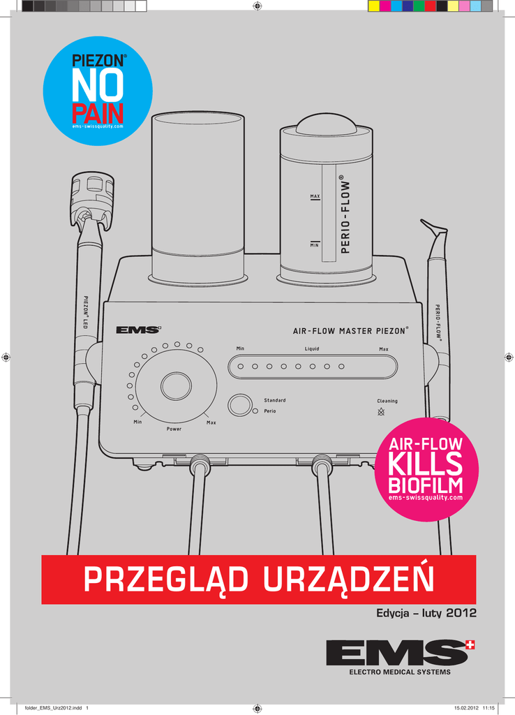 ORYGINALNA METODA AIR-FLOW ® URZÑDZENIA PRZEGLÑD URZÑDZE¡ folder_EMS_Urz2012.indd 1 15.02.2012 11:15 ORYGINALNA METODA AIR-FLOW ® URZÑDZENIA ® AIR-FLOW MASTER PIERWSZE NA ÂWIECIE URZÑDZENIE DO PROFILAKTYKI PODDZIÑS¸OWEJ > do zastosowań w leczeniu nad- i poddziąsłowym – dwa zastosowania w jednym urządzeniu > łatwe w obsłudze i w utrzymaniu czystości – unikatowy dotykowy panel sterujący, łatwa zmiana systemu aplikacji i idealna higiena SPECJALNY POJEMNIK NA PIASEK AIR-FLOW® PERIO ORYGINALNA METODA AIR-FLOW® > efektywne piaskowanie; niezawodne, szybkie i wydajne – komfortowe i bezstresowe dla pacjenta, bez wibracji oraz hałasu > delikatne wykorzystanie energii biokinetycznej – bez uszkodzenia nabłonka lub tkanki łącznej, bez zarysowań na powierzchni zębów ORYGINALNA METODA AIR-FLOW® PERIO > skuteczne usuwanie biofilmu nawet w najgłębszych kieszonkach periodontalnych, trwała redukcja bakterii – zapobiega utracie zęba (periodontitis) lub utracie implantu (periimplantitis) > jednolita, wirująca mieszanina powietrza i piasku oraz płukanie wodą dzięki opatentowanej dyszy PERIO-FLOW® – zapobiega emfizemie tkanki miękkiej > automatyczna informacja o zamontowaniu pojemnika do urządzenia > pojemność aż 45 g piasku AIR-FLOW® PERIO POJEMNIK NA PIASEK AIR-FLOW® CLASSIC I AIR-FLOW® SOFT > uniwersalny pojemnik na oba piaski o pojemności: – 100 g dla AIR-FLOW® CLASSIC – 65 g dla AIR-FLOW® SOFT DYSZA PIASKARKI AIR-FLOW® > do profilaktyki naddziąsłowej oraz w okolicach dziąsła > technologia free-flow – precyzyjny strumień mieszaniny piasku, powietrza i wody o dużej energii > sterylizowalna w temperaturze do 135°C DOTYKOWY PANEL STERUJÑCY > > > > obsługa poprzez dotknięcie jednego z trzech pól czytelna informacja dzięki niebieskim diodom LED płaski, bardzo łatwy w utrzymaniu czystości po raz pierwszy wprowadzony przez EMS KO¡CÓWKI PERIO-FLOW® DYSZA PERIO-FLOW® > do zabiegów poddziąsłowych, do dna głębokich kieszonek > do zabiegów poddziąsłowych > łatwy montaż jednorazowych końcówek PERIO-FLOW® > technologia free-flow – precyzyjny strumień mieszaniny piasku, periodontalnych > perfekcyjne usuwanie biofilmu, bezpieczne dla pacjenta: – trzy poziome otwory wypływu mieszaniny piasku i powietrza – jeden pionowy wylot wody > jednorazowe, z precyzyjną kontrolą głębokości powietrza i wody dostarczanej do końcówki PERIO-FLOW® > sterylizowalna w temperaturze do 135°C AIR-FLOW® handy Perio PIERWSZE MOBILNE URZÑDZENIE DO PROFILAKTYKI PODDZIÑS¸OWEJ > > > > folder_EMS_Urz2012.indd 2 piaskarka do piaskowania w kieszonkach periodontalnych podłączana do rękawa turbinowego unitu znakomita do zastosowań w profilaktyce implantów trwała redukcja bakterii, napięcia dziąseł i zmniejszenie głębokości kieszonek skuteczne polerowanie poddziąsłowe – wraz z masażem dziąseł 15.02.2012 11:15 ORYGINALNA METODA AIR-FLOW ® PERIO BIOFILM BIOFILM J BRUDNY ÂWIAT > Biofilm w symbiozie z różnorodnymi bakteriami – chronione z zewnątrz i rozmnażające się wewnątrz Biofilm w symbiozie z różnorodnymi bakteriami mikroorganizmy zajmują powierzchnię i rozrastają się – ich kolonia tworzy własną warstwę ochronną a następnie bakterie dzielą się i przenoszą się w inne miejsca. > Bakterie pod osłoną biofilmu są odporne na działanie leków. > Układ odpornościowy człowieka jest bezsilny – aby zapobiec rozprzestrzenianiu się bakterii niszczy własną tkankę kostną > Również implanty są wrażliwe na działanie biofilmu – w efekcie periimplantitis prowadzi do ich utraty. PROFILAKTYKA PODDZIÑS¸OWA J ZWALCZA BIOFILM Zastosowanie specjalistycznej piaskarki z końcowką PERIO-FLOW® i piasku AIR-FLOW® PERIO pozwoli dotrzeć do samego dna kieszonki. Piaskarka AIR-FLOW® PERIO z końcowką PERIO-FLOW® stosowana poddziąsłowo 3 poziome otwory wypływu mieszaniny powietrza i piasku 1 pionowy otwór wypływu wody DOWÓD NAUKOWY J PRZED J jasnoszare elementy są częścią biofilmu umiejscowionego w głębokiej kieszonce na powierzchni korzenia. Fotografie: prof. Dr. A. Mombelli, University of Geneva, Switzerland PO J leczenie z zastosowaniem oryginalnej metody AIR-FLOW® z końcówkami PERIO-FLOW® spowodowało usunięcie biofilmu. Powierzchnia korzenia jest czysta i gładka, aż do samego dna kieszonki periodontalnej. IMPLANTY J BEZ PROFILAKTYKI – NIETRAFIONA INWESTYCJA > Periimplantitis to periodontitis u pacjentów z implantami > Biofilm przywiera do implantów tytanowych prowadząc do infekcji periimplantitis, niszczenia kości utrzymującej i w konsekwencji do poluzowania a nawet utraty implantu > Regularna profilaktyka oryginalną metodą AIR-FLOW® jest skutecznym i potwierdzonym sposobem zapobiegania periimplantitis* i jego kosztownym skutkom PACJENT Z IMPLANTEM JEST I POZOSTANIE PACJENTEM * Zastosowanie oryginalnej metody AIR-FLOW® pozwala na odbudowanie biokompatybilności zainfekowanej, tytanowej powierzchni implantu. Optymalne właściwości abrazyjne piasku użytego na powierzchniach tytanowych powodują usunięcie biofilmu (99,9%) i najwyższej warstwy tlenku tytanu. Implant poluzowany na skutek zniszczenia tkanki kostnej folder_EMS_Urz2012.indd 3 Schwarz F., Ferrari D., Popovski K., Hartig B., Becker J. – Journal of Biomedical Materials Research, Part B (July 2008) Zdjęcia rentgenowskie Prof. Dr. Stefan Renvert, University of Kristianstad, Sweden 15.02.2012 11:15 ORYGINALNA METODA AIR-FLOW ® URZÑDZENIA AIR-FLOW® handy 2+ wyjàtkowo skuteczna R¢CZNA PIASKARKA NA R¢KAW TURBINOWY > konstrukcja dyszy, która: – zapewnia skuteczne usuwanie osadu przy niewielkim zużyciu piasku – minimalizuje jej zapychanie > ergonomiczny kształt, idealne wyważenie > obrotowa, sterylizowalna dysza 120° > duży zbiornik na piasek o pojemności 23 g – 14 minut ciągłej pracy ® AIR-FLOW S1 KLASYCZNA PIASKARKA PROFILAKTYCZNA ORYGINALNA METODA AIR-FLOW® Bakterie i mikroorgani