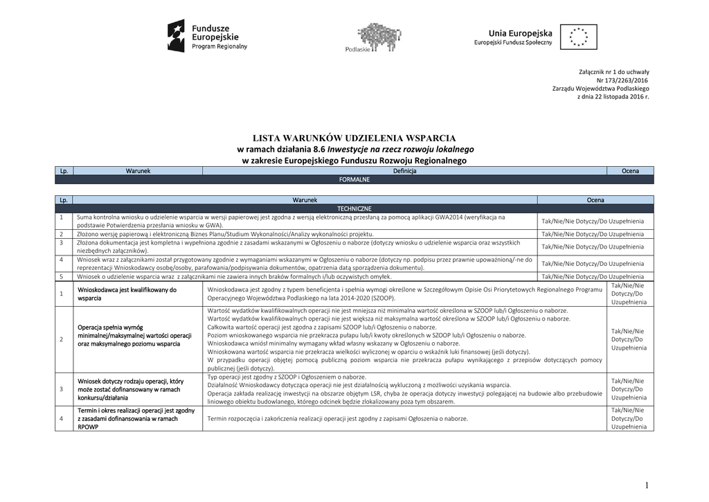 Załącznik nr 1 do uchwały Nr 173/2263/2016 Zarządu Województwa Podlaskiego z dnia 22 listopada 2016 r. LISTA WARUNKÓW UDZIELENIA WSPARCIA w ramach działania 8.6 Inwestycje na rzecz rozwoju lokalnego w zakresie Europejskiego Funduszu Rozwoju Regionalnego Lp. Warunek Definicja Ocena FORMALNE Lp. 1 2 3 4 5 1 2 Warunek TECHNICZNE Suma kontrolna wniosku o udzielenie wsparcia w wersji papierowej jest zgodna z wersją elektroniczną przesłaną za pomocą aplikacji GWA2014 (weryfikacja na podstawie Potwierdzenia przesłania wniosku w GWA). Złożono wersję papierową i elektroniczną Biznes Planu/Studium Wykonalności/Analizy wykonalności projektu. Złożona dokumentacja jest kompletna i wypełniona zgodnie z zasadami wskazanymi w Ogłoszeniu o naborze (dotyczy wniosku o udzielenie wsparcia oraz wszystkich niezbędnych załączników). Wniosek wraz z załącznikami został przygotowany zgodnie z wymaganiami wskazanymi w Ogłoszeniu o naborze (dotyczy np. podpisu przez prawnie upoważnioną/-ne do reprezentacji Wnioskodawcy osobę/osoby, parafowania/podpisywania dokumentów, opatrzenia datą sporządzenia dokumentu). Wniosek o udzielenie wsparcia wraz z załącznikami nie zawiera innych braków formalnych i/lub oczywistych omyłek. Wnioskodawca jest kwalifikowany do wsparcia Operacja spełnia wymóg minimalnej/maksymalnej wartości operacji oraz maksymalnego poziomu wsparcia 3 Wniosek dotyczy rodzaju operacji, który może zostać dofinansowany w ramach konkursu/działania 4 Termin i okres realizacji operacji jest zgodny z zasadami dofinansowania w ramach RPOWP Ocena Tak/Nie/Nie Dotyczy/Do Uzupełnienia Tak/Nie/Nie Dotyczy/Do Uzupełnienia Tak/Nie/Nie Dotyczy/Do Uzupełnienia Tak/Nie/Nie Dotyczy/Do Uzupełnienia Tak/Nie/Nie Dotyczy/Do Uzupełnienia Tak/Nie/Nie Wnioskodawca jest zgodny z typem beneficjenta i spełnia wymogi określone w Szczegółowym Opisie Osi Priorytetowych Regionalnego Programu Dotyczy/Do Operacyjnego Województwa Podlaskiego na lata 2014-2020 (SZOOP). Uzupełnienia Wartość wydatków kwalifikowalnych operacji nie jest mniejsza niż minimalna wartość określona w SZOOP lub/i Ogłoszeniu o naborze. Wartość wydatków kwalifikowalnych operacji nie jest większa niż maksymalna wartość określona w SZOOP lub/i Ogłoszeniu o naborze. Całkowita wartość operacji jest zgodna z zapisami SZOOP lub/i Ogłoszeniu o naborze. Tak/Nie/Nie Poziom wnioskowanego wsparcia nie przekracza pułapu lub/i kwoty określonych w SZOOP lub/i Ogłoszeniu o naborze. Dotyczy/Do Wnioskodawca wniósł minimalny wymagany wkład własny wskazany w Ogłoszeniu o naborze. Uzupełnienia Wnioskowana wartość wsparcia nie przekracza wielkości wyliczonej w oparciu o wskaźnik luki finansowej (jeśli dotyczy). W przypadku operacji objętej pomocą publiczną poziom wsparcia nie przekracza pułapu wynikającego z przepisów dotyczących pomocy publicznej (jeśli dotyczy). Typ operacji jest zgodny z SZOOP i Ogłoszeniem o naborze. Tak/Nie/Nie Działalność Wnioskodawcy dotycząca operacji nie jest działalnością wykluczoną z możliwości uzyskania wsparcia. Dotyczy/Do Operacja zakłada realizację inwestycji na obszarze objętym LSR, chyba że operacja dotyczy inwestycji polegającej na budowie albo przebudowie Uzupełnienia liniowego obiektu budowlanego, którego odcinek będzie zlokalizowany poza tym obszarem. Tak/Nie/Nie Termin rozpoczęcia i zakończenia realizacji operacji jest zgodny z zapisami Ogłoszenia o naborze. Dotyczy/Do Uzupełnienia 1 5 Grupa docelowa spełnia warunki konkursu/działania Grupa docelowa jest zgodna z katalogiem grup docelowych wskazanych w SZOOP. Grupa docelowa/ostateczni odbiorcy wparcia zamieszkują obszar LSR. 6 Operacja spełnia dodatkowe warunki udzielenia wsparcia (jeśli dotyczy) Operacja spełnia dodatkowe warunki udzielenia wsparcia, które zostały wskazane w Ogłoszeniu o naborze. Lp. Warunek 1 Spójność informacji wykazanych w dokumentacji aplikacyjnej 2 Uzasadnienie potrzeby realizacji operacji 3 Kwalifikowalność wydatków 4 Wykonalność techniczna operacji 5 Wykonalność finansowa operacji 6 Trwałość operacji 7 Zgodność operacji z zasadami horyzontalnymi 8 Pomoc publiczna (jeśli dotyczy) Definicja MERYTORYCZNE Informacje niezbędne do dokonania oceny operacji i sposobu jej realizacji zawarte w złożonej dokumentacji są jednoznaczne i spójne. Informacje zawarte we wniosku i załącznikach umożliwiają dokonanie oceny w ramach wymaganych kryteriów merytorycznych. Wnioskodawca wiarygodnie uzasadnił konieczność realizacji operacji. Wnioskodawca wykazał związek celów operacji z celami osi/działania i dokumentami strategicznymi. Operacja jest zgodna z celem(-ami) określonym(-nymi) w RPOWP 2014-2020, a jej realizacja pozwoli na osiągnięcie zakładanych wskaźników. Wnioskodawca wiarygodnie uzasadnił potrzebę finansowania operacji środkami publicznymi. Wskazane wydatki kwalifikowane operacji są zgodne z zasadami finansowania operacji w ramach działania/konkursu. Wskazane wydatki kwalifikowane operacji są precyzyjnie określone - są identyfikowalne i wystarczająco szczegółowe. Wydatki kwalifikowalne operacji zostały oszacowane w sposób wiarygodny oraz są racjonalne i niezbędne do realizacji celów operacji. Koszty kwalifikowalne operacji nie są współfinansowane w drodze wkładu z funduszy strukturalnych, Funduszu Spójności lub jakiegokolwiek innego unijnego instrumentu finansowego. Planowany zakres i warunki stosowania cross-financingu są zgodne z zapisami SZOOP (jeśli dotyczy). Wnioskodawca posiada niezbędne prawa własności, pozwolenia, decyzje OOŚ, licencje itp. niezbędne do realizacji operacji (jeśli dotyczy). Wnioskodawca uprawdopodobnił uzyskanie odpowiednich praw, pozwoleń, licencji itp. (dotyczy ich braku na etapie aplikowania) (jeśli dotyczy). Wnioskodawca posiada odpowiednie zasoby techniczne i ludzkie niezbędne do prawidłowej realizacji operacji (jeśli dotyczy). Wnioskodawca wiarygodnie op