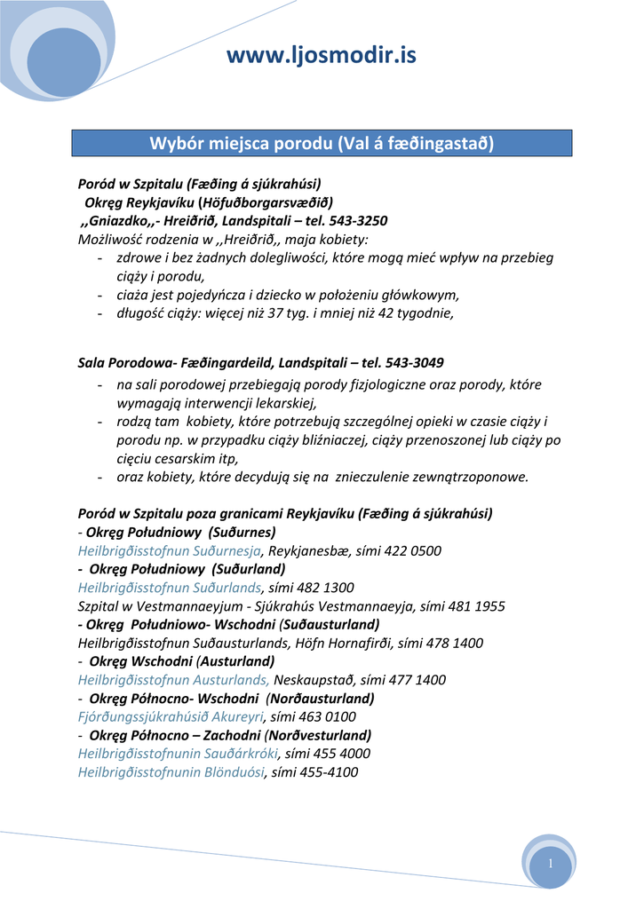 www.ljosmodir.is Wybór miejsca porodu (Val á fæðingastað) Poród w Szpitalu (Fæðing á sjúkrahúsi) Okręg Reykjavíku (Höfuðborgarsvæðið) ,,Gniazdko,,- Hreiðrið, Landspitali – tel. 543-3250 Możliwośd rodzenia w ,,Hreiðrið,, maja kobiety: - zdrowe i bez żadnych dolegliwości, które mogą mied wpływ na przebieg ciąży i porodu, - ciaża jest pojedyocza i dziecko w położeniu główkowym, - długośd ciąży: więcej niż 37 tyg. i mniej niż 42 tygodnie, Sala Porodowa- Fæðingardeild, Landspitali – tel. 543-3049 - na sali porodowej przebiegają porody fizjologiczne oraz porody, które wymagają interwencji lekarskiej, - rodzą tam kobiety, które potrzebują szczególnej opieki w czasie ciąży i porodu np. w przypadku ciąży bliźniaczej, ciąży przenoszonej lub ciąży po cięciu cesarskim itp, - oraz kobiety, które decydują się na znieczulenie zewnątrzoponowe. Poród w Szpitalu poza granicami Reykjavíku (Fæðing á sjúkrahúsi) - Okręg Południowy (Suðurnes) Heilbrigðisstofnun Suðurnesja, Reykjanesbæ, sími 422 0500 - Okręg Południowy (Suðurland) Heilbrigðisstofnun Suðurlands, sími 482 1300 Szpital w Vestmannaeyjum - Sjúkrahús Vestmannaeyja, sími 481 1955 - Okręg Południowo- Wschodni (Suðausturland) Heilbrigðisstofnun Suðausturlands, Höfn Hornafirði, sími 478 1400 - Okręg Wschodni (Austurland) Heilbrigðisstofnun Austurlands, Neskaupstað, sími 477 1400 - Okręg Północno- Wschodni (Norðausturland) Fjórðungssjúkrahúsið Akureyri, sími 463 0100 - Okręg Północno – Zachodni (Norðvesturland) Heilbrigðisstofnunin Sauðárkróki, sími 455 4000 Heilbrigðisstofnunin Blönduósi, sími 455-4100 1 www.ljosmodir.is - Okręg Północny (Vestfirðir) Heilbrigðisstofnunin Ísafjarðarbæ, sími 450 4500 Heilbrigðisstofnunin Patreksfirði, sími 450 2000 - Okręg Zachodni (Vesturland) Heilbrigðisstofnunin Akranesi, sími 430 6000 Kobiety powinny zadecydowad o miejscu porodu do ok. 37 tyg. ciąży. Położna prowadząca ciążę powinna poinformowad ciężarną czy poród może obyd się w ,,Gniazdku,,. Jeżeli tak jest, to w przypadku rozpoczęcia się porodu można zadzwonid bezpośrednio do Gnizadka (Hreiðrið). Kobiety, które są pod specjalną opieką w czasie ciąży, powinny skontaktowad się, w razie rozpoczęcia się porodu z położnymi na Sali Porodowej. Szpital w Reykjaviku nie jest jedynym miejscem porodu dla tych ciężarnych, które mieszkają na terenie Reykjaviku. Kobiety te mają również możliwośd rodzid w Keflaviku, Selfoss i Akranes. Możliwe jest obejrzenie oddziału w Reykjavíku oraz oddziałów porodowych poza Reyjavikiem. Jeżeli jesteście zainteresowani porodem w domu proszę powiadomid waszą położną, która wam doradzi w jaki sposób trzeba to zorganizowad. 2