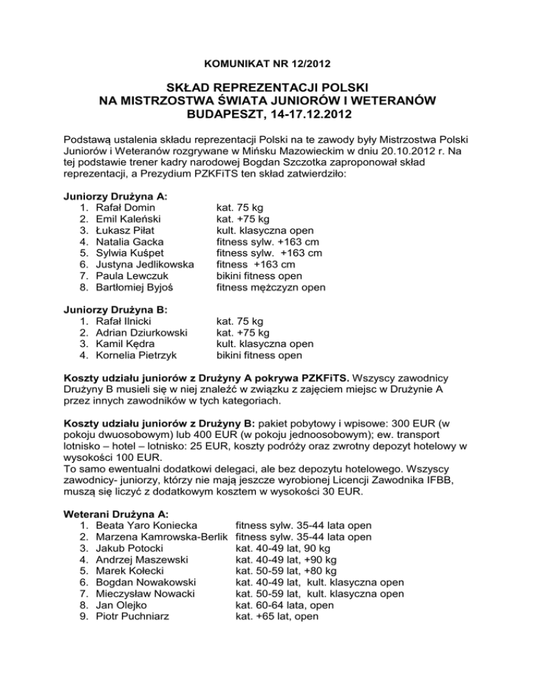 KOMUNIKAT NR 12/2012 SKŁAD REPREZENTACJI POLSKI NA MISTRZOSTWA ŚWIATA JUNIORÓW I WETERANÓW BUDAPESZT, 14-17.12.2012 Podstawą ustalenia składu reprezentacji Polski na te zawody były Mistrzostwa Polski Juniorów i Weteranów rozgrywane w Mińsku Mazowieckim w dniu 20.10.2012 r. Na tej podstawie trener kadry narodowej Bogdan Szczotka zaproponował skład reprezentacji, a Prezydium PZKFiTS ten skład zatwierdziło: Juniorzy Drużyna A: 1. Rafał Domin 2. Emil Kaleński 3. Łukasz Piłat 4. Natalia Gacka 5. Sylwia Kuśpet 6. Justyna Jedlikowska 7. Paula Lewczuk 8. Bartłomiej Byjoś kat. 75 kg kat. +75 kg kult. klasyczna open fitness sylw. +163 cm fitness sylw. +163 cm fitness +163 cm bikini fitness open fitness mężczyzn open Juniorzy Drużyna B: 1. Rafał Ilnicki 2. Adrian Dziurkowski 3. Kamil Kędra 4. Kornelia Pietrzyk kat. 75 kg kat. +75 kg kult. klasyczna open bikini fitness open Koszty udziału juniorów z Drużyny A pokrywa PZKFiTS. Wszyscy zawodnicy Drużyny B musieli się w niej znaleźć w związku z zajęciem miejsc w Drużynie A przez innych zawodników w tych kategoriach. Koszty udziału juniorów z Drużyny B: pakiet pobytowy i wpisowe: 300 EUR (w pokoju dwuosobowym) lub 400 EUR (w pokoju jednoosobowym); ew. transport lotnisko – hotel – lotnisko: 25 EUR, koszty podróży oraz zwrotny depozyt hotelowy w wysokości 100 EUR. To samo ewentualni dodatkowi delegaci, ale bez depozytu hotelowego. Wszyscy zawodnicy- juniorzy, którzy nie mają jeszcze wyrobionej Licencji Zawodnika IFBB, muszą się liczyć z dodatkowym kosztem w wysokości 30 EUR. Weterani Drużyna A: 1. Beata Yaro Koniecka 2. Marzena Kamrowska-Berlik 3. Jakub Potocki 4. Andrzej Maszewski 5. Marek Kołecki 6. Bogdan Nowakowski 7. Mieczysław Nowacki 8. Jan Olejko 9. Piotr Puchniarz fitness sylw. 35-44 lata open fitness sylw. 35-44 lata open kat. 40-49 lat, 90 kg kat. 40-49 lat, +90 kg kat. 50-59 lat, +80 kg kat. 40-49 lat, kult. klasyczna open kat. 50-59 lat, kult. klasyczna open kat. 60-64 lata, open kat. +65 lat, open Weterani Drużyna B: 1. Marek Dąbrowski 2. Artur Śliczny 3. Zbigniew Bartos 4. Waldemar Godlewski kat. 50-59 lat, kult. klasyczna open kat. 40-49 lat, kult. klasyczna open kat. +65 lat, open kat. 40-49 lat, kult. klasyczna open Wszyscy zawodnicy-weterani z Drużyny B znaleźli się w niej, ponieważ miejsca w Drużynie A zostały obsadzone przez innych zawodników z tych kategorii. Koszty udziału weteranów z Drużyny A: wpisowe w wysokości 200 EUR, ew. transport lotnisko – hotel – lotnisko: 25 EUR, koszty podróży oraz zwrotny depozyt hotelowy w wysokości 100 EUR. Koszty udziału weteranów z Drużyny B: pakiet pobytowy i wpisowe: 300 EUR (w pokoju dwuosobowym) lub 400 EUR (w pokoju jednoosobowym); ew. transport lotnisko – hotel – lotnisko: 25 EUR, koszty podróży oraz zwrotny depozyt hotelowy w wysokości 100 EUR. Wszyscy zawodnicy- weterani, którzy nie mają jeszcze wyrobionej Licencji Zawodnika IFBB, muszą się liczyć z dodatkowym kosztem w wysokości 30 EUR. Skład Drużyn A i B juniorów został już ostatecznie ustalony. Skład Drużyn A i B weteranów jest nadal otwarty. Jeśli ktoś z weteranów chciałby się jeszcze dopisać do Drużyny A (jedynie w jeszcze nieobsadzonych kategoriach) lub do Drużyny B, nadal jest możliwe. Dodatkowe informacje: - Strefa czasowa: ta sama, co w Polsce. - Waluta: Forint Węgierski (HUF), 100 HUF = 1,51 PLN (początek listopada). 1 EUR = 282 HUF. - Klimat: 0 – 20C w dzień. - Sieć elektryczna: 220 V, 50 Hz (jak w Polsce). Gniazdka i wtyczki – jak w Polsce. Oficjalny hotel: Danubis Hotel Arena****, 1148 Budapest, Ifjúság útja 1-3. Hala zawodów: Millenáris Teátrum (Bud. E), 1024 Budapest, Kis Rókus utca 16-20. www.millenaris.hu PROGRAM MISTRZOSTW: 14.12.2012 (piątek): - Do godz. 17:00 - Przyjazdy ekip, zakwaterowanie (Danubis Hotel Arena) - 17:00 - Narada Techniczna (Danubis Hotel Arena) - 18:30 – Ważenie, mierzenie i weryfikacja zawodników (Danubis Hotel Arena) - 19:00 – 22:30 - Kolacja 15.12.2012 (sobota): - 07:00 – 10:00 - Śniadanie - 10:00 – 13:30 - Eliminacje, półfinały i finały – część I (Millenáris Teátrum) - 13:00 – 15:00 – Obiad - 14:00 – 20:00 - Eliminacje, półfinały i finały – część II (Millenáris Teátrum) - 19:00 – 22:00 - Kolacja 16.12.2012 (niedziela): - 07:00 – 10:00 – Śniadanie - 10:00 – 13:30 - Eliminacje, półfinały i finały – część III (Millenáris Teátrum) - 13:00 – 15:00 – Obiad - 14:00 – 19:00 - Eliminacje, półfinały i finały – część IV (Millenáris Teátrum) - 20:30 – 23:00 - Bankiet pożegnalny. 11.11.2012 (niedziela): - 07:00 – 10:00 – Śniadanie - Wyjazdy Plan podróży reprezentacji Polski: Jeszcze nie został ustalony. Rozważane są wersje: lotnicza i autokarowa. Dlatego wszystkich juniorów z Drużyny B oraz weteranów z Drużyn A i B prosimy o pilny kontakt z Biurem PZKFiTS celem potwierdzenia swojego udziału lub rezygnacji.