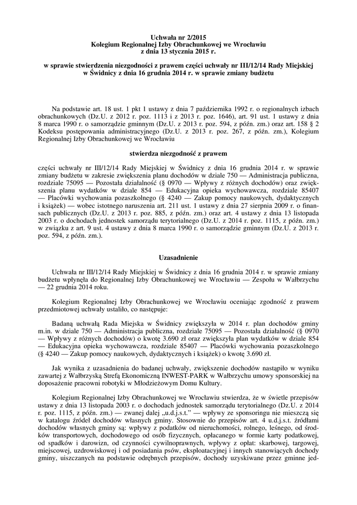 Uchwałanr2/2015 KolegiumRegionalnejIzbyObrachunkowejweWrocławiu zdnia13stycznia2015r. wsprawiestwierdzenianiezgodnościzprawemczęściuchwałynrIII/12/14RadyMiejskiej wŚwidnicyzdnia16grudnia2014r.wsprawiezmianybudżetu Napodstawieart.18ust.1pkt1ustawyzdnia7października1992r.oregionalnychizbach obrachunkowych (Dz.U. z 2012 r. poz. 1113 i z 2013 r. poz. 1646), art. 91 ust. 1 ustawy z dnia 8marca1990r.osamorządziegminnym(Dz.U.z2013r.poz.594,zpóźn.zm.)orazart.158§2 Kodeksu postępowania administracyjnego (Dz.U. z 2013 r. poz. 267, z późn. zm.), Kolegium RegionalnejIzbyObrachunkowejweWrocławiu stwierdzaniezgodnośćzprawem części uchwały nr III/12/14 Rady Miejskiej w Świdnicy z dnia 16 grudnia 2014 r. w sprawie zmianybudżetuwzakresiezwiększeniaplanudochodówwdziale750—Administracjapubliczna, rozdziale 75095 — Pozostała działalność (§ 0970 — Wpływy z różnych dochodów) oraz zwiększenia planu wydatków w dziale 854 — Edukacyjna opieka wychowawcza, rozdziale 85407 — Placówki wychowania pozaszkolnego (§ 4240 — Zakup pomocy naukowych, dydaktycznych iksiążek)—wobecistotnegonaruszeniaart.211ust.1ustawyzdnia27sierpnia2009r.ofinansach publicznych (Dz.U. z 2013 r. poz. 885, z późn. zm.) oraz art. 4 ustawy z dnia 13 listopada 2003r.odochodachjednosteksamorząduterytorialnego(Dz.U.z2014r.poz.1115,zpóźn.zm.) wzwiązkuzart.9ust.4ustawyzdnia8marca1990r.osamorządziegminnym(Dz.U.z2013r. poz.594,zpóźn.zm.). Uzasadnienie UchwałanrIII/12/14RadyMiejskiejwŚwidnicyzdnia16grudnia2014r.wsprawiezmiany budżetu wpłynęła do Regionalnej Izby Obrachunkowej we Wrocławiu — Zespołu w Wałbrzychu —22grudnia2014roku. Kolegium Regionalnej Izby Obrachunkowej we Wrocławiu oceniając zgodność z prawem przedmiotowejuchwałyustaliło,conastępuje: Badaną uchwałą Rada Miejska w Świdnicy zwiększyła w 2014 r. plan dochodów gminy m.in. w dziale 750 — Administracja publiczna, rozdziale 75095 — Pozostała działalność (§ 0970 — Wpływy z różnych dochodów) o kwotę 3.690 zł oraz zwiększyła plan wydatków w dziale 854 — Edukacyjna opieka wychowawcza, rozdziale 85407 — Placówki wychowania pozaszkolnego (§4240—Zakuppomocynaukowych,dydaktycznychiksiążek)okwotę3.690zł. Jak wynika z uzasadnienia do badanej uchwały, zwiększenie dochodów nastąpiło w wyniku zawartejzWałbrzyskąStrefąEkonomicznąINWEST-PARKwWałbrzychuumowysponsorskiejna doposażeniepracownirobotykiwMłodzieżowymDomuKultury. KolegiumRegionalnejIzbyObrachunkowejweWrocławiustwierdza,żewświetleprzepisów ustawyzdnia13listopada2003r.odochodachjednosteksamorząduterytorialnego(Dz.U.z2014 r.poz.1115,zpóźn.zm.)—zwanejdalej„u.d.j.s.t.”—wpływyzesponsoringuniemieszcząsię w katalogu źródeł dochodów własnych gminy. Stosownie do przepisów art. 4 u.d.j.s.t. źródłami dochodów własnych gminy są: wpływy z podatków od nieruchomości, rolnego, leśnego, od środków transportowych, dochodowego od osób fizycznych, opłacanego w formie karty podatkowej, od spadków i darowizn, od czynności cywilnoprawnych, wpływy z opłat: skarbowej, targowej, miejscowej,uzdrowiskowejiodposiadaniapsów,eksploatacyjnejiinnychstanowiącychdochody gminy, uiszczanych na podstawie odrębnych przepisów, dochody uzyskiwane przez gminne jed- 2 nostki budżetowe oraz wpłaty od gminnych zakładów budżetowych, dochody z majątku gminy, spadki, zapisy i darowizny na rzecz gminy, dochody z kar pieniężnych i grzywien określonych w odrębnych przepisach, 5% dochodów uzyskiwanych na rzecz budżetu państwa w związku z realizacją zadań z zakresu administracji rządowej oraz innych zadań zleconych ustawami, jeśli odrębneprzepisyniestanowiąinaczej,dotacjezbudżetówinnychjednosteksamorząduterytorialnego orazinnedochodynależnegminienapodstawieodrębnychprzepisów. Azatemustawodawcaściśleokreśliłzasadyfinansowaniagmin,określającprecyzyjnieźródła ich finansowania (art. 3 i 4 u.d.j.s.t.). W świetle powyższego nie ma możliwości zaplanowania środków z tytułu sponsoringu na podstawie ustawy o dochodach jednostek samorządu terytorialnego,adochodówztegotytułunieprzewidująodrębneustawy. Biorąc pod uwagę określone przez ustawodawcę źródła finansowania gminy oraz fakt, że środkizesponsoringuniemieszcząsięwichkatalogu,KolegiumRegionalnejIzbyObrachunkowej weWrocławiustwierdziło,żezwiększeniedochodówbudżetuGminyŚwidnicaośrodkizesponsoringu pozostaje również w sprzeczności z art. 211 ust. 1 u.d.j.s.t. Kolegium uznało bowiem, że w budżecie mogą być zaplanowane jedynie te dochody, których pozyskiwanie jest zgodne z obowiązującymprawem. Kolegium zauważa, że w literaturze przedmiotu umowa sponsoringu to umowa nienazwana, czyli nieregulowana wprost przez przepisy kodeksu cywilnego, mogąca występować w obrocie gospodarczym dzięki obowiązywaniu w polskim prawie cywilnym zasady swobody zawierania i kształtowania umów. Sponsoring oznacza odpłatne przysporzenie majątkowe wyrażające się w pieniądzach, rzeczach lub usługach dokonywanych przez określony podmiot gospodarczy (sponsora) na rzecz wybranej osoby fizycznej, organizacji, instytucji lub innej struktury prawnej (sponsorowanego). Celem tego przysporzenia jest dokonanie przez sponsorowanego czynności wskazanych w umowie sponsoringu zmierzających do utrwalenia lub spotęgowania renomy sponsora, do wzrostu jego popularności w określonym środowisku społecznym i do zwiększenia jego zysków.Sponsoringniejestzatemczynnościąjednostronnąukierunkowanąnaosiągnięciekorzyści jedynie przez sponsorowanego (jak w przypadku darowizny). Sponsoring jest zatem narzędziem komunikacji sponsora z określoną grupą odbiorców, za pośrednictwem sponsorowanego. Celem sponsorowania jest kształtowanie wizerunku sponsora, jego pozytywnego postrzegania przez odbiorców,wzrostspołecznegoprestiżu.Finansującspołecznieakceptowanecele,sponsoroddziałuje na konsumenta pośrednio, nie przez produkt, lecz