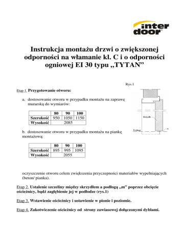 Instrukcja montażu drzwi o zwiększonej odporności na włamanie kl. C i o odporności ogniowej EI 30 typu „TYTAN” Rys.1 Etap 1. Przygotowanie otworu: a. dostosowanie otworu w przypadku montażu na zaprawę murarską do wymiarów: 80 90 100 Szerokość 950 1050 1150 2085 Wysokość b. dostosowanie otworu w przypadku montażu na piankę montażową: 80 90 100 Szerokość 895 995 1095 2055 Wysokość oczyszczenie otworu celem zwiększenia przyczepności materiałów wypełniających (beton/ pianka). Etap 2. Ustalenie szczeliny między skrzydłem a podłogą „m” poprzez obcięcie ościeżnicy, bądź zagłębienie jej w podłodze (rys.1) Etap 3. Wstawienie ościeżnicy i ustawienie w pionie i poziomie. Etap 4. Zakotwiczenie ościeżnicy od strony zawiasowej dołączonymi dyblami. Etap 5. Zawieszenie skrzydła i spasowanie krawędzi skrzydła z krawędzią ościeżnicy po stronie zamkowej. Szczelina pomiędzy ostatecznie wykończoną posadzką, a skrzydłem powinna wynosić od 5 do 7 mm. Sprawdzenie ustawienia ościeżnicy i przylegania do niej skrzydła oraz poprawności funkcjonowania zamka Etap 6. Zakotwiczenie ościeżnicy od strony zamkowej. Etap 7. Wypełnienie szczeliny między ościeżnicą a murem zaprawą murarską lub pianką montażową PYROPLEX (AT – 15-5473/2002), ZWALUN DBS 9802-PUR/NBS ( AT- 15-5554/2002) lub PROMAFOAM – C (AT – 15- 5548/2003).W celu uzyskania danej akustyki należy dokładnie wypełnić szczelinę pomiędzy murem a ościeżnicą. Pozostawić rozpórki na czas zalecany przez producenta pianki. Rys.2 Beton/Pianka Etap 8. Obróbka wykończeniowa (ze względu na dużą agresywność korozyjną, nie zaleca się stosowania zapraw na bazie gipsu czy samego gipsu).