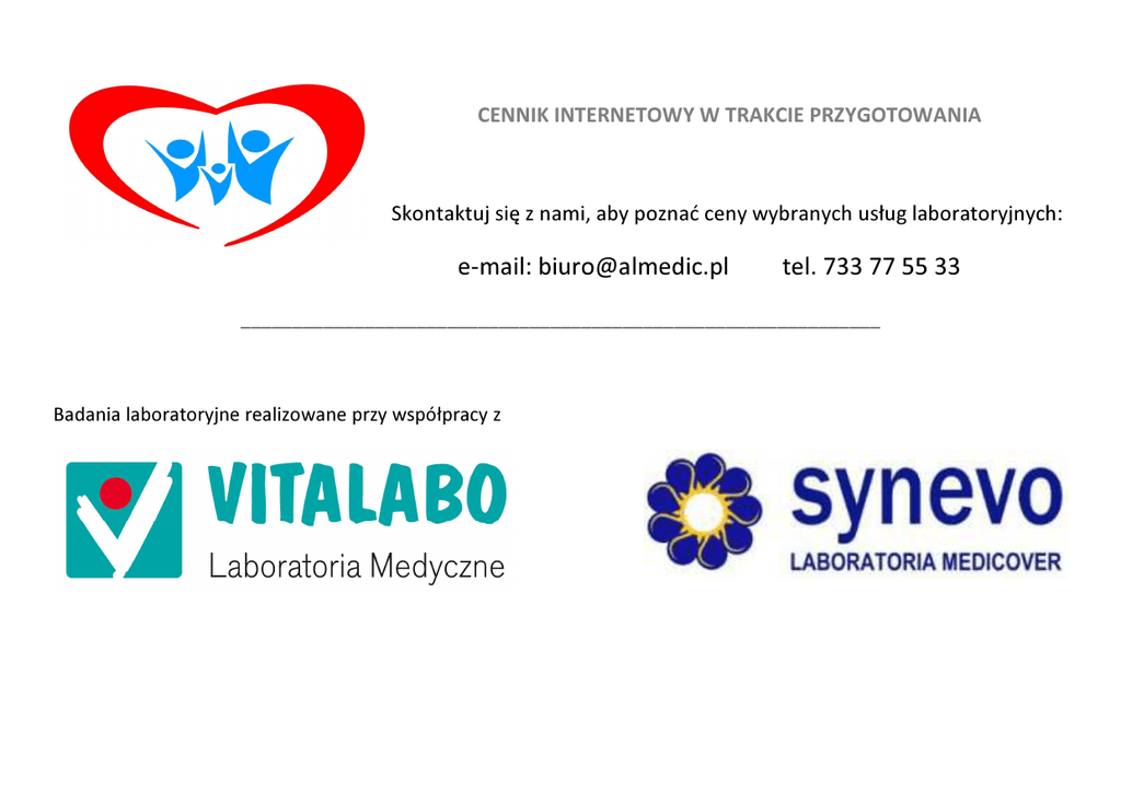CENNIK INTERNETOWY W TRAKCIE PRZYGOTOWANIA Skontaktuj się z nami, aby poznać ceny wybranych usług laboratoryjnych: e-mail: [email protected] tel. 733 77 55 33 ______________________________________________________________ Badania laboratoryjne realizowane przy współpracy z