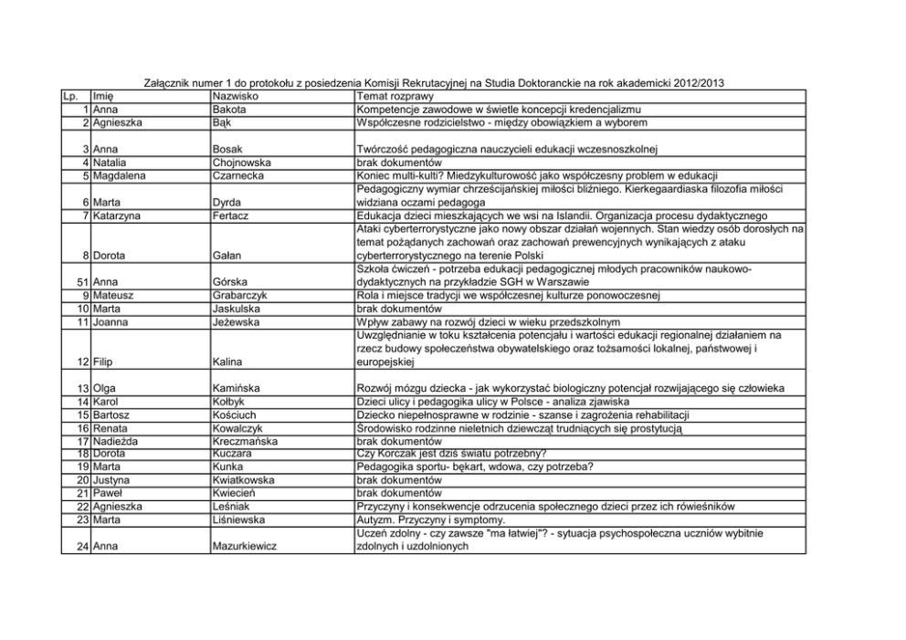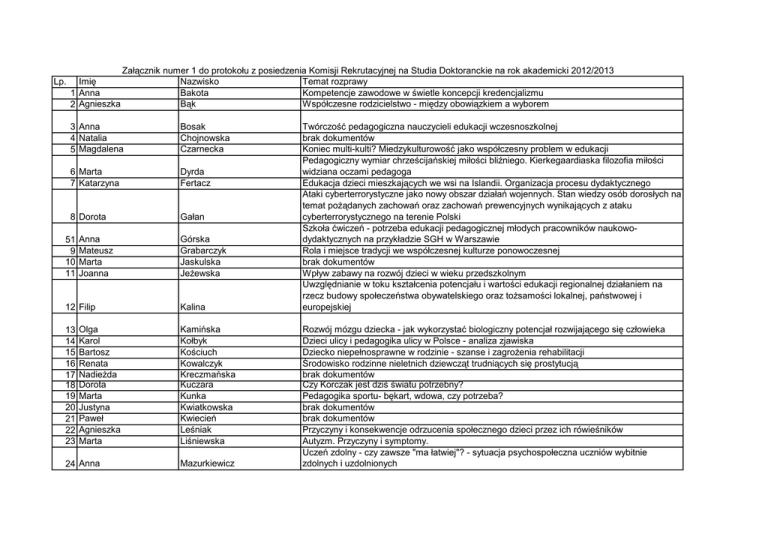 Lp. Imię 1 Anna 2 Agnieszka Załącznik numer 1 do protokołu z posiedzenia Komisji Rekrutacyjnej na Studia Doktoranckie na rok akademicki 2012/2013 Nazwisko Temat rozprawy Bakota Kompetencje zawodowe w świetle koncepcji kredencjalizmu Bąk Współczesne rodzicielstwo - między obowiązkiem a wyborem 3 Anna 4 Natalia 5 Magdalena Bosak Chojnowska Czarnecka 6 Marta 7 Katarzyna Dyrda Fertacz 8 Dorota Gałan 51 9 10 11 Anna Mateusz Marta Joanna 12 Filip 13 14 15 16 17 18 19 20 21 22 23 Olga Karol Bartosz Renata Nadieżda Dorota Marta Justyna Paweł Agnieszka Marta 24 Anna Górska Grabarczyk Jaskulska Jeżewska Kalina Kamińska Kołbyk Kościuch Kowalczyk Kreczmańska Kuczara Kunka Kwiatkowska Kwiecień Leśniak Liśniewska Mazurkiewicz Twórczość pedagogiczna nauczycieli edukacji wczesnoszkolnej brak dokumentów Koniec multi-kulti? Miedzykulturowość jako współczesny problem w edukacji Pedagogiczny wymiar chrześcijańskiej miłości bliźniego. Kierkegaardiaska filozofia miłości widziana oczami pedagoga Edukacja dzieci mieszkających we wsi na Islandii. Organizacja procesu dydaktycznego Ataki cyberterrorystyczne jako nowy obszar działań wojennych. Stan wiedzy osób dorosłych na temat pożądanych zachowań oraz zachowań prewencyjnych wynikających z ataku cyberterrorystycznego na terenie Polski Szkoła ćwiczeń - potrzeba edukacji pedagogicznej młodych pracowników naukowodydaktycznych na przykładzie SGH w Warszawie Rola i miejsce tradycji we współczesnej kulturze ponowoczesnej brak dokumentów Wpływ zabawy na rozwój dzieci w wieku przedszkolnym Uwzględnianie w toku kształcenia potencjału i wartości edukacji regionalnej działaniem na rzecz budowy społeczeństwa obywatelskiego oraz tożsamości lokalnej, państwowej i europejskiej Rozwój mózgu dziecka - jak wykorzystać biologiczny potencjał rozwijającego się człowieka Dzieci ulicy i pedagogika ulicy w Polsce - analiza zjawiska Dziecko niepełnosprawne w rodzinie - szanse i zagrożenia rehabilitacji Środowisko rodzinne nieletnich dziewcząt trudniących się prostytucją brak dokumentów Czy Korczak jest dziś światu potrzebny? Pedagogika sportu- bękart, wdowa, czy potrzeba? brak dokumentów brak dokumentów Przyczyny i konsekwencje odrzucenia społecznego dzieci przez ich rówieśników Autyzm. Przyczyny i symptomy. Uczeń zdolny - czy zawsze "ma łatwiej"? - sytuacja psychospołeczna uczniów wybitnie zdolnych i uzdolnionych 25 Grzegorz Milczarczyk 26 Magdalena 27 Michał Milczewska Mroczek 28 Katarzyna Panejko-Wanat 29 Joanna Parol 30 Katarzyna Pawłowska 31 Rafał Pląsek 32 Wiktoria 33 Karolina Pleban Ptasznik 34 Katarzyna Rogowska 35 Dorota Sidor 36 50 37 38 Marta Jakub Emilia Katarzyna Sitkiewicz Sokolnicki Solnica Stawska 39 40 41 42 43 44 45 Hanna Adam Łukasz Joanna Agnieszka Weronika Magdalena Szczygieł Szmichowski Szydlik Tomiak Tys Uchowicz Zaborowska 46 Jolanta 47 Maria 48 Justyna Zajkiewicz Zielińska Żak Drama jako metoda pedagogiczna w rozwiązywaniu konfliktów i pokonywaniu trudności Rozwijanie pojęć matematycznych u dzieci w wieku przedszkolnym przy zastosowaniu metody projektów badawczych Aktywność turystyczna niepełnosprawnych mieszkańców powiatu nyskiego Wpływ wczesnej edukacji matematyczno-przyrodniczej na późniejsze wyniki w nauce z przedmiotów humanistycznych "Opowiedzieć ludzką historię"-poszerzanie granic literatury i istnienia w twórczości Stanisława Lema Alternatywne rozwiązania w zakresie nauczania przyrody na etapie edukacji wczesnoszkolnej z zastosowaniem gier dydaktycznych Dyskursy wewnątrzszkolne. Konstruowanie wiedzy o szkole oraz zachowaniach szkolnych normalność i dewiacja w relacjach uczniów i nauczycieli System edukacyjny w Pakistanie: struktura, ocena funkcjonowa i mozliwości przeprowadzania reform Programy i metody edukacji dzieci i młodzieży o ich prawach oraz obowiązkach Wpływ współczesnych programów telewizyjnych dla dzieci na rozwój ich podstawowych funkcji umysłowych Indywidualizacja w personalizacja procesu kształcenia w kształceniu zdalnym z wykorzystaniem Internetu Filmy dotyczące praw człowieka jako narzędzie edukacyjne na przykładzie działalnosci festiwali filmowych oraz kół szkolnych Monitoring losów zawodowych absolwentów szkół wyższych Elementy indoktrynacji w podręcznikach i wypisach do j.polskiego w latach 1944-48 Specyficzne trudności w nauce czytania i pisania Książka - uczy, bawi czy zarabia? Przegląd w oparciu o wybrane pozycje współczesnej literatury dziecięcej i młodzieżowej brak dokumentów Wkład filozofii personalistycznej w myśl o wychowaniu Działaczki i słuchaczki. O aktywnosci kobiet przechodzacych na emeryturę Wychowanie patriotyczne w ujęciu S. Sempałowskiej ProAna jako zjawisko propagowania anoreksji w sieci internetowej Młodzież i miasto - między partycypacją a wykluczeniem Wychowanie w nowoczesnych modelach rodziny i ich wpływ na wybory życiowe pokolenia XXI wieku Pedagogiczne przyczyny i uwarunkowania uzależnienia od narkotyków "Ja" w perspektywie świata muzealnych przedmiotów 49 Joanna Żelek brak dokumentów