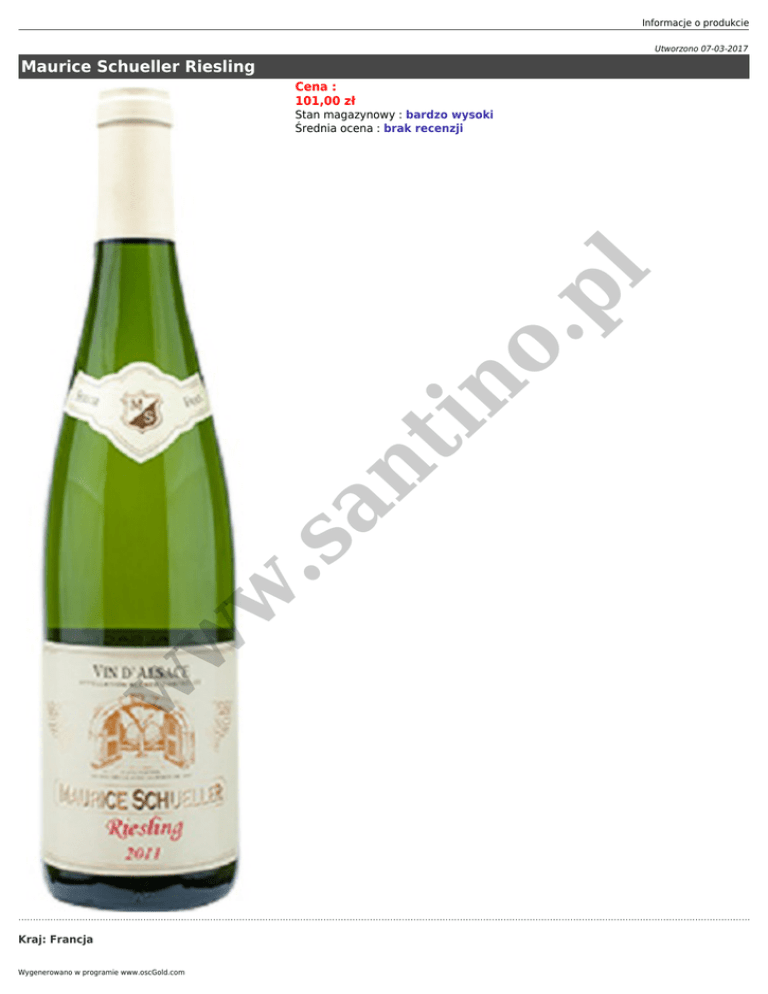 Informacje o produkcie Utworzono 07-03-2017 Maurice Schueller Riesling Cena : 101,00 zł w w w .s an t in o. pl Stan magazynowy : bardzo wysoki Średnia ocena : brak recenzji Kraj: Francja Wygenerowano w programie www.oscGold.com Region/apelacja: Alzacja Szczep: Riesling Pojemność: 0.75l Smak: Wytrawne Kolor: Białe w w w .s an t in o. pl 100% Riesling pochodzące z alzackich winnic, rosnących na gliniasto-piaszczystych glebach, dzięki czemu wino jest dojrzałe i bardzo odświeżające. To żywe wino z delikatną nutką owocowości. Idealnie nadaje się do dań rybnych, owoców morza oraz białych mięs. Serwować mocno schłodzone. Posiada wspaniały potencjał przechowywania (8-10 lat).