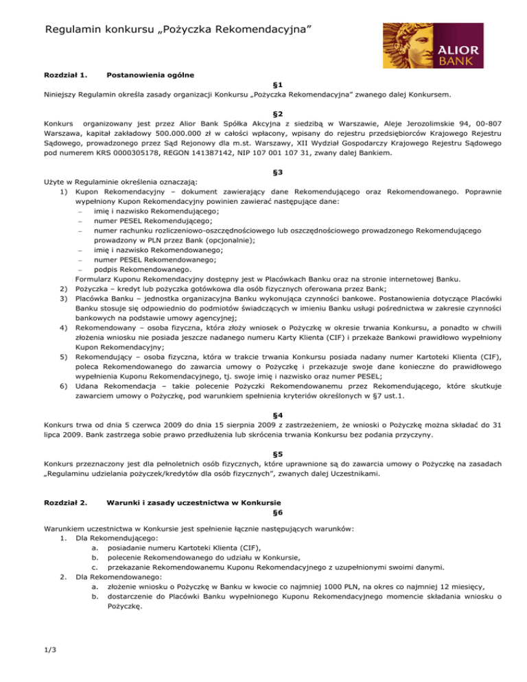 Regulamin konkursu „Pożyczka Rekomendacyjna” Rozdział 1. Postanowienia ogólne §1 Niniejszy Regulamin określa zasady organizacji Konkursu „Pożyczka Rekomendacyjna” zwanego dalej Konkursem. §2 Konkurs organizowany jest przez Alior Bank Spółka Akcyjna z siedzibą w Warszawie, Aleje Jerozolimskie 94, 00-807 Warszawa, kapitał zakładowy 500.000.000 zł w całości wpłacony, wpisany do rejestru przedsiębiorców Krajowego Rejestru Sądowego, prowadzonego przez Sąd Rejonowy dla m.st. Warszawy, XII Wydział Gospodarczy Krajowego Rejestru Sądowego pod numerem KRS 0000305178, REGON 141387142, NIP 107 001 107 31, zwany dalej Bankiem. §3 Użyte w Regulaminie określenia oznaczają: 1) Kupon Rekomendacyjny – dokument zawierający dane Rekomendującego oraz Rekomendowanego. Poprawnie wypełniony Kupon Rekomendacyjny powinien zawierać następujące dane: imię i nazwisko Rekomendującego; numer PESEL Rekomendującego; numer rachunku rozliczeniowo-oszczędnościowego lub oszczędnościowego prowadzonego Rekomendującego prowadzony w PLN przez Bank (opcjonalnie); imię i nazwisko Rekomendowanego; numer PESEL Rekomendowanego; podpis Rekomendowanego. Formularz Kuponu Rekomendacyjny dostępny jest w Placówkach Banku oraz na stronie internetowej Banku. 2) Pożyczka – kredyt lub pożyczka gotówkowa dla osób fizycznych oferowana przez Bank; 3) Placówka Banku – jednostka organizacyjna Banku wykonująca czynności bankowe. Postanowienia dotyczące Placówki Banku stosuje się odpowiednio do podmiotów świadczących w imieniu Banku usługi pośrednictwa w zakresie czynności bankowych na podstawie umowy agencyjnej; 4) Rekomendowany – osoba fizyczna, która złoży wniosek o Pożyczkę w okresie trwania Konkursu, a ponadto w chwili złożenia wniosku nie posiada jeszcze nadanego numeru Karty Klienta (CIF) i przekaże Bankowi prawidłowo wypełniony Kupon Rekomendacyjny; 5) Rekomendujący – osoba fizyczna, która w trakcie trwania Konkursu posiada nadany numer Kartoteki Klienta (CIF), poleca Rekomendowanego do zawarcia umowy o Pożyczkę i przekazuje swoje dane konieczne do prawidłowego wypełnienia Kuponu Rekomendacyjnego, tj. swoje imię i nazwisko oraz numer PESEL; 6) Udana Rekomendacja – takie polecenie Pożyczki Rekomendowanemu przez Rekomendującego, które skutkuje zawarciem umowy o Pożyczkę, pod warunkiem spełnienia kryteriów określonych w §7 ust.1. §4 Konkurs trwa od dnia 5 czerwca 2009 do dnia 15 sierpnia 2009 z zastrzeżeniem, że wnioski o Pożyczkę można składać do 31 lipca 2009. Bank zastrzega sobie prawo przedłużenia lub skrócenia trwania Konkursu bez podania przyczyny. §5 Konkurs przeznaczony jest dla pełnoletnich osób fizycznych, które uprawnione są do zawarcia umowy o Pożyczkę na zasadach „Regulaminu udzielania pożyczek/kredytów dla osób fizycznych”, zwanych dalej Uczestnikami. Rozdział 2. Warunki i zasady uczestnictwa w Konkursie §6 Warunkiem uczestnictwa w Konkursie jest spełnienie łącznie następujących warunków: 1. Dla Rekomendującego: a. posiadanie numeru Kartoteki Klienta (CIF), b. polecenie Rekomendowanego do udziału w Konkursie, c. przekazanie Rekomendowanemu Kuponu Rekomendacyjnego z uzupełnionymi swoimi danymi. 2. Dla Rekomendowanego: a. złożenie wniosku o Pożyczkę w Banku w kwocie co najmniej 1000 PLN, na okres co najmniej 12 miesięcy, b. dostarczenie do Placówki Banku wypełnionego Kuponu Rekomendacyjnego momencie składania wniosku o Pożyczkę. 1/3 1. 2. 3. 4. 5. 6. 1. 2. §7 Za każdą Udaną Rekomendację, Rekomendujący oraz Rekomendowany otrzymują nagrodę pieniężną I stopnia w wysokości określonej w ust. 2, pod warunkiem łącznego spełnienia następujących warunków: a. Kwota Pożyczki to min. 1000 PLN, b. Okres kredytowania to min. 12 miesięcy, c. Bank podejmie pozytywną decyzję kredytową i rekomendowana Pożyczka zostanie uruchomiona w ciągu 30 dni od podpisania umowy o Pożyczkę, d. Rekomendowany nie odstąpi od umowy o Pożyczkę w ciągu 10 dni kalendarzowych od daty zawarcia umowy. W przypadku spełnienia warunków Udanej Rekomendacji, Bank wypłaci Rekomendującemu i Rekomendowanemu nagrody pieniężne I stopnia w wysokości 50 PLN. Łączna wysokość nagród pieniężnych I stopnia dla jednego Rekomendującego nie może przekroczyć kwoty 750 zł. Współposiadacze wspólnego rachunku kredytowego prawo do nagrody nabywają łącznie. W przypadku polecenia jednego Rekomendowanego więcej niż jeden raz, nagroda I stopnia przysługuje tylko za pierwszą Udaną Rekomendację. W przypadku zawarcia przez Rekomendowanego więcej niż jednej umowy o Pożyczkę, nagroda I stopnia przysługuje wyłącznie za pierwszą zawarta umowę. W przypadku przedterminowej spłaty Pożyczki, Rekomendowany zobowiązany jest do zwrócenia nagrody. §8 Uczestnik, który w najkrótszym czasie od rozpoczęcia Konkursu dokona Udanej Rekomendacji 15 Rekomendowanych otrzymuje dodatkowo nagrodę pieniężną II stopnia w wysokości 361 zł. Uczestnikowi o którym mowa powyżej, od łącznej wartości nagród pieniężnych I i II stopnia Bank, jako płatnik, pobierze i odprowadzi do właściwego Urzędu Skarbowego zryczałtowany podatek dochodowy, o którym mowa w art. 30 ust. 1 pkt 2 ustawy z dnia 26 lipca 1991 roku o podatku dochodowym od osób fizycznych (Dz.U. z 2000r. nr 14, poz. 176 ze zm.) §9 Nagrody pieniężne I i II stopnia wypłacone zostaną w terminie do dnia 31 sierpnia 2009 na rachunki oszczędnościoworozliczeniowe lub rachunki oszczędnościowe w Banku prowadzone w PLN należące do Rekomendowanych i Rekomendujących. Rozdział 3. 1. 2. Postanowienia końcowe §10 Wszelkie reklamacje Uczestników Konkursu będą przyjmowane w terminie do 15 dni roboczych od daty wypłaty nagród. Reklamacja może być zgłoszona: a. w Placówce Banku, b. telefonicznie w Contact Center, c. poprzez Bankowość Internetową. §11 W roli Rekomendowanego ani Rekomendującego nie mogą występować: a. prac