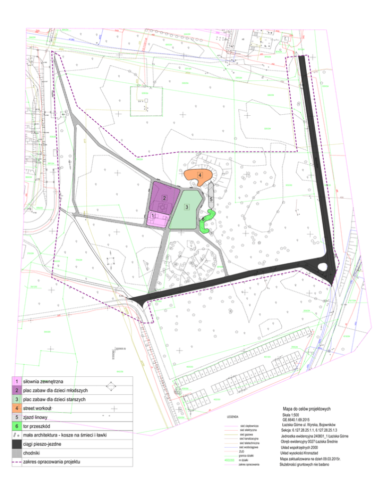 k g k g eN A 3975/204 g W k146 W k k k143 W k 3251/204 k t ks110 W k 3260/204 gA 20 0 eNA k k gA200 k147 3037/204 3974/204 k k271 g 2e N A eN 4845/204 i eNA kd31 5 gA300 m5 k k270 k ZUD 21 W 4eNA k k 2eNA k 3 /2 0 1 3 Z U D 11 g 2co 4444/204 eNA g100 w 110P E k k w63PE 9 /2 0 1 4 g 3846/204 2eNA gA80 4844/204 2eNA eNA k3 k300 3526/204 g k60 t 3559/204 parking k4 3259/204 3262/204 k gg g g k150 g g g g śm k148 g k151 3263/204 k k149 k152 3526/204 gA150 k153 k158 g k154 k155 3697/204 k g 3695/204 ów Bojownik 3545/204 k157 4 k156 3034/203 3032/203 eN N eN 2 5 k 3 3698/204 k164 niecz. k159 k3 50 k k 1 k 6 g k 3703/204 3543/200 3544/204 k 3574/203 k k k k k k e k k k k k g w16 0 k 10c 3541/200 k R 150 k 3572/203 4217/204 1008 k eN k10 3540/200 eS 1 siłownia zewnętrzna 3539/200 2 plac zabaw dla dzieci młodszych e t t 4026/200 3 plac zabaw dla dzieci starszych t t t t t t t t t t t t t t t t t t t t t t t t t t t t E t t t t t t k t t t k e t k t t t 4022/203 t Mapa do celów projektowych LEGENDA 6 tor przeszkód mała architektura - kosze na śmieci i ławki ciągi pieszo-jezdne chodniki zakres opracowania projektu 4021/203 eN 4024/204 k w n ie c z t t t t t 4 street workout 5 zjazd linowy t t t t t t t t k11 3556/204 n 50 gA1 4842/200 t t t t 4218/204 wAn 6562500.00 4020/203 t t t t t t t t e t w63P eN 5555600.0 0 t t t t t t t t t t 4022/203 sieć ciepłownicza sieć elektryczna sieć gazowa sieć kanalizacyjna sieć teletechniczna sieć wodociągowa ZUD granica działki nr działki zakres opracowania Skala 1:500 GE.6640.1.69.2015 Łaziska Górne ul. Wyrska, Bojowników Sekcja: 6.127.28.25.1.1, 6.127.28.25.1.3 Jednostka ewidencyjna 240801_1 Łaziska Górne Obręb ewidencyjny 0027 Łaziska Średnie Układ wspołrzędnych 2000 Układ wysokości Kronsztad Mapa zaktualizowana na dzień 09.03.2015r. Służebności gruntowych nie badano wAnn 0PE g16 z. niec eNN 3558/204