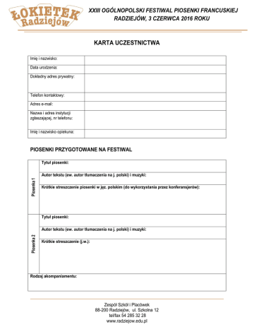 XXIII OGÓLNOPOLSKI FESTIWAL PIOSENKI FRANCUSKIEJ RADZIEJÓW, 3 CZERWCA 2016 ROKU KARTA UCZESTNICTWA Imię i nazwisko: Data urodzenia: Dokładny adres prywatny: Telefon kontaktowy: Adres e-mail: Nazwa i adres instytucji zgłaszającej, nr telefonu: Imię i nazwisko opiekuna: PIOSENKI PRZYGOTOWANE NA FESTIWAL Tytuł piosenki: Piosenka 1 Autor tekstu (ew. autor tłumaczenia na j. polski) i muzyki: Krótkie streszczenie piosenki w jęz. polskim (do wykorzystania przez konferansjerów): Tytuł piosenki: Piosenka 2 Autor tekstu (ew. autor tłumaczenia na j. polski) i muzyki: Krótkie streszczenie (j.w.): Rodzaj akompaniamentu: Zespół Szkół i Placówek 88-200 Radziejów, ul. Szkolna 12 tel/fax 54 285 32 28 www.radziejow.edu.pl Informacje o wykonawcy do wykorzystania przez konferansjerów (zainteresowania, osiągnięcia itp.): REZERWACJA NOCLEGÓW W INTERNACIE Nocleg 2/3 czerwca Nocleg 3/4 czerwca Liczba osób: Liczba osób: KARTĘ PROSIMY WYPEŁNIĆ CZYTELNIE Pieczęć instytucji delegującej Podpis uczestnika lub opiekuna ……………………………………………………………. Zespół Szkół i Placówek 88-200 Radziejów, ul. Szkolna 12 tel/fax 54 285 32 28 www.radziejow.edu.pl