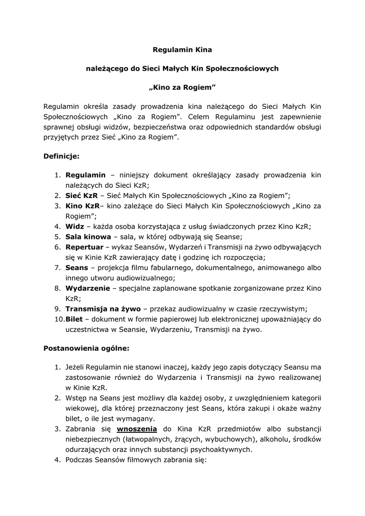 Regulamin Kina należącego do Sieci Małych Kin Społecznościowych „Kino za Rogiem” Regulamin określa zasady prowadzenia kina należącego do Sieci Małych Kin Społecznościowych „Kino za Rogiem”. Celem Regulaminu jest zapewnienie sprawnej obsługi widzów, bezpieczeństwa oraz odpowiednich standardów obsługi przyjętych przez Sieć „Kino za Rogiem”. Definicje: 1. Regulamin – niniejszy dokument określający zasady prowadzenia kin należących do Sieci KzR; 2. Sieć KzR – Sieć Małych Kin Społecznościowych „Kino za Rogiem”; 3. Kino KzR– kino zależące do Sieci Małych Kin Społecznościowych „Kino za Rogiem”; 4. Widz – każda osoba korzystająca z usług świadczonych przez Kino KzR; 5. Sala kinowa – sala, w której odbywają się Seanse; 6. Repertuar – wykaz Seansów, Wydarzeń i Transmisji na żywo odbywających się w Kinie KzR zawierający datę i godzinę ich rozpoczęcia; 7. Seans – projekcja filmu fabularnego, dokumentalnego, animowanego albo innego utworu audiowizualnego; 8. Wydarzenie – specjalne zaplanowane spotkanie zorganizowane przez Kino KzR; 9. Transmisja na żywo – przekaz audiowizualny w czasie rzeczywistym; 10.Bilet – dokument w formie papierowej lub elektronicznej upoważniający do uczestnictwa w Seansie, Wydarzeniu, Transmisji na żywo. Postanowienia ogólne: 1. Jeżeli Regulamin nie stanowi inaczej, każdy jego zapis dotyczący Seansu ma zastosowanie również do Wydarzenia i Transmisji na żywo realizowanej w Kinie KzR. 2. Wstęp na Seans jest możliwy dla każdej osoby, z uwzględnieniem kategorii wiekowej, dla której przeznaczony jest Seans, która zakupi i okaże ważny bilet, o ile jest wymagany. 3. Zabrania się wnoszenia do Kina KzR przedmiotów albo substancji niebezpiecznych (łatwopalnych, żrących, wybuchowych), alkoholu, środków odurzających oraz innych substancji psychoaktywnych. 4. Podczas Seansów filmowych zabrania się: a. dokonywania rejestracji obrazu lub dźwięku (zgodnie z ustawą z dnia 04 lutego 1994 r. o prawie autorskim i prawach pokrewnych (Dz.U. z 1994 r., Nr 24 poz. 83 z późn. zm)); b. korzystania z telefonów komórkowych, tabletów i innych urządzeń w sposób zakłócający oglądanie Seansu; c. palenia tytoniu oraz papierosów elektronicznych; d. zażywania środków odurzających; e. głośnego, niestosownego zachowania się (nie chrup, nie siorbaj, nie szeleść, nie spóźniaj się, nie ściągaj butów, nie kop siedzeń, nie ignoruj zachowań swoich dzieci/podopiecznych, nie rozmawiaj); f. śmiecenia; g. użytkowania wyposażenia Kina KzR niezgodnie z przeznaczeniem; h. niszczenia mienia Kina KzR; i. wprowadzania zwierząt bez zgody pracowników Kina KzR, z wyjątkiem psów przewodników dla osób niewidomych i niedowidzących. W przypadku łamania w/w zakazów pracownik Kina KzR ma prawo wyprosić widza z Kina KzR bez prawa do zwrotu kosztów biletu, wezwania ochrony lub Policji. Sprzedaż i zwrot biletów: 1. Nie ma możliwości zwrotu zakupionych Biletów po rozpoczęciu seansu. Zwrot możliwy jest najpóźniej na 30 minut przed Seansem. 2. Kasjer ma prawo odmówić zwrotu ceny Biletów z przyczyn formalnych (np. brak środków w kasie). W takich sytuacjach zwrot będzie dokonany w momencie pozwalającym na dokonanie zwrotu. Kasjer zobowiązany jest poinformować klienta o pierwszym możliwym terminie zwrotu ceny Biletów. 3. Zwrot ceny Biletów jest możliwy tylko za okazaniem paragonu i ważnego Biletu. 4. Kasa Kina KzR jest zamykana 5 minut po rozpoczęciu każdego Seansu. 5. Opiekunom grup zorganizowanych przysługuje wstęp wolny. Liczba bezpłatnych Biletów uzależniona jest od liczby osób pozostających pod opieką jednego opiekuna: a. grupa do 15 podopiecznych do 10 roku życia – od 2 do 5 opiekunów; b. grupa do 15 podopiecznych od 10 do 16 roku życia – od 1 do 3 opiekunów;grupa do 15 podopiecznych powyżej 16 roku życia - 1 opiekun. 6. Zakupione Bilety należy zachować do końca trwania Seansu. 7. Kasjer może odmówić sprzedaży Biletu lub wstępu na salę w następujących przypadkach: a. pokaz Seansu nie jest możliwy, pomimo wcześniejszej deklaracji repertuarowej, z powodu awarii lub przypadków losowych niezależnych od Kina KzR; b. widz jest w stanie nietrzeźwym, pod wpływem środków odurzających lub psychoaktywnych, posiada przy sobie przedmioty niebezpieczne lub swoim zachowaniem zagraża bezpieczeństwu innych osób; c. widz nie spełnia wymogu granicy wieku, od której dopuszcza się uczestniczenie w Seansie; d. widz nie spełnia wymogu granicy wieku (13 rok życia), od której dopuszcza się uczestniczenie w Seansie bez opieki osoby dorosłej; e. wszystkie Bilety na seans zostały sprzedane. 8. Kasjer ma prawo odmówić przyjęcia zwrotu wykupionych Biletów oraz zwrotu środków pieniężnych na zasadach określonych w Regulaminie w następujących przypadkach: a. widz chce zwrócić Bilet po rozpoczęciu Seansu z powodów nie leżących po stronie Kina KzR; b. widz chce zwrócić Bilet po częściowym udziale w Seansie. Postanowienia końcowe: 1. Repertuar Kina KzR dostępny jest na: a. Stronie internetowej www.centrum.izabelin.pl b. na afiszu przed wejściem do Kina KzR; c. na podstronie Kina KzR na portalu www.kinozarogiem.pl d. na społecznościowych portalach internetowych, na których zamieszczana jest regularna informacja o repertuarze Kina KzR. 2. Kino KzR nie ponosi odpowiedzialności za złe samopoczucie widza spowodowane udziałem w Seansie. 3. Kino KzR nie ponosi odpowiedzialności za utratę rzeczy pozostawionych lub zagubionych przez widza w Kinie KzR. 4. Kino KzR zastrzega sobie prawo do zmiany repertuaru bez podania przyczyny. 5. Zakup Biletu, bezpłatny udział w Seansie jest równoczesnym wyrażeniem zgody na przestrzeganie Regulaminu. 6. Regulamin obowiązuje od dnia 7 listopada 2014 roku.