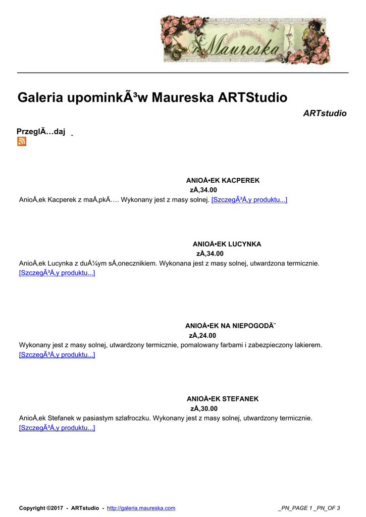 Galeria upominków Maureska ARTStudio ARTstudio PrzeglÄ…daj ANIOÅ•EK KACPEREK zÅ‚34.00 AnioÅ‚ek Kacperek z maÅ‚pkÄ…. Wykonany jest z masy solnej. [Szczegóły produktu...] ANIOÅ•EK LUCYNKA zÅ‚34.00 AnioÅ‚ek Lucynka z dużym sÅ‚onecznikiem. Wykonana jest z masy solnej, utwardzona termicznie. [Szczegóły produktu...] ANIOÅ•EK NA NIEPOGODĘ zÅ‚24.00 Wykonany jest z masy solnej, utwardzony termicznie, pomalowany farbami i zabezpieczony lakierem. [Szczegóły produktu...] ANIOÅ•EK STEFANEK zÅ‚30.00 AnioÅ‚ek Stefanek w pasiastym szlafroczku. Wykonany jest z masy solnej, utwardzony termicznie. [Szczegóły produktu...] Copyright ©2017 - ARTstudio - http://galeria.maureska.com _PN_PAGE 1 _PN_OF 3 ANIOÅ•EK TOÅšKA zÅ‚26.00 AnioÅ‚ek ToÅ›ka z siwym zajÄ…czkiem. Wykonana jest z masy solnej. [Szczegóły produktu...] AnioÅ‚ki 2 odlew gipsowy Zapytaj o cenÄ™ [Szczegóły produktu...] Drewniana skrzyneczka zÅ‚50.00 [Szczegóły produktu...] Drewniana skrzyneczka zÅ‚52.00 [Szczegóły produktu...] Drewniana skrzyneczka zÅ‚50.00 [Szczegóły produktu...] MIÅš KAROLEK zÅ‚17.00 MiÅ› Karolek wykonany rÄ™cznie na szydeÅ‚ku z żółtej weÅ‚enki.Ubrany jest w szydeÅ‚kowany biaÅ‚y golf i czapkÄ™ z pomponem. [Szczegóły produktu...] MIÅš TOLEK zÅ‚24.00 MiÅ› Tolek wykonany rÄ™cznie na szydeÅ‚ku z czarnej weÅ‚enki. Ubrany jest w szydeÅ‚kowanÄ… pomaraÅ„czowÄ… kamizelkÄ™ zapinanÄ… na siwy weÅ‚niany guziczek. [Szczegóły produktu...] Copyright ©2017 - ARTstudio - http://galeria.maureska.com _PN_PAGE 2 _PN_OF 3 MISIO BASTEK zÅ‚19.50 Misio Bastek wykonany rÄ™cznie na szydeÅ‚ku z biaÅ‚ej weÅ‚enki. Misio uksztaÅ‚towany w pozycji siedzÄ…cej. Ubrany jest w szydeÅ‚kowany bordowy golf i czapkÄ™ z pomponem, które można zdjąć. [Szczegóły produktu...] MISIO FRANIO zÅ‚22.00 Misio Franio wykonany rÄ™cznie na szydeÅ‚ku z rudawej weÅ‚enki. Ubrany jest w szydeÅ‚kowanÄ… beżowÄ… kamizelkÄ™ zapinana na dwa weÅ‚niane guziczki, z siwÄ… kieszonkÄ… z boku. [Szczegóły produktu...] • • • • • «« Start « Poprzednia 1 NastÄ™pna » Koniec »» Wyniki 1 - 13 z 13 Copyright ©2017 - ARTstudio - http://galeria.maureska.com _PN_PAGE 3 _PN_OF 3
