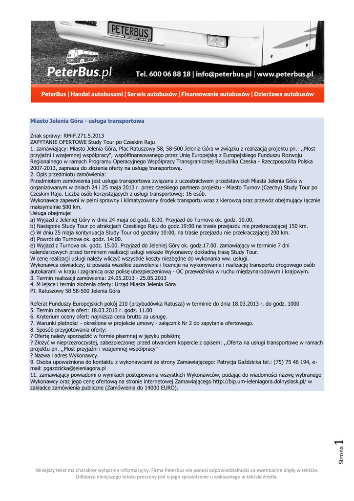 Miasto Jelenia Góra - usługa transportowa Znak sprawy: RM-F.271.5.2013 ZAPYTANIE OFERTOWE Study Tour po Czeskim Raju 1. zamawiający: Miasto Jelenia Góra, Plac Ratuszowy 58, 58-500 Jelenia Góra w związku z realizacją projektu pn.: ,,Most przyjaźni i wzajemnej współpracy", współfinansowanego przez Unię Europejską z Europejskiego Funduszu Rozwoju Regionalnego w ramach Programu Operacyjnego Współpracy Transgranicznej Republika Czeska - Rzeczpospolita Polska 2007-2013, zaprasza do złożenia oferty na usługę transportową. 2. Opis przedmiotu zamówienia: Przedmiotem zamówienia jest usługa transportowa związana z uczestnictwem przedstawicieli Miasta Jelenia Góra w organizowanym w dniach 24 i 25 maja 2013 r. przez czeskiego partnera projektu - Miasto Turnov (Czechy) Study Tour po Czeskim Raju. Liczba osób korzystających z usługi transportowej: 16 osób. Wykonawca zapewni w pełni sprawny i klimatyzowany środek transportu wraz z kierowcą oraz przewóz obejmujący łącznie maksymalnie 500 km. Usługa obejmuje: a) Wyjazd z Jeleniej Góry w dniu 24 maja od godz. 8.00. Przyjazd do Turnova ok. godz. 10.00. b) Następnie Study Tour po atrakcjach Czeskiego Raju do godz.19:00 na trasie przejazdu nie przekraczającej 150 km. c) W dniu 25 maja kontynuacja Study Tour od godziny 10:00, na trasie przejazdu nie przekraczającej 200 km. d) Powrót do Turnova ok. godz. 14:00. e) Wyjazd z Turnova ok. godz. 15.00. Przyjazd do Jeleniej Góry ok. godz.17.00. zamawiający w terminie 7 dni kalendarzowych przed terminem realizacji usługi wskaże Wykonawcy dokładną trasę Study Tour. W cenę realizacji usługi należy wliczyć wszystkie koszty niezbędne do wykonania ww. usługi. Wykonawca oświadczy, iż posiada wszelkie zezwolenia i licencje na wykonywanie i realizację transportu drogowego osób autokarami w kraju i zagranicą oraz polisę ubezpieczeniową - OC przewoźnika w ruchu międzynarodowym i krajowym. 3. Termin realizacji zamówienia: 24.05.2013 - 25.05.2013 4. M iejsce i termin złożenia oferty: Urząd Miasta Jelenia Góra PI. Ratuszowy 58 58-500 Jelenia Góra Strona 1 Referat Funduszy Europejskich pokój 210 (przybudówka Ratusza) w terminie do dnia 18.03.2013 r. do godz. 1000 5. Termin otwarcia ofert: 18.03.2013 r. godz. 11.00 6. Kryterium oceny ofert: najniższa cena brutto za usługę. 7. Warunki płatności - określone w projekcie umowy - załącznik Nr 2 do zapytania ofertowego. 8. Sposób przygotowania oferty: ? Ofertę należy sporządzić w formie pisemnej w języku polskim; ? Złożyć w nieprzezroczystej, zabezpieczonej przed otwarciem kopercie z opisem: ,,Oferta na usługi transportowe w ramach projektu pn. ,,Most przyjaźni i wzajemnej współpracy" ? Nazwa i adres Wykonawcy. 9. Osoba upoważniona do kontaktu z wykonawcami ze strony Zamawiającego: Patrycja Gaździcka tel.: (75) 75 46 194, email: [email protected] 11. zamawiający powiadomi o wynikach postępowania wszystkich Wykonawców, podając do wiadomości nazwę wybranego Wykonawcy oraz jego cenę ofertową na stronie internetowej Zamawiającego http://bip.um-ieleniagora.dolnyslask.pl/ w zakładce zamówienia publiczne (Zamówienia do 14000 EURO). Niniejszy tekst ma charakter wyłącznie informacyjny. Firma Peterbus nie ponosi odpowiedzialności za ewentualne błędy w tekście. Odbiorca niniejszego tekstu proszony jest o jego sprawdzenie u wskazanego w tekście źródła.