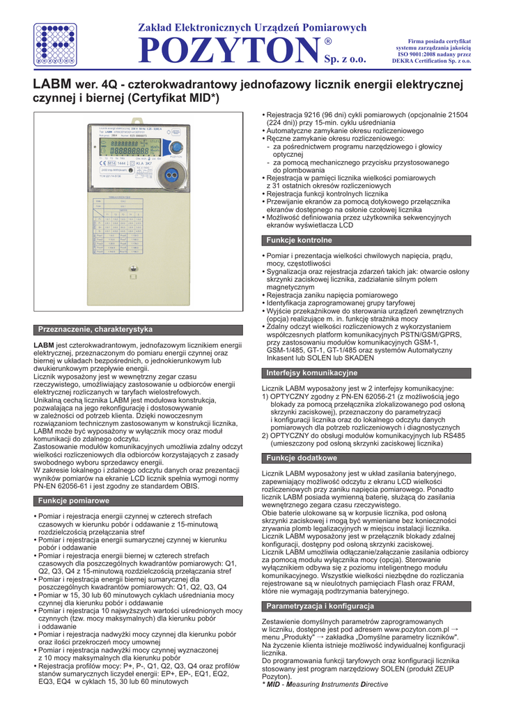 Zakład Elektronicznych Urządzeń Pomiarowych POZYTON R Sp. z o.o. Firma posiada certyfikat systemu zarządzania jakością ISO 9001:2008 nadany przez DEKRA Certification Sp. z o.o. LABM wer. 4Q - czterokwadrantowy jednofazowy licznik energii elektrycznej czynnej i biernej (Certyfikat MID*) ? Rejestracja 9216 (96 dni) cykli pomiarowych (opcjonalnie 21504 (224 dni)) przy 15-min. cyklu uśredniania ? Automatyczne zamykanie okresu rozliczeniowego ? Ręczne zamykanie okresu rozliczeniowego: - za pośrednictwem programu narzędziowego i głowicy optycznej - za pomocą mechanicznego przycisku przystosowanego do plombowania ? Rejestracja w pamięci licznika wielkości pomiarowych z 31 ostatnich okresów rozliczeniowych ? Rejestracja funkcji kontrolnych licznika ? Przewijanie ekranów za pomocą dotykowego przełącznika ekranów dostępnego na osłonie czołowej licznika ? Możliwość definiowania przez użytkownika sekwencyjnych ekranów wyświetlacza LCD Funkcje kontrolne Przeznaczenie, charakterystyka LABM jest czterokwadrantowym, jednofazowym licznikiem energii elektrycznej, przeznaczonym do pomiaru energii czynnej oraz biernej w układach bezpośrednich, o jednokierunkowym lub dwukierunkowym przepływie energii. Licznik wyposażony jest w wewnętrzny zegar czasu rzeczywistego, umożliwiający zastosowanie u odbiorców energii elektrycznej rozliczanych w taryfach wielostrefowych. Unikalną cechą licznika LABM jest modułowa konstrukcja, pozwalająca na jego rekonfigurację i dostosowywanie w zależności od potrzeb klienta. Dzięki nowoczesnym rozwiązaniom technicznym zastosowanym w konstrukcji licznika, LABM może być wyposażony w wyłącznik mocy oraz moduł komunikacji do zdalnego odczytu. Zastosowanie modułów komunikacyjnych umożliwia zdalny odczyt wielkości rozliczeniowych dla odbiorców korzystających z zasady swobodnego wyboru sprzedawcy energii. W zakresie lokalnego i zdalnego odczytu danych oraz prezentacji wyników pomiarów na ekranie LCD licznik spełnia wymogi normy PN-EN 62056-61 i jest zgodny ze standardem OBIS. Funkcje pomiarowe ? Pomiar i rejestracja energii czynnej w czterech strefach czasowych w kierunku pobór i oddawanie z 15-minutową rozdzielczością przełączania stref ? Pomiar i rejestracja energii sumarycznej czynnej w kierunku pobór i oddawanie ? Pomiar i rejestracja energii biernej w czterech strefach czasowych dla poszczególnych kwadrantów pomiarowych: Q1, Q2, Q3, Q4 z 15-minutową rozdzielczością przełączania stref ? Pomiar i rejestracja energii biernej sumarycznej dla poszczególnych kwadrantów pomiarowych: Q1, Q2, Q3, Q4 ? Pomiar w 15, 30 lub 60 minutowych cyklach uśredniania mocy czynnej dla kierunku pobór i oddawanie ? Pomiar i rejestracja 10 najwyższych wartości uśrednionych mocy czynnych (tzw. mocy maksymalnych) dla kierunku pobór i oddawanie ? Pomiar i rejestracja nadwyżki mocy czynnej dla kierunku pobór oraz ilości przekroczeń mocy umownej ? Pomiar i rejestracja nadwyżki mocy czynnej wyznaczonej z 10 mocy maksymalnych dla kierunku pobór ? Rejestracja profilów mocy: P+, P-, Q1, Q2, Q3, Q4 oraz profilów stanów sumarycznych liczydeł energii: EP+, EP-, EQ1, EQ2, EQ3, EQ4 w cyklach 15, 30 lub 60 minutowych ? Pomiar i prezentacja wielkości chwilowych napięcia, prądu, mocy, częstotliwości ? Sygnalizacja oraz rejestracja zdarzeń takich jak: otwarcie osłony skrzynki zaciskowej licznika, zadziałanie silnym polem magnetycznym ? Rejestracja zaniku napięcia pomiarowego ? Identyfikacja zaprogramowanej grupy taryfowej ? Wyjście przekaźnikowe do sterowania urządzeń zewnętrznych (opcja) realizujące m. in. funkcję strażnika mocy ? Zdalny odczyt wielkości rozliczeniowych z wykorzystaniem współczesnych platform komunikacyjnych PSTN/GSM/GPRS, przy zastosowaniu modułów komunikacyjnych GSM-1, GSM-1/485, GT-1, GT-1/485 oraz systemów Automatyczny Inkasent lub SOLEN lub SKADEN Interfejsy komunikacyjne Licznik LABM wyposażony jest w 2 interfejsy komunikacyjne: 1) OPTYCZNY zgodny z PN-EN 62056-21 (z możliwością jego blokady za pomocą przełącznika zlokalizowanego pod osłoną skrzynki zaciskowej), przeznaczony do parametryzacji i konfiguracji licznika oraz do lokalnego odczytu danych pomiarowych dla potrzeb rozliczeniowych i diagnostycznych 2) OPTYCZNY do obsługi modułów komunikacyjnych lub RS485 (umieszczony pod osłoną skrzynki zaciskowej licznika) Funkcje dodatkowe Licznik LABM wyposażony jest w układ zasilania bateryjnego, zapewniający możliwość odczytu z ekranu LCD wielkości rozliczeniowych przy zaniku napięcia pomiarowego. Ponadto licznik LABM posiada wymienną baterię, służącą do zasilania wewnętrznego zegara czasu rzeczywistego. Obie baterie ulokowane są w korpusie licznika, pod osłoną skrzynki zaciskowej i mogą być wymieniane bez konieczności zrywania plomb legalizacyjnych w miejscu instalacji licznika. Licznik LABM wyposażony jest w przełącznik blokady zdalnej konfiguracji, dostępny pod osłoną skrzynki zaciskowej. Licznik LABM umożliwia odłączanie/załączanie zasilania odbiorcy za pomocą modułu wyłącznika mocy (opcja). Sterowanie wyłącznikiem odbywa się z poziomu inteligentnego modułu komunikacyjnego. Wszystkie wielkości niezbędne do rozliczania rejestrowane są w nieulotnych pamięciach Flash oraz FRAM, które nie wymagają podtrzymania bateryjnego. Parametryzacja i konfiguracja Zestawienie domyślnych parametrów zaprogramowanych w liczniku, dostępne jest pod adresem www.pozyton.com.pl → menu „Produkty" → zakładka „Domyślne parametry liczników". Na życzenie klienta istnieje możliwość indywidualnej konfiguracji licznika. Do programowania funkcji taryfowych oraz konfiguracji licznika stosowany jest program narzędziowy SOLEN (produkt ZEUP Pozyton). * MID - Measuring Instruments Directive Licznik posiada Certyfikat Badania Typu WE nr TCM 221/14 - 5136 i podlega ocenie zgodności wg dyrektywy UE MID. ZEUP POZYTON zastrzega sobie prawo dokonywania zm