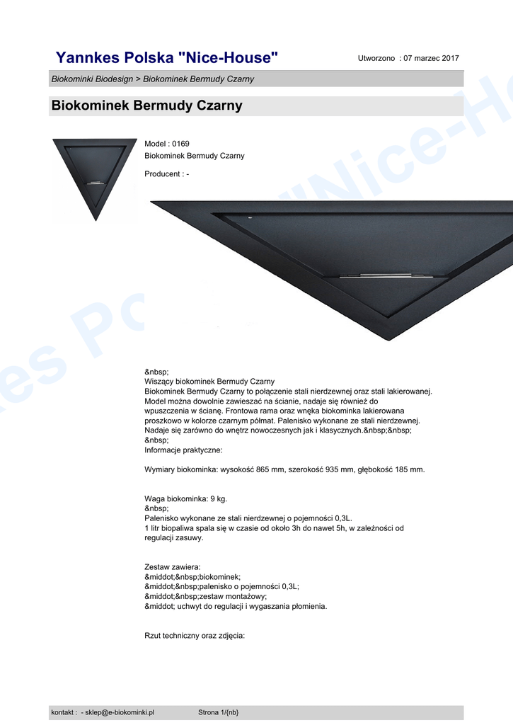 Yannkes Polska "Nice-House" Utworzono : 07 marzec 2017 Biokominki Biodesign > Biokominek Bermudy Czarny Biokominek Bermudy Czarny c i N Model : 0169 Biokominek Bermudy Czarny Producent : - s e k " a k s l o P H e Wiszący biokominek Bermudy Czarny Biokominek Bermudy Czarny to połączenie stali nierdzewnej oraz stali lakierowanej. Model można dowolnie zawieszać na ścianie, nadaje się również do wpuszczenia w ścianę. Frontowa rama oraz wnęka biokominka lakierowana proszkowo w kolorze czarnym półmat. Palenisko wykonane ze stali nierdzewnej. Nadaje się zarówno do wnętrz nowoczesnych jak i klasycznych. Informacje praktyczne: Wymiary biokominka: wysokość 865 mm, szerokość 935 mm, głębokość 185 mm. Waga biokominka: 9 kg. Palenisko wykonane ze stali nierdzewnej o pojemności 0,3L. 1 litr biopaliwa spala się w czasie od około 3h do nawet 5h, w zależności od regulacji zasuwy. Zestaw zawiera: · biokominek; · palenisko o pojemności 0,3L; · zestaw montażowy; · uchwyt do regulacji i wygaszania płomienia. Rzut techniczny oraz zdjęcia: kontakt : - [email protected] Strona 1/{nb} Yannkes Polska "Nice-House" Utworzono : 07 marzec 2017 Biokominki Biodesign > Biokominek Bermudy Czarny Biokominek Bermudy Czarny " a c i N s e k k s l o P kontakt : - [email protected] Strona 2/{nb} H e Yannkes Polska "Nice-House" Utworzono : 07 marzec 2017 Biokominki Biodesign > Biokominek Bermudy Czarny Biokominek Bermudy Czarny " a c i N s e k k s l o P kontakt : - [email protected] Strona 3/{nb} H e Yannkes Polska "Nice-House" Utworzono : 07 marzec 2017 Biokominki Biodesign > Biokominek Bermudy Czarny Biokominek Bermudy Czarny " a c i N s e k k s l o P kontakt : - [email protected] Strona 4/{nb} H e Yannkes Polska "Nice-House" Utworzono : 07 marzec 2017 Biokominki Biodesign > Biokominek Bermudy Czarny Biokominek Bermudy Czarny c i N Cena : 479,00 zł Brutto ( 389,43 zł Netto) " a k s l o P Dostępność: Produkt dostępny w naszym sklepie od 19 marzec 2013 s e k kontakt : - [email protected] Strona 5/{nb} H e