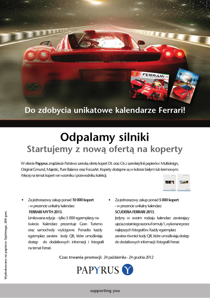 Do zdobycia unikatowe kalendarze Ferrari! Odpalamy silniki Startujemy z nową ofertą na koperty Wydrukowano na papierze Optiimage, 200 gsm. W ofercie Papyrus znajdziecie Państwo szeroką ofertę kopert DL oraz C6 z szerokiej linii papierów: Multidesign, Original Gmund, Majestic, Pure Balance oraz FocusArt. Koperty dostępne są w kolorze białym lub kremowym. Więcej na temat kopert we wzorniku i przewodniku kolekcji. • Za jednorazowy zakup ponad 10 000 kopert - w prezencie unikalny kalendarz FERRARI MYTH 2013. Limitowana edycja - tylko 5 000 egzemplarzy na świecie. Kalendarz prezentuje Gran Turismo oraz samochody wyścigowe. Ponadto każdy egzemplarz zawiera kody QR, które umożliwiają dostęp do dodatkowych informacji i fotografii na temat Ferrari. • Za jednorazowy zakup ponad 5 000 kopert - w prezencie unikalny kalendarz SCUDERIA FERRARI 2013. Jedyny w swoim rodzaju kalendarz zawierający ujęciazostatniegosezonuFormuły1,wykonaneprzez najlepszych fotografów. Każdy egzemplarz zawiera również kody QR, które umożliwiają dostęp do dodatkowych informacji i fotografii Ferrari. Czas trwania promocji: 24 października - 24 grudnia 2012 www.papyrus.com supporting you