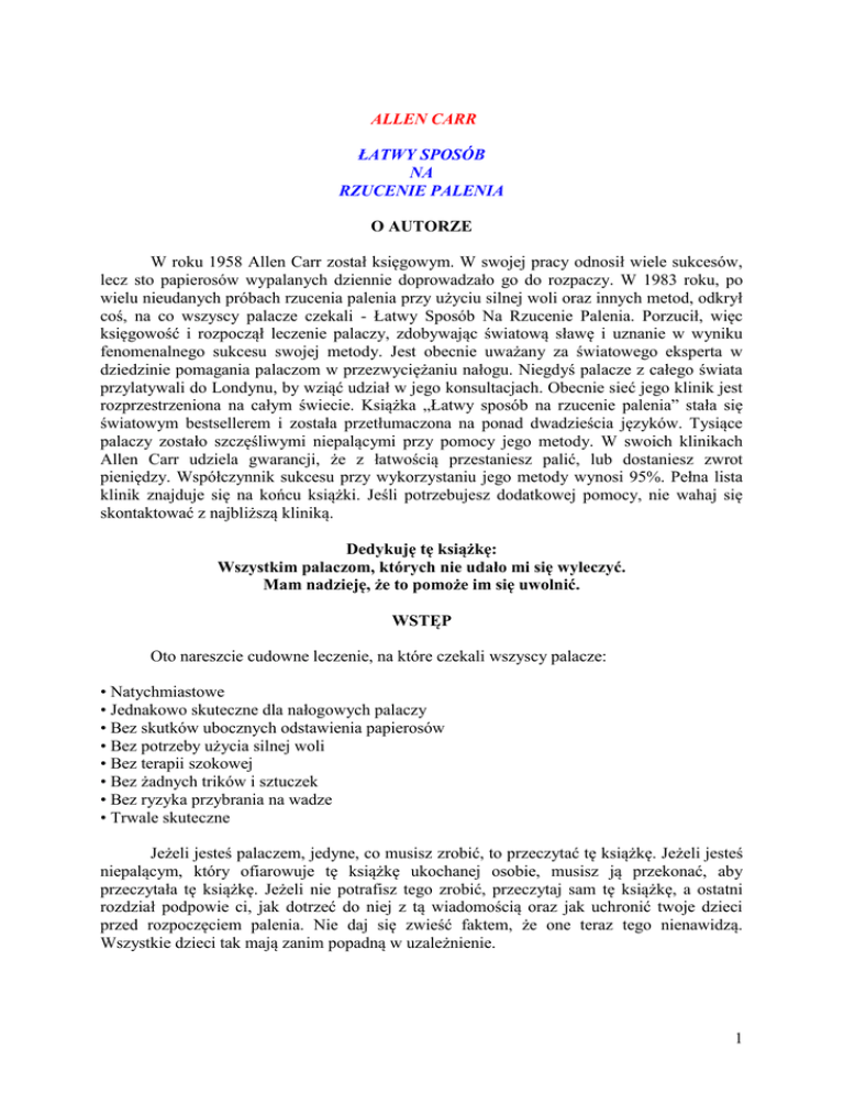 ALLEN CARR ŁATWY SPOSÓB NA RZUCENIE PALENIA O AUTORZE W roku 1958 Allen Carr został księgowym. W swojej pracy odnosił wiele sukcesów, lecz sto papierosów wypalanych dziennie doprowadzało go do rozpaczy. W 1983 roku, po wielu nieudanych próbach rzucenia palenia przy użyciu silnej woli oraz innych metod, odkrył coś, na co wszyscy palacze czekali - Łatwy Sposób Na Rzucenie Palenia. Porzucił, więc księgowość i rozpoczął leczenie palaczy, zdobywając światową sławę i uznanie w wyniku fenomenalnego sukcesu swojej metody. Jest obecnie uważany za światowego eksperta w dziedzinie pomagania palaczom w przezwyciężaniu nałogu. Niegdyś palacze z całego świata przylatywali do Londynu, by wziąć udział w jego konsultacjach. Obecnie sieć jego klinik jest rozprzestrzeniona na całym świecie. Książka „Łatwy sposób na rzucenie palenia” stała się światowym bestsellerem i została przetłumaczona na ponad dwadzieścia języków. Tysiące palaczy zostało szczęśliwymi niepalącymi przy pomocy jego metody. W swoich klinikach Allen Carr udziela gwarancji, że z łatwością przestaniesz palić, lub dostaniesz zwrot pieniędzy. Współczynnik sukcesu przy wykorzystaniu jego metody wynosi 95%. Pełna lista klinik znajduje się na końcu książki. Jeśli potrzebujesz dodatkowej pomocy, nie wahaj się skontaktować z najbliższą kliniką. Dedykuję tę książkę: Wszystkim palaczom, których nie udało mi się wyleczyć. Mam nadzieję, że to pomoże im się uwolnić. WSTĘP Oto nareszcie cudowne leczenie, na które czekali wszyscy palacze: • Natychmiastowe • Jednakowo skuteczne dla nałogowych palaczy • Bez skutków ubocznych odstawienia papierosów • Bez potrzeby użycia silnej woli • Bez terapii szokowej • Bez żadnych trików i sztuczek • Bez ryzyka przybrania na wadze • Trwale skuteczne Jeżeli jesteś palaczem, jedyne, co musisz zrobić, to przeczytać tę książkę. Jeżeli jesteś niepalącym, który ofiarowuje tę książkę ukochanej osobie, musisz ją przekonać, aby przeczytała tę książkę. Jeżeli nie potrafisz tego zrobić, przeczytaj sam tę książkę, a ostatni rozdział podpowie ci, jak dotrzeć do niej z tą wiadomością oraz jak uchronić twoje dzieci przed rozpoczęciem palenia. Nie daj się zwieść faktem, że one teraz tego nienawidzą. Wszystkie dzieci tak mają zanim popadną w uzależnienie. 1 OSTRZEŻENIE Być może jesteś pełen obaw i uprzedzeń na temat tej książki. Być może, jak większość palaczy, sama myśl o rzuceniu palenia napełnia cię strachem i choć masz jak najlepsze intencje, by pewnego dnia przestać palić, ten dzień to nie dzisiaj. Jeżeli oczekujesz, że powiem ci o strasznych skutkach zdrowotnych palenia, o tym, że palacze wydają fortunę w ciągu całego życia na papierosy, że jest to obrzydliwy i odrażający nałóg i że jesteś głupi i masz słabą wolę, to muszę cię rozczarować. Ta taktyka nigdy mi nie pomogła, a jeśliby miała pomóc tobie, to już do tej pory przestałbyś palić. Moja metoda, którą nazywam EASYWAY (ang.: łatwy sposób - przyp. tłum.) nie działa w ten sposób. Niektóre rzeczy, o których będę opowiadał, mogą wydać ci się mało wiarygodne, jednakże, kiedy skończysz czytać tę książkę, nie tylko w nie uwierzysz, ale będziesz się dziwić, jak mogłeś kiedykolwiek myśleć inaczej. Istnieje fałszywe przekonanie, że sami decydujemy o tym, iż chcemy palić. Palacze w tym samym stopniu decydują, że chcą być nałogowcami, w jakim pijak decyduje się, że chce zostać alkoholikiem, albo narkoman, że chce się uzależnić od heroiny. Prawdą jest, że sami decydujemy, aby zapalić te pierwsze, eksperymentalne papierosy. Ja też czasem decyduję się, żeby pójść do kina, ale nie postanowiłem spędzić całego życia w kinie. Zastanów się przez chwilę nad swoim życiem. Czy kiedykolwiek stwierdziłeś, że w niektórych momentach swego życia nie możesz cieszyć się posiłkiem lub spotkaniem towarzyskim, albo, że nie potrafisz się skoncentrować lub poradzić sobie ze stresem bez papierosa? W którym momencie podjąłeś decyzję, że potrzebujesz papierosów nie tylko przy okazjach towarzyskich, ale że potrzebujesz mieć je stale przy sobie i czujesz się niepewnie lub nawet panikujesz, gdy zaczyna ich brakować? Jak wszyscy palacze zostałeś wciągnięty w najbardziej subtelną i zatrważającą pułapkę, jaką człowiek i natura wspólnie skonstruowali. Nie ma na świecie ani jednego rodzica, czy to palacza czy niepalącego, któremu podoba się fakt, że jego dziecko pali. To oznacza, że wszyscy palacze chcieliby nigdy nie zaczynać palić. Nikomu z nas papieros nie jest potrzebny do ulepszania okazji towarzyskich lub do pokonywania różnego rodzaju stresów, zanim nie popadniemy w uzależnienie. Jednocześnie wszyscy palacze pragną nadal palić. Przecież nikt nas nie zmusza, żeby odpalić papierosa. Niezależnie od tego, czy znamy powód, dla którego to robimy, czy nie - to sam palacz decyduje o jego odpaleniu. Gdyby istniał magiczny guzik, po naciśnięciu, którego palacz mógłby obudzić się rano tak, jak gdyby nigdy w życiu nie palił, to jutro jedynymi palaczami byliby nastolatkowie, którzy są jeszcze w stadium eksperymentalnym. Jedyną rzeczą, która powstrzymuje nas od rzucenia palenia jest STRACH. Strach, że będziemy musieli przejść przez bliżej nieokreślony okres męki, pustki oraz wielkiego łaknienia papierosów, zanim ostatecznie staniemy się wolni. Strach, że posiłek lub okazje towarzyskie nigdy nie będą tak samo radosne bez papierosa. Strach, że nigdy nie będziemy w stanie się skoncentrować, poradzić sobie ze stresem lub być tak samo pewni siebie bez naszego małego „pomocnika”. Strach, że nasza osobowość i charakter się zmienią. Ale najbardziej z powodu istniejącego przekonania, że gdy jesteś palaczem, to pozostaniesz nim na zawsze. Że nigdy nie będziesz c