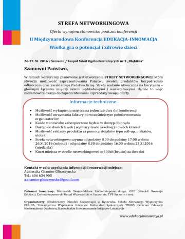 STREFA NETWORKINGOWA Oferta wynajmu stanowiska podczas konferencji II Międzynarodowa Konferencja EDUKACJA-INNOWACJA Wielka gra o potencjał i zdrowie dzieci 26-27. XI. 2016 / Szczecin / Zespół Szkół Ogólnokształcących nr 3 ,,Błękitna” Szanowni Państwo, W ramach konferencji planowane jest utworzenie STREFY NETWORKINGOWEJ, która stworzy możliwość zaprezentowania Państwu swoich produktów bezpośrednio odbiorcom oraz zareklamuje Państwa firmę. Strefa zostanie utworzona na korytarzu – głównym łączniku między salami wykładowymi i warsztatowymi. Będzie to więc niesamowita okazja do zaprezentowania i sprzedaży swojej oferty. Informacje techniczne: Możliwość wykupienia miejsca na jeden lub dwa dni konferencji Możliwość otrzymania faktury po wcześniejszym poinformowaniu organizatorów Każde stanowisko zabezpieczone będzie w dostęp do prądu Dostęp do dwóch ławek (wymiary ławki szkolnej) i dwóch krzeseł Możliwość reklamy produktu za pomocą stojaków typu roll-up, plakatów, ulotek Strefa networkingowa czynna od godziny 8.00 do godziny 17.00 w dniu 26.XI.2016 (sobota) i od godziny 8.30 do godziny 16.00 w dniu 27.XI.2016 (niedziela) Koszt miejsca w strefie networkingowej to 400zł (brutto) za dwa dni Kontakt w celu uzyskania informacji i rezerwacji miejsca: Agnieszka Chamier Gliszczynska Tel.: 606 634 905 [email protected] Patronat honorowy: Marszałek Województwa Zachodniopomorskiego, ORE Ośrodek Rozwoju Edukacji, Zachodniopomorski Urząd Wojewódzki w Szczecinie, TVP Szczecin i inni. Organizatorzy: Młodzieżowy Ośrodek Socjoterapii w Ryszewku, Szkoła Aktywnego Wypoczynku FRAJDA, Towarzystwo Wspierania Inicjatyw Kulturalno Społecznych TWIKS, Centrum Edukacji Nieformalnej i Outdooru, Sławęcińskie Stowarzyszenie Inicjatyw Lokalnych www.edukacjainnowacja.pl