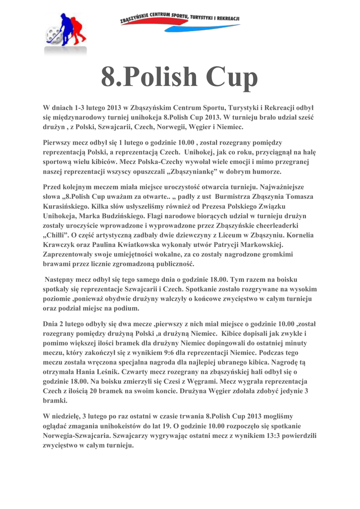 8.Polish Cup W dniach 1-3 lutego 2013 w Zbąszyńskim Centrum Sportu, Turystyki i Rekreacji odbył się międzynarodowy turniej unihokeja 8.Polish Cup 2013. W turnieju brało udział sześć drużyn , z Polski, Szwajcarii, Czech, Norwegii, Węgier i Niemiec. Pierwszy mecz odbył się 1 lutego o godzinie 10.00 , został rozegrany pomiędzy reprezentacją Polski, a reprezentacją Czech. Unihokej, jak co roku, przyciągnął na halę sportową wielu kibiców. Mecz Polska-Czechy wywołał wiele emocji i mimo przegranej naszej reprezentacji wszyscy opuszczali „Zbąszyniankę” w dobrym humorze. Przed kolejnym meczem miała miejsce uroczystość otwarcia turnieju. Najważniejsze słowa „8.Polish Cup uważam za otwarte.. „ padły z ust Burmistrza Zbąszynia Tomasza Kurasińskiego. Kilka słów usłyszeliśmy również od Prezesa Polskiego Związku Unihokeja, Marka Budzińskiego. Flagi narodowe biorących udział w turnieju drużyn zostały uroczyście wprowadzone i wyprowadzone przez Zbąszyńskie cheerleaderki „Chilli”. O część artystyczną zadbały dwie dziewczyny z Liceum w Zbąszyniu. Kornelia Krawczyk oraz Paulina Kwiatkowska wykonały utwór Patrycji Markowskiej. Zaprezentowały swoje umiejętności wokalne, za co zostały nagrodzone gromkimi brawami przez licznie zgromadzoną publiczność. Następny mecz odbył się tego samego dnia o godzinie 18.00. Tym razem na boisku spotkały się reprezentacje Szwajcarii i Czech. Spotkanie zostało rozgrywane na wysokim poziomie ,ponieważ obydwie drużyny walczyły o końcowe zwycięstwo w całym turnieju oraz podział miejsc na podium. Dnia 2 lutego odbyły się dwa mecze ,pierwszy z nich miał miejsce o godzinie 10.00 ,został rozegrany pomiędzy drużyną Polski ,a drużyną Niemiec. Kibice dopisali jak zwykle i pomimo większej ilości bramek dla drużyny Niemiec dopingowali do ostatniej minuty meczu, który zakończył się z wynikiem 9:6 dla reprezentacji Niemiec. Podczas tego meczu została wręczona specjalna nagroda dla najlepiej ubranego kibica. Nagrodę tą otrzymała Hania Leśnik. Czwarty mecz rozegrany na zbąszyńskiej hali odbył się o godzinie 18.00. Na boisku zmierzyli się Czesi z Węgrami. Mecz wygrała reprezentacja Czech z ilością 20 bramek na swoim koncie. Drużyna Węgier zdołała zdobyć jedynie 3 bramki. W niedzielę, 3 lutego po raz ostatni w czasie trwania 8.Polish Cup 2013 mogliśmy oglądać zmagania unihokeistów do lat 19. O godzinie 10.00 rozpoczęło się spotkanie Norwegia-Szwajcaria. Szwajcarzy wygrywając ostatni mecz z wynikiem 13:3 powierdzili zwycięstwo w całym turnieju. Końcowa klasyfikacja drużyn wyglądała następująco : Poz Drużyna Bramki Pkt 1 Szwajcaria 69 - 16 10 2 Czechy 63 - 22 8 3 Norwegia 36 - 40 6 4 Niemcy 37 - 49 4 5 Polska 18 - 41 2 6 Węgry 18 - 73 0 Po raz drugi podczas trwania turnieju unihokejowego organizowany był konkurs dla kibiców przychodzących na mecze odbywające się w „Zbąszyniance”. Wystarczyło zebrać trzy pieczątki, które były potwierdzeniem obecności na meczu, a specjalny kupon wrzucony do urny brał udział w losowaniu nagrody głównej, którą był telewizor marki Samsung. Nagrodę ufundowały dwie firmy z gminy Zbąszyń, firma Mercor oraz Ardom. Wylosowane zostały dwie nagrody pocieszenia. Zwycięski kupon wylosował zawodnik drużyny Szwajcarii. Nowym właścicielem telewizora okazał się Pan Jan Leśnik ze Zbąszynia. Po zakończeniu wszystkich meczy przyszedł czas na podsumowanie kolejnej edycji konkursu „Przyjazny Kibic”. Na pierwsze miejsce bez wątpienia zasłużyli kibice Szwajcarii ze zbąszyńskiego Gimnazjum. Za wspaniały doping zawodnicy odwdzięczali się po każdym meczu , dziękując kibicom za wsparcie. Przy odbiorze nagrody kibice spotkali się z zawodnikami na płycie boiska. Było widać ogromną radość ,razem odśpiewali charakterystyczny okrzyk, dziękując sobie nawzajem. W tym konkursie drugie miejsce zdobyli kibice Norwegii z ZSP w Chrośnicy. Na trzecim miejscu znaleźli się kibice reprezentacji Czech z Gimnazjum w Zbąszyniu. Kolejne miejsca należały do klas kibicujących zespołom Niemiec, Węgier oraz Polski. Przerwy pomiędzy tercjami umilały swoimi występami Cheerleaderki z Zbąszyńskiego Gimnazjum pod kierunkiem Pani Joli Borkowskiej oraz Zespół Taneczny REGO, która prowadzi Pani Regina Gołek. Również na przerwach organizowane były konkursy dla kibiców przybyły na turniej. Konkursy przeprowadziła Ania Szajek. W organizacji imprezy pomogli wolontariusze : UCZNIOWE ZBĄSZYŃSKIEGO LICEUM ORAZ KLUBU SPORTOWEGO PKS MOS ZBĄSZYŃ Bez nich ta impreza wyglądałaby zupełnie inaczej. Serdeczne podziękowania należą się również kibicom za liczne przybycie. Zbąszyńskie Centrum Sportu, Turystyki i Rekreacji serdecznie zaprasza na kolejny turniej unihokeja Polish Open 2013, który odbędzie się już we wrześniu 2013 roku.