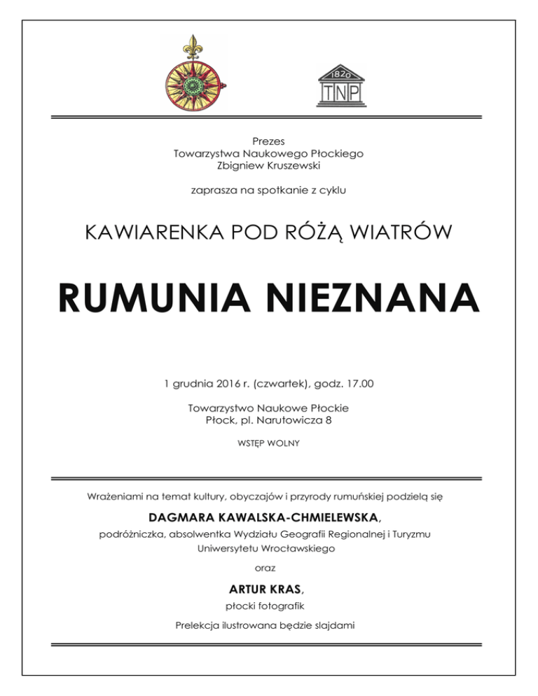 Prezes Towarzystwa Naukowego Płockiego Zbigniew Kruszewski zaprasza na spotkanie z cyklu KAWIARENKA POD RÓŻĄ WIATRÓW RUMUNIA NIEZNANA 1 grudnia 2016 r. (czwartek), godz. 17.00 Towarzystwo Naukowe Płockie Płock, pl. Narutowicza 8 WSTĘP WOLNY Wrażeniami na temat kultury, obyczajów i przyrody rumuńskiej podzielą się DAGMARA KAWALSKA-CHMIELEWSKA, podróżniczka, absolwentka Wydziału Geografii Regionalnej i Turyzmu Uniwersytetu Wrocławskiego oraz ARTUR KRAS, płocki fotografik Prelekcja ilustrowana będzie slajdami