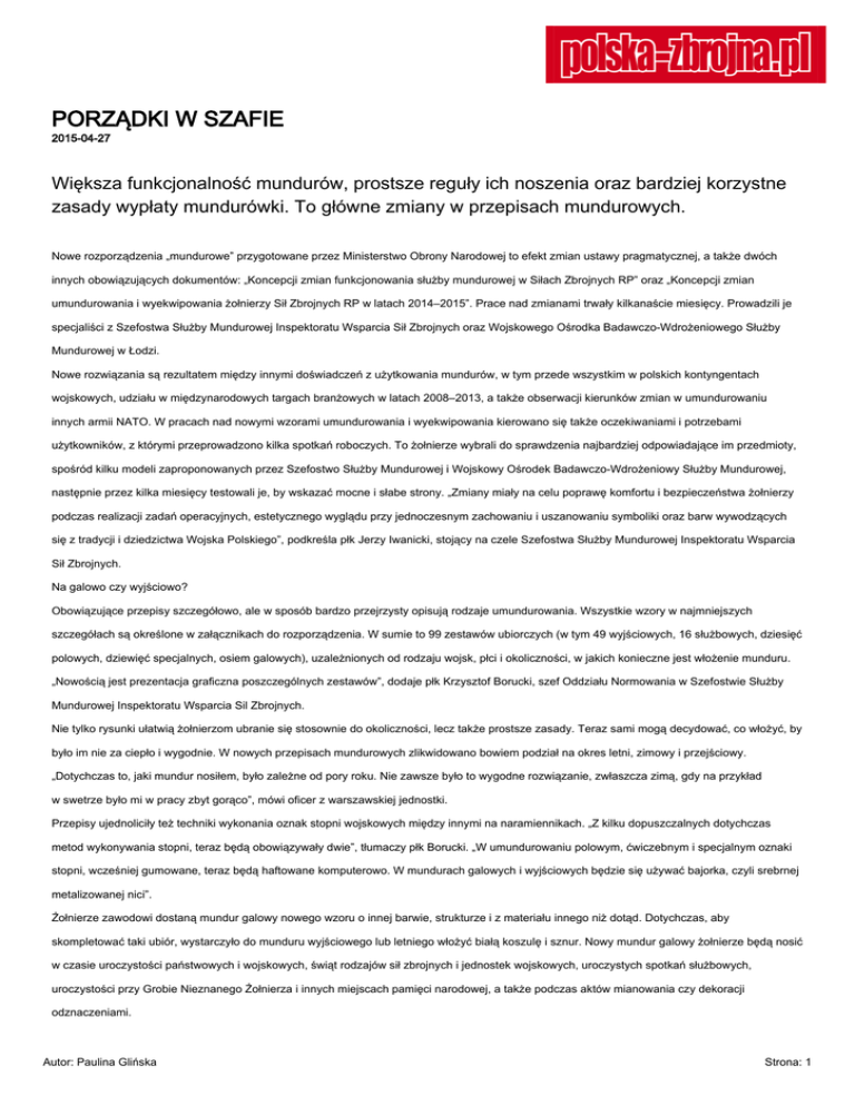 PORZĄDKI W SZAFIE 2015-04-27 Większa funkcjonalność mundurów, prostsze reguły ich noszenia oraz bardziej korzystne zasady wypłaty mundurówki. To główne zmiany w przepisach mundurowych. Nowe rozporządzenia „mundurowe” przygotowane przez Ministerstwo Obrony Narodowej to efekt zmian ustawy pragmatycznej, a także dwóch innych obowiązujących dokumentów: „Koncepcji zmian funkcjonowania służby mundurowej w Siłach Zbrojnych RP” oraz „Koncepcji zmian umundurowania i wyekwipowania żołnierzy Sił Zbrojnych RP w latach 2014–2015”. Prace nad zmianami trwały kilkanaście miesięcy. Prowadzili je specjaliści z Szefostwa Służby Mundurowej Inspektoratu Wsparcia Sił Zbrojnych oraz Wojskowego Ośrodka Badawczo-Wdrożeniowego Służby Mundurowej w Łodzi. Nowe rozwiązania są rezultatem między innymi doświadczeń z użytkowania mundurów, w tym przede wszystkim w polskich kontyngentach wojskowych, udziału w międzynarodowych targach branżowych w latach 2008–2013, a także obserwacji kierunków zmian w umundurowaniu innych armii NATO. W pracach nad nowymi wzorami umundurowania i wyekwipowania kierowano się także oczekiwaniami i potrzebami użytkowników, z którymi przeprowadzono kilka spotkań roboczych. To żołnierze wybrali do sprawdzenia najbardziej odpowiadające im przedmioty, spośród kilku modeli zaproponowanych przez Szefostwo Służby Mundurowej i Wojskowy Ośrodek Badawczo-Wdrożeniowy Służby Mundurowej, następnie przez kilka miesięcy testowali je, by wskazać mocne i słabe strony. „Zmiany miały na celu poprawę komfortu i bezpieczeństwa żołnierzy podczas realizacji zadań operacyjnych, estetycznego wyglądu przy jednoczesnym zachowaniu i uszanowaniu symboliki oraz barw wywodzących się z tradycji i dziedzictwa Wojska Polskiego”, podkreśla płk Jerzy Iwanicki, stojący na czele Szefostwa Służby Mundurowej Inspektoratu Wsparcia Sił Zbrojnych. Na galowo czy wyjściowo? Obowiązujące przepisy szczegółowo, ale w sposób bardzo przejrzysty opisują rodzaje umundurowania. Wszystkie wzory w najmniejszych szczegółach są określone w załącznikach do rozporządzenia. W sumie to 99 zestawów ubiorczych (w tym 49 wyjściowych, 16 służbowych, dziesięć polowych, dziewięć specjalnych, osiem galowych), uzależnionych od rodzaju wojsk, płci i okoliczności, w jakich konieczne jest włożenie munduru. „Nowością jest prezentacja graficzna poszczególnych zestawów”, dodaje płk Krzysztof Borucki, szef Oddziału Normowania w Szefostwie Służby Mundurowej Inspektoratu Wsparcia Sil Zbrojnych. Nie tylko rysunki ułatwią żołnierzom ubranie się stosownie do okoliczności, lecz także prostsze zasady. Teraz sami mogą decydować, co włożyć, by było im nie za ciepło i wygodnie. W nowych przepisach mundurowych zlikwidowano bowiem podział na okres letni, zimowy i przejściowy. „Dotychczas to, jaki mundur nosiłem, było zależne od pory roku. Nie zawsze było to wygodne rozwiązanie, zwłaszcza zimą, gdy na przykład w swetrze było mi w pracy zbyt gorąco”, mówi oficer z warszawskiej jednostki. Przepisy ujednoliciły też techniki wykonania oznak stopni wojskowych między innymi na naramiennikach. „Z kilku dopuszczalnych dotychczas metod wykonywania stopni, teraz będą obowiązywały dwie”, tłumaczy płk Borucki. „W umundurowaniu polowym, ćwiczebnym i specjalnym oznaki stopni, wcześniej gumowane, teraz będą haftowane komputerowo. W mundurach galowych i wyjściowych będzie się używać bajorka, czyli srebrnej metalizowanej nici”. Żołnierze zawodowi dostaną mundur galowy nowego wzoru o innej barwie, strukturze i z materiału innego niż dotąd. Dotychczas, aby skompletować taki ubiór, wystarczyło do munduru wyjściowego lub letniego włożyć białą koszulę i sznur. Nowy mundur galowy żołnierze będą nosić w czasie uroczystości państwowych i wojskowych, świąt rodzajów sił zbrojnych i jednostek wojskowych, uroczystych spotkań służbowych, uroczystości przy Grobie Nieznanego Żołnierza i innych miejscach pamięci narodowej, a także podczas aktów mianowania czy dekoracji odznaczeniami. Autor: Paulina Glińska Strona: 1 Zakończyły się już badania użytkowe (testowanie w warunkach rzeczywistych) nowego munduru galowego, w czasie których uzyskał on pozytywne oceny. Nowo powoływani do służby pierwszy taki mundur dostaną z wojska. Ci, którzy już służą, będą go mogli kupić w ramach otrzymywanej corocznie mundurówki. Jak przyznają przedstawiciele Inspektoratu Wsparcia Sił Zbrojnych, jeśli zakupy umundurowania pójdą zgodnie z planem, nowe mundury galowe jeszcze w tym roku otrzymają tegoroczni absolwenci szkół oficerskich i akademii wojskowych. Sporo zmian w przepisach dotyczy munduru wyjściowego. Żołnierze dostaną kurtki wykonane z materiałów o lepszych parametrach termoi hydroizolacyjnych, w których zastosowano nowe rozwiązania konstrukcyjno-materiałowe. W odróżnieniu od dotychczasowych, będą one miały dopinany kaptur. Spodnie wyjściowe z kolei zostaną wykonane z materiałów o wyższej niż obecne odporności na zagniecenia. „Część należności mundurowych została zastąpiona innymi. Zamiast dwóch płaszczy: letniego i sukiennego, żołnierz będzie miał w wyposażeniu jeden – całoroczny. W nowym wzorze będzie też sweter wojskowy”, wyjaśnia płk Iwanicki. Zmianom poddano również ubranie ochronne i zasobnik piechoty górskiej. Zastosowano między innymi profilowane rękawy, zamykane na zamek błyskawiczny otwory wentylacyjne pod pachami oraz ocieplacz z tkaniny typu windstopper, wykonany, nie jak dotychczas w czarnym, lecz w oliwkowym kolorze – ma to poprawić nie tylko właściwości użytkowe, lecz także maskowanie. Nowy zasobnik jest wykonany w jednym rodzaju kamuflażu (pantera) i ma trzy pokrowce w kamuflażach pustynnym, zimowym i pantera. Mają one nie tylko zapewnić maskowanie, lecz także zwiększyć odporność na prze