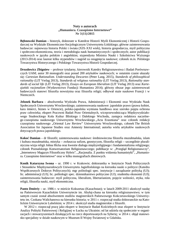 Noty o autorach „Humaniora. Czasopismo Internetowe” Nr 3 (11)/2015 Bębnowski Damian – historyk, doktorant w Katedrze Historii Myśli Ekonomicznej i Historii Gospodarczej na Wydziale Ekonomiczno-Socjologicznym Uniwersytetu Łódzkiego; główne zainteresowania badawcze: najnowsza historia Polski i świata (XIX-XXI wiek), historia gospodarcza, myśl polityczna i społeczno-ekonomiczna, teoria i metodologia nauk humanistycznych i społecznych; autor publikacji naukowych w języku polskim i angielskim; stypendysta Ministra Nauki i Szkolnictwa Wyższego (2013-2014) oraz laureat kilku stypendiów i nagród za osiągnięcia naukowe; członek m.in. Polskiego Towarzystwa Historycznego i Polskiego Towarzystwa Historii Gospodarczej. Drozdowicz Zbigniew – profesor tytularny, kierownik Katedry Religioznawstwa i Badań Porównawczych UAM; autor 30 monografii oraz ponad 200 artykułów naukowych; w ostatnim czasie ukazały się: Cartesian Rationalism. Understanding Descartes (Peter Lang, 2015), Standards of philosophical rationality (LIT Verlag 2013), Standards of religious rationality (LIT Verlag 2013), Rationality standards of social life (LIT Verlag 2013), Essays on European liberalism (LIT Verlag 2013) oraz Kartezjański racjonalizm (Wydawnictwo Fundacji Humaniora 2014); główny obszar jego zainteresowań badawczych stanowi filozofia nowożytna oraz filozofia religii; odbywał staże naukowe Francji i w Niemczech. Jelonek Barbara – absolwentka Wydziału Prawa, Administracji i Ekonomii oraz Wydziału Nauk Społecznych Uniwersytetu Wrocławskiego; zainteresowania naukowe: japońskie prawo (prawa kobiet, kara śmierci, biznes w Oriencie), polsko-japońska wymiana handlowa oraz szeroko pojęta ochrona praw człowieka; ekspert Pracowni Badań Praw Orientalnych, wiceprzewodnicząca Międzywydziałowego Studenckiego Koła Kultur Bliskiego i Dalekiego Wschodu, zastępca redaktora naczelnego czasopisma naukowego Uniwersytetu Wrocławskiego „Acta Erasmiana” oraz członek redakcji czasopisma naukowego „Oriental Law Review” Uniwersytetu Wrocławskiego, członek The British Association for Japanese Studies oraz Amnesty International; autorka wielu artykułów naukowych dotyczących prawa japońskiego. Kokoć Damian – dr filozofii; zainteresowania naukowe: średniowieczna filozofia muzułmańska, islam i kultura muzułmańska, mistyka – zwłaszcza sufizm, gnostycyzm, filozofia religii – szczególnie pluralistyczna wizja religii Johna Hicka oraz kwestie dialogu międzyreligijnego i fundamentalizmu religijnego; członek Poznańskiego Konwersatorium Religioznawczego; publikacje w: „Przegląd Religioznawczy”, „Internetowy Magazyn Filozoficzny Hybris”, „Racjonalia. Z punktu widzenia humanistyki”, „Humaniora. Czasopismo Internetowe” oraz w kilku monografiach zbiorowych. Konik Katarzyna Iwona – ur. 1990 r. w Krakowie; doktorantka w Instytucie Nauk Politycznych i Stosunków Międzynarodowych Uniwersytetu Jagiellońskiego na kierunku nauki o polityce (Katedra Współczesnych Doktryn Politycznych); mgr politologii spec. instytucje i zarządzanie polityką (UJ); lic. administracji (UJ); lic. politologii spec. dziennikarstwo polityczne (UJ); studentka ekonomii (UJ); zainteresowania badawcze: myśl polityczna, liberalizm, libertarianizm, pojęcie wolności, etyka, rola religii, filozofia nauki, myśl ekonomiczna. Panto Dmitriy – ur. 1986 r. w mieście Kokszetau (Kazachstan); w latach 2009-2011 ukończył naukę na Państwowym Kazachskim Uniwersytecie im. Abyłaj-chana na kierunku religioznawstwo; w tym samym czasie został absolwentem studiów magisterskich Państwowego Kokczetawskiego Uniwersytetu im. Czokana Walichanowa na kierunku historia; w 2011 r. rozpoczął studia doktoranckie na Katolickim Uniwersytecie Lubelskim; w 2014 r. skończył studia magisterskie z filozofii. W 2012 r. rozpoczął pracę jako ekspert w Instytucie Badań Kościelnych oraz ekspert w Instytucie Analizy Polityki Państwowej i Religijnej w Łucku na Ukrainie; od lat udziela się społecznie w organizacjach i stowarzyszeniach działających na rzecz deportowanych na Syberię; w 2014 r. objął stanowisko specjalisty w dziale naukowym w Muzeum II Wojny Światowej w Gdańsku. Wnuk Marcin – absolwent psychologii UAM w Poznaniu, obecnie związany z Zakładem Psychologii Pracy i Organizacji w Instytucie Psychologii UAM; autor i współautor ponad 60 recenzowanych publikacji naukowych; zainteresowania badawcze: psychologia pracy i organizacji, psychologia religii, psychologia uzależnień oraz psychologia pozytywna.