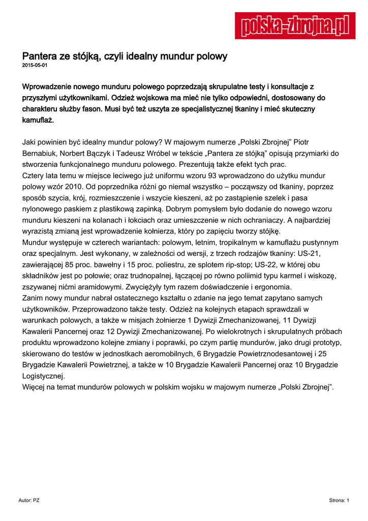 Pantera ze stójką, czyli idealny mundur polowy 2015-05-01 Wprowadzenie nowego munduru polowego poprzedzają skrupulatne testy i konsultacje z przyszłymi użytkownikami. Odzież wojskowa ma mieć nie tylko odpowiedni, dostosowany do charakteru służby fason. Musi być też uszyta ze specjalistycznej tkaniny i mieć skuteczny kamuflaż. Jaki powinien być idealny mundur polowy? W majowym numerze „Polski Zbrojnej” Piotr Bernabiuk, Norbert Bączyk i Tadeusz Wróbel w tekście „Pantera ze stójką” opisują przymiarki do stworzenia funkcjonalnego munduru polowego. Prezentują także efekt tych prac. Cztery lata temu w miejsce leciwego już uniformu wzoru 93 wprowadzono do użytku mundur polowy wzór 2010. Od poprzednika różni go niemal wszystko – począwszy od tkaniny, poprzez sposób szycia, krój, rozmieszczenie i wszycie kieszeni, aż po zastąpienie szelek i pasa nylonowego paskiem z plastikową zapinką. Dobrym pomysłem było dodanie do nowego wzoru munduru kieszeni na kolanach i łokciach oraz umieszczenie w nich ochraniaczy. A najbardziej wyrazistą zmianą jest wprowadzenie kołnierza, który po zapięciu tworzy stójkę. Mundur występuje w czterech wariantach: polowym, letnim, tropikalnym w kamuflażu pustynnym oraz specjalnym. Jest wykonany, w zależności od wersji, z trzech rodzajów tkaniny: US-21, zawierającej 85 proc. bawełny i 15 proc. poliestru, ze splotem rip-stop; US-22, w której obu składników jest po połowie; oraz trudnopalnej, łączącej po równo poliimid typu karmel i wiskozę, zszywanej nićmi aramidowymi. Zwyciężyły tym razem doświadczenie i ergonomia. Zanim nowy mundur nabrał ostatecznego kształtu o zdanie na jego temat zapytano samych użytkowników. Przeprowadzono także testy. Odzież na kolejnych etapach sprawdzali w warunkach polowych, a także w misjach żołnierze 1 Dywizji Zmechanizowanej, 11 Dywizji Kawalerii Pancernej oraz 12 Dywizji Zmechanizowanej. Po wielokrotnych i skrupulatnych próbach produktu wprowadzono kolejne zmiany i poprawki, po czym partię mundurów, jako drugi prototyp, skierowano do testów w jednostkach aeromobilnych, 6 Brygadzie Powietrznodesantowej i 25 Brygadzie Kawalerii Powietrznej, a także w 10 Brygadzie Kawalerii Pancernej oraz 10 Brygadzie Logistycznej. Więcej na temat mundurów polowych w polskim wojsku w majowym numerze „Polski Zbrojnej”. Autor: PZ Strona: 1