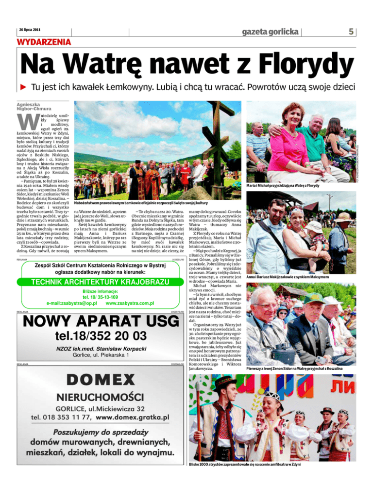 26 lipca 2011 gazeta gorlicka 5 WYDARZENIA Na Watrę nawet z Florydy b Tu jest ich kawałek Łemkowyny. Lubią i chcą tu wracać. Powrotów uczą swoje dzieci Agnieszka Nigbor-Chmura FOT. AGNIESZKANIGBOR-CHMURA(6) W niedzielę umilkły śpiewy i modlitwy, zgasł ogień 29. Łemkowskiej Watry w Zdyni, miejscu, które przez trzy dni było stolicą kultury i tradycji Łemków. Przyjechali ci, którzy nadal żyją na ziemiach swoich ojców z Beskidu Niskiego, Sądeckiego, ale i ci, których losy i trudna historia związana z Akcją Wisła rozrzuciły od Śląska aż po Koszalin, a także na Ukrainę. – Pamiętam, to był 28 kwietnia 1946 roku. Miałem wtedy osiem lat – wspomina Zenon Sidor, kiedyś mieszkaniec Woli Wołoskiej, dzisiaj Koszalina. – Rodzice dopiero co skończyli budować dom i wszystko trzeba było zostawić. Trzy tygodnie trwała podróż, w głodzie i strasznych warunkach. Przyznano nam mieszkanie, pokój z mają kuchnią – w sumie 25 m kw., w którym przez dwa lata mieszkały trzy rodziny, czyli 11 osób – opowiada. Z Koszalina przyjechał z rodziną. Gdy mówił, że zostają Maria i Michał przyjeżdżają na Watrę z Florydy Nabożeństwem prawosławnym Łemkowie oficjalnie rozpoczęli święto swojej kultury na Watrze do niedzieli, a potem jadą jeszcze do Woli, słowa utknęły mu w gardle. Swój kawałek Łemkowyny po latach na ziemi gorlickiej mają Anna i Dariusz Makijczakowie, którzy po raz pierwszy byli na Watrze ze swoim siedmiomiesięcznym synem Maksymem. – To chyba nasza 20. Watra. Obecnie mieszkamy w gminie Runda na Dolnym Śląsku, tam gdzie wysiedlono naszych rodziców. Moja rodzina pochodzi z Bartnego, męża z Czarnej i Boguszy. Kupiliśmy tu działkę, by mieć swój kawałek Łemkowyny. Na razie nic się na niej nie dzieje, ale cieszy, że REKLAMA 1033001/00 Zespół Szkół Centrum Kształcenia Rolniczego w Bystrej ogłasza dodatkowy nabór na kierunek: TECHNIK ARCHITEKTURY KRAJOBRAZU Bliższe infomacje: tel. 18/ 35-13-169 e-mail:[email protected] www.zsabystra.com.pl REKLAMA 1053970/00 NOWY APARAT USG tel.18/352 20 03 NZOZ lek.med. Stanisław Korpacki Gorlice, ul. Piekarska 1 REKLAMA 1053966/00 mamy do kogo wracać. Co roku spędzamy tu urlop, oczywiście w tym czasie, kiedy odbywa się Watra – tłumaczy Anna Makijczak. Z Florydy co roku na Watrę przyjeżdżają Maria i Michał Markowycz, małżeństwo z 50letnim stażem. – Mąż pochodzi z Krępnej, ja z Banicy. Poznaliśmy się w Zielonej Górze, gdy byliśmy już po szkole. Pobraliśmy się i zdecydowaliśmy o wyjeździe za ocean. Mamy trójkę dzieci, troje wnucząt, a czwarte jest w drodze – opowiada Maria. Michał Markowycz nie ukrywa emocji. – Ja bym tu wrócił, choćbym miał żyć o kromce suchego chleba, ale nie chcemy zostawić dzieci i wnuków. Teraz tam jest nasza rodzina, choć miejsce na ziemi – tylko tutaj – dodał. Organizatorzy 29. Watry już w tym roku zapowiedzieli, ze 30. z kolei spotkanie przy ognisku pasterskim będzie wyjątkowe, bo jubileuszowe. Już trwają starania, żeby odbyło się ono pod honorowym patronatem i z udziałem prezydentów Polski i Ukrainy – Bronisława Komorowskiego i Wiktora Janukowycza. Anna i Dariusz Makijczakowie z synkiem Maksymem Pierwszy z lewej Zenon Sidor na Watrę przyjechał z Koszalina Blisko 1000 atrystów zaprezentowało się na scenie amfiteatru w Zdyni