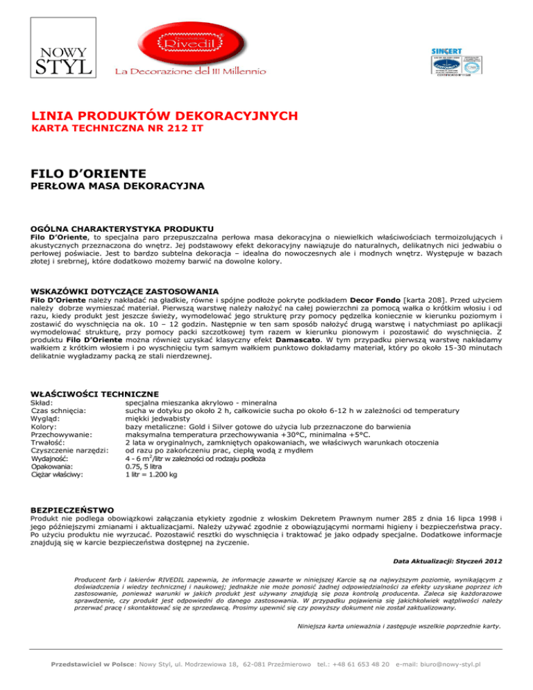 LINIA PRODUKTÓW DEKORACYJNYCH KARTA TECHNICZNA NR 212 IT FILO D’ORIENTE PERŁOWA MASA DEKORACYJNA OGÓLNA CHARAKTERYSTYKA PRODUKTU Filo D’Oriente, to specjalna paro przepuszczalna perłowa masa dekoracyjna o niewielkich właściwościach termoizolujących i akustycznych przeznaczona do wnętrz. Jej podstawowy efekt dekoracyjny nawiązuje do naturalnych, delikatnych nici jedwabiu o perłowej poświacie. Jest to bardzo subtelna dekoracja – idealna do nowoczesnych ale i modnych wnętrz. Występuje w bazach złotej i srebrnej, które dodatkowo możemy barwić na dowolne kolory. WSKAZÓWKI DOTYCZĄCE ZASTOSOWANIA Filo D’Oriente należy nakładać na gładkie, równe i spójne podłoże pokryte podkładem Decor Fondo [karta 208]. Przed użyciem należy dobrze wymieszać materiał. Pierwszą warstwę należy nałożyć na całej powierzchni za pomocą wałka o krótkim włosiu i od razu, kiedy produkt jest jeszcze świeży, wymodelować jego strukturę przy pomocy pędzelka koniecznie w kierunku poziomym i zostawić do wyschnięcia na ok. 10 – 12 godzin. Następnie w ten sam sposób nałożyć drugą warstwę i natychmiast po aplikacji wymodelować strukturę, przy pomocy packi szczotkowej tym razem w kierunku pionowym i pozostawić do wyschnięcia. Z produktu Filo D’Oriente można również uzyskać klasyczny efekt Damascato. W tym przypadku pierwszą warstwę nakładamy wałkiem z krótkim włosiem i po wyschnięciu tym samym wałkiem punktowo dokładamy materiał, który po około 15-30 minutach delikatnie wygładzamy packą ze stali nierdzewnej. WŁAŚCIWOŚCI TECHNICZNE Skład: Czas schnięcia: Wygląd: Kolory: Przechowywanie: Trwałość: Czyszczenie narzędzi: Wydajność: Opakowania: Ciężar właściwy: specjalna mieszanka akrylowo - mineralna sucha w dotyku po około 2 h, całkowicie sucha po około 6-12 h w zależności od temperatury miękki jedwabisty bazy metaliczne: Gold i Silver gotowe do użycia lub przeznaczone do barwienia maksymalna temperatura przechowywania +30°C, minimalna +5°C. 2 lata w oryginalnych, zamkniętych opakowaniach, we właściwych warunkach otoczenia od razu po zakończeniu prac, ciepłą wodą z mydłem 4 - 6 m2/litr w zależności od rodzaju podłoża 0.75, 5 litra 1 litr = 1.200 kg BEZPIECZEŃSTWO Produkt nie podlega obowiązkowi załączania etykiety zgodnie z włoskim Dekretem Prawnym numer 285 z dnia 16 lipca 1998 i jego późniejszymi zmianami i aktualizacjami. Należy używać zgodnie z obowiązującymi normami higieny i bezpieczeństwa pracy. Po użyciu produktu nie wyrzucać. Pozostawić resztki do wyschnięcia i traktować je jako odpady specjalne. Dodatkowe informacje znajdują się w karcie bezpieczeństwa dostępnej na życzenie. Data Aktualizacji: Styczeń 2012 Producent farb i lakierów RIVEDIL zapewnia, że informacje zawarte w niniejszej Karcie są na najwyższym poziomie, wynikającym z doświadczenia i wiedzy technicznej i naukowej; jednakże nie może ponosić żadnej odpowiedzialności za efekty uzyskane poprzez ich zastosowanie, ponieważ warunki w jakich produkt jest używany znajdują się poza kontrolą producenta. Zaleca się każdorazowe sprawdzenie, czy produkt jest odpowiedni do danego zastosowania. W przypadku pojawienia się jakichkolwiek wątpliwości należy przerwać pracę i skontaktować się ze sprzedawcą. Prosimy upewnić się czy powyższy dokument nie został zaktualizowany. Niniejsza karta unieważnia i zastępuje wszelkie poprzednie karty. Przedstawiciel w Polsce: Nowy Styl, ul. Modrzewiowa 18, 62-081 Przeźmierowo tel.: +48 61 653 48 20 e-mail: [email protected]