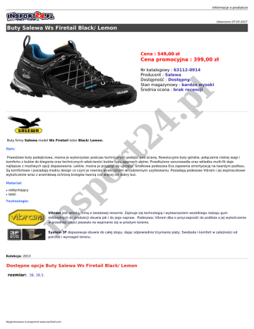 Informacje o produkcie Utworzono 07-03-2017 Buty Salewa Ws Firetail Black/ Lemon Cena : 549,00 zł Cena promocyjna : 399,00 zł sp or t2 4. p l Nr katalogowy : 63112-0914 Producent : Salewa Dostępność : Dostępny Stan magazynowy : bardzo wysoki Średnia ocena : brak recenzji Buty firmy Salewa model Ws Firetail kolor Black/ Lemon. Opis: Prawdziwe buty podejściowe, mozna je wykorzystac podczas technicznych podejść pod ścianę. Rewolucyjne buty górskie, połączenie niskiej wagi i komfortu z butów do biegania oraz technicznych właściwości butów typu approach alpine. Przedłużone sznurowadła oraz wkładka multi-fit daje najlepsze z mozliwych opcji dopasowania. Lekkie, mozna je przypiąć do uprzęzy. Środkowa podeszwa Eva zapewnia amortyzację na twardym podłozu. Są komfortowe i posiadają modny design co czyni je rowniez atrakcyjnymi w codziennym uzytkowaniu. Posiadają podeszwe Vibram i jej wspinaczkowe wykończenie wraz z aramidową ochroną brzegów tworzą coś więcej niz dobry but. Materiał: ● ● oddychający lekki Technologie: in Vibram jest włoską firmą o światowej renomie. Zajmuje się technologią i wytwarzaniem wszelkiego rodzaju gum niezbędnych do produkcji obuwia jak i do jego napraw. Podeszwa: Vibram dba o przyczepność do podłoża a jej wykończenie w przedniej części pozwala na wspinanie się w prostym terenie. System 3F dopasowuje obuwie do całej stopy, dając odpowiednie trzymanie pięty. Swoboda i komfort w zależności od potrzeb i wymagań terenu. Kolekcja: 2013 Dostępne opcje Buty Salewa Ws Firetail Black/ Lemon rozmiar: 38, 38.5. Wygenerowano w programie www.oscGold.com