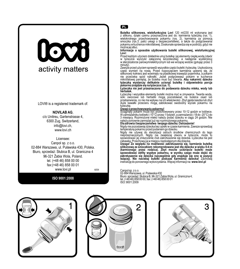 LOVI® is a registered trademark of: NOVILAB AG, c/o Unitreu, Gartenstrasse 4, 6300 Zug, Switzerland, [email protected], www.lovi.ch Licensee: Canpol sp. z o.o. 02-884 Warszawa, ul. Puławska 430, Polska. Biuro, sprzedaż: Słubica B, ul. Graniczna 4 96-321 Żabia Wola, Poland. tel. (+48 46) 858 00 00 fax:(+48 46) 858 00 01 k004 www.lovi.pl ISO 9001:2008 Butelka silikonowa, wielofunkcyjna Lovi 120 ml/230 ml wykonana jest z silikonu, dzięki czemu przeznaczona jest do: karmienia łyżeczką (rys. 1), wielokrotnego przechowywania pokarmu (rys. 2), karmienia za pomocą smoczka (rys.3; patrz uwagi o bezpieczeństwie), a także do podgrzewania pokarmu w kuchence mikrofalowej. Doskonale sprawdza się w podróży, gdyż nie można jej stłuc. Informacje o sposobie użytkowania butelki silikonowej, wielofunkcyjnej Lovi: Przed każdym użyciem dokładnie umyj butelkę i jej elementy ciepłą wodą (otwór w łyżeczce wyczyść załączoną szczoteczką), a następnie wysterylizuj w sterylizatorze parowym/elektrycznym lub we wrzącej wodzie (gotując przez 3 minuty). Zawsze przed użyciem sprawdź wszystkie części butelki i łyżeczkę. Uszkodzoną część wymień na nową. Przed rozpoczęciem karmienia upewnij się, że silikonowy kołnierz jest wywinięty na plastikowej krawędzi pojemnika, a pokarm nie przecieka spod nakrętki. Jeżeli podgrzewasz pokarm w kuchence mikrofalowej pamiętaj, że butelka musi być otwarta. Aby nakarmić dziecko łyżeczką wystarczy delikatnie ucisnąć butelkę i odpowiednia porcja pokarmu znajdzie się na łyżeczce (rys. 1) . Łyżeczka nie jest przeznaczona do podawania dziecku mleka, wody lub herbatek. Łyżeczkę i wszystkie elementy butelki można myć w zmywarce. Twarda woda, soki owocowe lub herbatki mogą pozostawiać na butelce osad lub przebarwienia, co nie ma wpływu na ich właściwości. Zbyt gęsta kaszka lub zbyt duże kawałki przecieru mogą zablokować swobodny wyciek pokarmu na łyżeczkę. Uwagi o przechowywaniu pokarmu! Ściągnięty pokarm może być przechowywany przez 10-12 godzin w lodówce. W zamrażalniku lodówki (-10°C) przez 1 tydzień, a zamrażarce (-18 do -20°C) do 3 miesięcy. Rozmrożone mleko należy podać dziecku w ciągu 24 godzin. Nie należy ponownie zamrażać już raz rozmrożonego pokarmu. Dla zdrowia i bezpieczeństwa twojego dziecka. Ostrzeżenie! Nigdy nie pozostawiaj dziecka bez opieki w czasie karmienia. Zawsze sprawdzaj temperaturę pokarmu przed podaniem go dziecku. Nigdy nie używaj do sterylizacji ostrych środków chemicznych do tego nieprzeznaczonych. Nigdy nie zwiększaj otworu w łyżeczce, może to spowodować jej zniszczenie i/lub zakrztuszenie się dziecka. Łyżeczka nie jest zabawką. Przechowuj ją w miejscu niedostępnym dla dziecka. Uwaga! Ze względu na możliwość zakrztuszenia się, karmienie butelką silikonową ze smoczkiem rekomendowane jest dla dziecka w wieku 0-4 m (karmionego przez rodzica). Zbyt mocne uciśnięcie butelki może spowodować obfity wypływ pokarmu, w wyniku czego może dojść do zakrztuszenie się dziecka (szczególnie gdy znajduje się ono w pozycji leżącej). Nie naciskaj butelki podczas karmienia dziecka! Zachowaj instrukcję do ponownego wykorzystania. Więcej informacji na: www.lovi.pl Canpol sp. z o.o. 02-884 Warszawa, ul. Puławska 430 Biuro: sprzedaż: Słubica B, 96-321 Żabia Wola, ul. Graniczna 4; tel. (+48 46) 858 00 00, fax: (+48 46) 858 00 01 ISO: 9001:2009