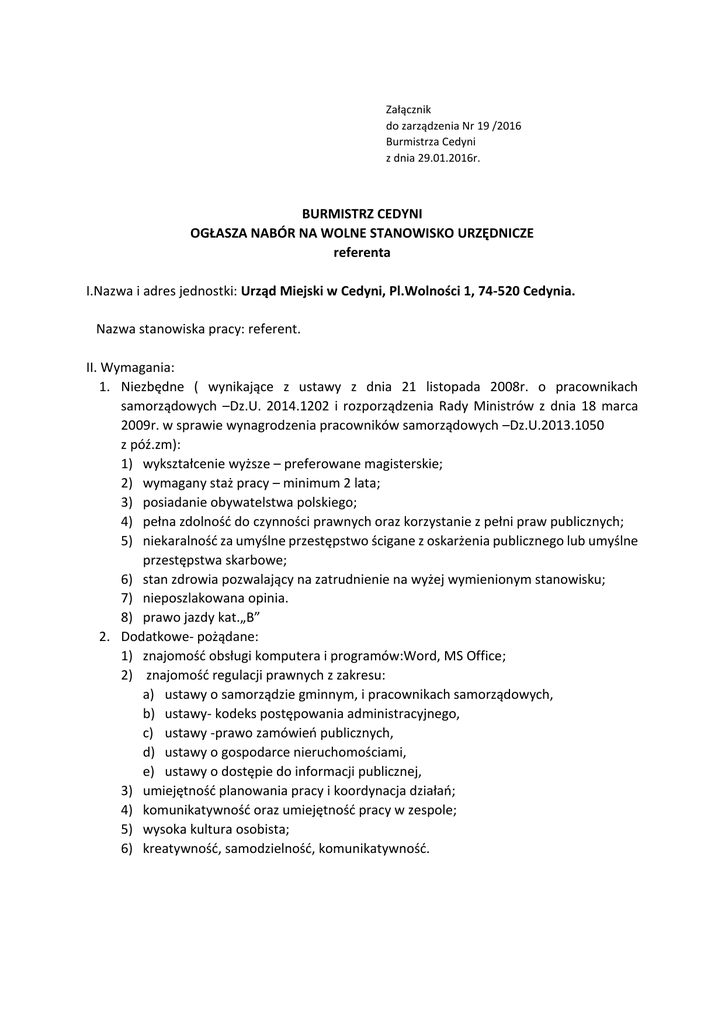 Załącznik do zarządzenia Nr 19 /2016 Burmistrza Cedyni z dnia 29.01.2016r. BURMISTRZ CEDYNI OGŁASZA NABÓR NA WOLNE STANOWISKO URZĘDNICZE referenta I.Nazwa i adres jednostki: Urząd Miejski w Cedyni, Pl.Wolności 1, 74-520 Cedynia. Nazwa stanowiska pracy: referent. II. Wymagania: 1. Niezbędne ( wynikające z ustawy z dnia 21 listopada 2008r. o pracownikach samorządowych –Dz.U. 2014.1202 i rozporządzenia Rady Ministrów z dnia 18 marca 2009r. w sprawie wynagrodzenia pracowników samorządowych –Dz.U.2013.1050 z póź.zm): 1) wykształcenie wyższe – preferowane magisterskie; 2) wymagany staż pracy – minimum 2 lata; 3) posiadanie obywatelstwa polskiego; 4) pełna zdolność do czynności prawnych oraz korzystanie z pełni praw publicznych; 5) niekaralność za umyślne przestępstwo ścigane z oskarżenia publicznego lub umyślne przestępstwa skarbowe; 6) stan zdrowia pozwalający na zatrudnienie na wyżej wymienionym stanowisku; 7) nieposzlakowana opinia. 8) prawo jazdy kat.„B” 2. Dodatkowe- pożądane: 1) znajomość obsługi komputera i programów:Word, MS Office; 2) znajomość regulacji prawnych z zakresu: a) ustawy o samorządzie gminnym, i pracownikach samorządowych, b) ustawy- kodeks postępowania administracyjnego, c) ustawy -prawo zamówień publicznych, d) ustawy o gospodarce nieruchomościami, e) ustawy o dostępie do informacji publicznej, 3) umiejętność planowania pracy i koordynacja działań; 4) komunikatywność oraz umiejętność pracy w zespole; 5) wysoka kultura osobista; 6) kreatywność, samodzielność, komunikatywność. III. Zakres wykonywanych zadań na stanowisku: 1) prowadzenie spraw związanych ze sprzedażą, oddaniem w użytkowanie wieczyste w drodze przetargu lub w trybie bezprzetargowym nieruchomości gminnych; 2) prowadzenie spraw związanych ze sprzedażą komunalnych lokali mieszkalnych i użytkowych na rzecz ich najemców; 3) prowadzenie spraw związanych ze służebnościami, zamianą, darowizną nieruchomości komunalnych; 4) prowadzenie spraw związanych z nieodpłatnym nabyciem bądź wykupem nieruchomości na potrzeby realizacji zadań własnych gminy; 5) współpraca w zakresie prowadzenia spraw związanych z najmem i dzierżawą nieruchomości należących do zasobu gminy na cele inne niż cele rolne, ogródki i podwórka przydomowe, przydomowe budynki i pomieszczenia gospodarcze; 6) regulowanie stanu prawnego nieruchomości komunalnych, zakładanie i wprowadzanie zmian w Księgach Wieczystych prowadzonych dla nieruchomości gminnych; 7) prowadzenie spraw związanych z aktualizacją geodezyjną dotyczącą nieruchomości komunalnych, zmianą danych objętych ewidencją gruntów i budynków; 8) prowadzenie egzekucji sądowej należności niepodatkowych; 9) prowadzenie obsługi Społecznej Komisji Mieszkaniowej; 10) prowadzenie spraw dotyczących pozyskiwania dotacji z budżetu gminy oraz z innych źródeł pozabudżetowych, w tym pochodzących ze źródeł krajowych i programów UE; 11) realizowanie obowiązków nałożonych na organy administracji w ustawie o dostępie do informacji publicznej. IV. Informacja o warunkach pracy na stanowisku: Praca w pełnym wymiarze czasu pracy ( 40 godzin tygodniowo), w siedzibie Urzędu i poza Urzędem, związana z obsługą komputera powyżej 4 godzin dziennie. W budynku jednostki są bezpieczne warunki pracy z występowaniem barier architektonicznych. Budynek piętrowy, niedostosowany dla osób poruszających się na wózkach inwalidzkich. Stanowisko pracy na I piętrze. V. Wskaźnik zatrudnienia osób niepełnosprawnych w grudniu 2015r. – 0%. VI. Wymagane dokumenty: 1) list motywacyjny; 2) CV z dokładnym opisem przebiegu pracy zawodowej; 3) kwestionariusz osobowy; 4) kopie dokumentów potwierdzających staż pracy; 5) aktualne zaświadczenie o stanie zdrowia; 6) kopie dokumentów potwierdzających kwalifikacje i wykształcenie zawodowe; 7) oświadczenie kandydata o niekaralności za przestępstwo popełnione umyślnie z oskarżenia publicznego lub umyślne przestępstwo skarbowe; 8) oświadczenie kandydata o posiadaniu pełnej zdolności do czynności prawnych oraz o korzystaniu z pełni praw publicznych; 9) kopia dowodu osobistego lub innego dokumentu, potwierdzającego tożsamość oraz poświadczającego obywatelstwo kandydata; 10) kandydat, który zamierza skorzystać z uprawnienia, o którym mowa w art. 13aust.2 ustawy z dnia 21 listopada 2008r. o pracownikach samorządowych (Dz.U.2014.1202) jest zobowiązany do złożenia kopii dokumentu potwierdzającego niepełnosprawność. Dokumenty aplikacyjne: list motywacyjny, CV powinny być opatrzone klauzulą: „Wyrażam zgodę na przetwarzanie moich danych osobowych dla potrzeb niezbędnych do realizacji procesu rekrutacji zgodnie z ustawą z dnia 29 sierpnia 1997r. o ochronie danych osobowych ( Dz.U.2014.1182 z póź.zm.) oraz ustawą z dnia 21 listopada 2008r. o pracownikach samorządowych (Dz.U.2014.1202). Wymagane dokumenty aplikacyjne należy składać lub przesłać w terminie do dnia 15 lutego 2016r. do godz.16.00 na adres: Urząd Miejski w Cedyni, Pl.Wolności 1, 74-520 Cedynia, w zamkniętej kopercie, z adresem kandydata i z dopiskiem: „Nabór na stanowisko referenta ”. Aplikacje, które wpłyną do Urzędu po upływie wyżej określonego terminu nie będą rozpatrywane. Otwarcie ofert nastąpi w Urzędzie Miejskim w Cedyni w dniu 16 stycznia 2016r. o godz. 14.00, w sali posiedzeń. Z Regulaminem naboru można zapoznać się w Urzędzie Miejskim w Cedyni Pl.Wolności 1, pokój nr 1 oraz na stronie internetowej BIP ( www.bip.cedynia.pl). Dodatkowe informacje można uzyskać pod numerem telefonu: 91 4 317 819. Lista kandydatów spełniających wymogi formalne i dopuszczonych do II etapu wraz z terminem rozmowy kwalifikacyjnej zostanie ogłoszona w BIP-ie. Informacja o wynikach naboru będzie umieszczona na stronie internetowej Biuletynu Informacji Publicznej ( www.bip.cedynia.pl) oraz na tablicy informacyjnej Urzędu