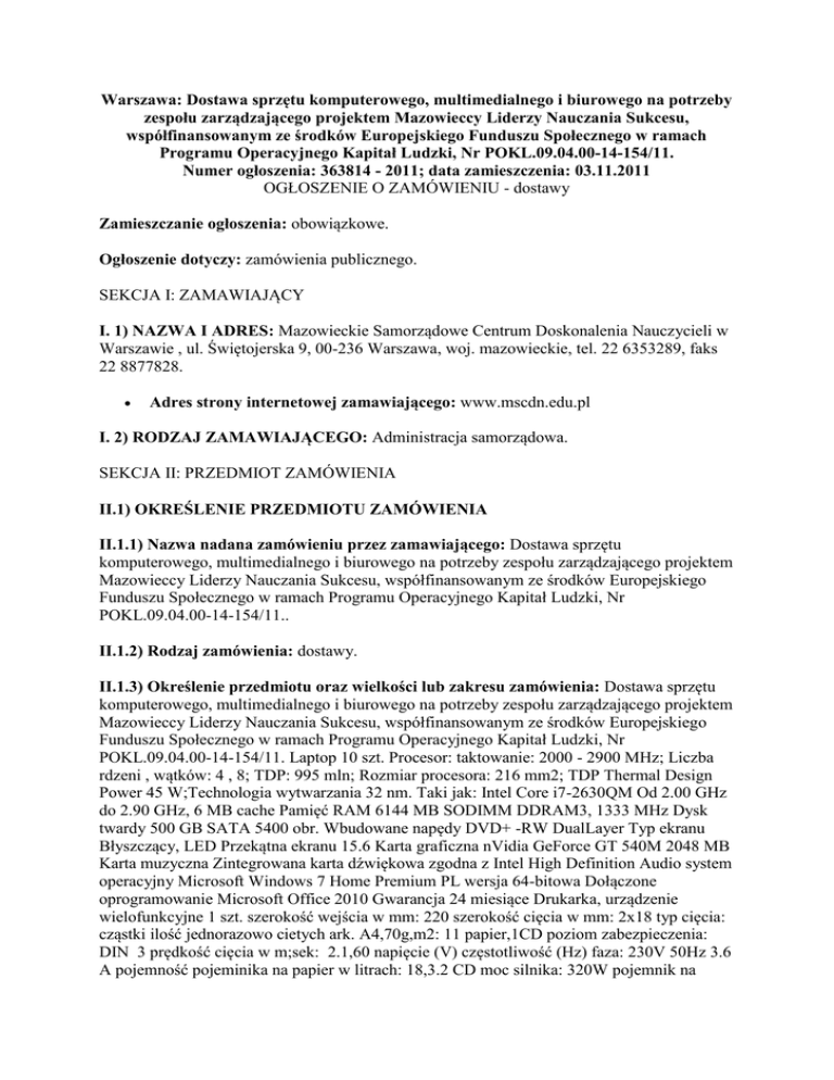 Warszawa: Dostawa sprzętu komputerowego, multimedialnego i biurowego na potrzeby zespołu zarządzającego projektem Mazowieccy Liderzy Nauczania Sukcesu, współfinansowanym ze środków Europejskiego Funduszu Społecznego w ramach Programu Operacyjnego Kapitał Ludzki, Nr POKL.09.04.00-14-154/11. Numer ogłoszenia: 363814 - 2011; data zamieszczenia: 03.11.2011 OGŁOSZENIE O ZAMÓWIENIU - dostawy Zamieszczanie ogłoszenia: obowiązkowe. Ogłoszenie dotyczy: zamówienia publicznego. SEKCJA I: ZAMAWIAJĄCY I. 1) NAZWA I ADRES: Mazowieckie Samorządowe Centrum Doskonalenia Nauczycieli w Warszawie , ul. Świętojerska 9, 00-236 Warszawa, woj. mazowieckie, tel. 22 6353289, faks 22 8877828. Adres strony internetowej zamawiającego: www.mscdn.edu.pl I. 2) RODZAJ ZAMAWIAJĄCEGO: Administracja samorządowa. SEKCJA II: PRZEDMIOT ZAMÓWIENIA II.1) OKREŚLENIE PRZEDMIOTU ZAMÓWIENIA II.1.1) Nazwa nadana zamówieniu przez zamawiającego: Dostawa sprzętu komputerowego, multimedialnego i biurowego na potrzeby zespołu zarządzającego projektem Mazowieccy Liderzy Nauczania Sukcesu, współfinansowanym ze środków Europejskiego Funduszu Społecznego w ramach Programu Operacyjnego Kapitał Ludzki, Nr POKL.09.04.00-14-154/11.. II.1.2) Rodzaj zamówienia: dostawy. II.1.3) Określenie przedmiotu oraz wielkości lub zakresu zamówienia: Dostawa sprzętu komputerowego, multimedialnego i biurowego na potrzeby zespołu zarządzającego projektem Mazowieccy Liderzy Nauczania Sukcesu, współfinansowanym ze środków Europejskiego Funduszu Społecznego w ramach Programu Operacyjnego Kapitał Ludzki, Nr POKL.09.04.00-14-154/11. Laptop 10 szt. Procesor: taktowanie: 2000 - 2900 MHz; Liczba rdzeni , wątków: 4 , 8; TDP: 995 mln; Rozmiar procesora: 216 mm2; TDP Thermal Design Power 45 W;Technologia wytwarzania 32 nm. Taki jak: Intel Core i7-2630QM Od 2.00 GHz do 2.90 GHz, 6 MB cache Pamięć RAM 6144 MB SODIMM DDRAM3, 1333 MHz Dysk twardy 500 GB SATA 5400 obr. Wbudowane napędy DVD+ -RW DualLayer Typ ekranu Błyszczący, LED Przekątna ekranu 15.6 Karta graficzna nVidia GeForce GT 540M 2048 MB Karta muzyczna Zintegrowana karta dźwiękowa zgodna z Intel High Definition Audio system operacyjny Microsoft Windows 7 Home Premium PL wersja 64-bitowa Dołączone oprogramowanie Microsoft Office 2010 Gwarancja 24 miesiące Drukarka, urządzenie wielofunkcyjne 1 szt. szerokość wejścia w mm: 220 szerokość cięcia w mm: 2x18 typ cięcia: cząstki ilość jednorazowo cietych ark. A4,70g,m2: 11 papier,1CD poziom zabezpieczenia: DIN 3 prędkość cięcia w m;sek: 2.1,60 napięcie (V) częstotliwość (Hz) faza: 230V 50Hz 3.6 A pojemność pojeminika na papier w litrach: 18,3.2 CD moc silnika: 320W pojemnik na ścinki: tak automat. start,stop: tak automat. wyłącznik przy przeciążeniu: tak automat. cofanie przy blokadzie papieru: tak automat. wył. przy otwartych drzwiach: tak ruchome kółka: tak Gwarancja 24 miesiące Technologia druku Laserowa kolor System kopiowania Tak; mono (max) 12 str.min; kolor (max) 8 str.min; skalowanie 25-400 % Skanowanie Tak; 600x600 dpi Funkcje faksu Tak Panel sterowania Tak Jakość druku 2400x600 dpi Prędkość druku 12 str. min interfejs USB 2.0, Ethernet 10 ; 100 Base TX Gwarancja 24 miesiące Niszczarka 1 szt. Rozdzielczość panoramiczna WXGA 1280 x 800 Technologia 3-LDC BrightEra 6000 godzin okresu eksploatacji lampy Przedni kanał wylotowy HD ready Łatwy w obsłudze układ panelu sterowania Wbudowana funkcja regulacji kąta wiązki w pionie i korekcji Keystonea Automatyczna korekcja Keystonea Smart APA (automatyczna korekcja pikseli) Automatyczne wyszukiwanie sygnału wejściowego Gwarancja 24 miesiące Projektor 1 szt. szerokość wejścia w mm: 220 szerokość cięcia w mm: 2x18 typ cięcia: cząstki ilość jednorazowo cietych ark. A4,70g,m2: 11 papier 1CD poziom zabezpieczenia: DIN 3 prędkość cięcia w m/sek: 2.1;60 napięcie (V) częstotliwość (Hz) faza: 230V 50Hz 3.6 A pojemność pojemnika na papier w litrach: 18;3.2 CD moc silnika: 320W pojemnik na ścinki: tak automat. start stop: tak automat. wyłącznik przy przeciążeniu: tak automat. cofanie przy blokadzie papieru: tak automat. wył. przy otwartych drzwiach: tak ruchome kółka: tak Gwarancja 24 miesiące. II.1.4) Czy przewiduje się udzielenie zamówień uzupełniających: nie. II.1.5) Wspólny Słownik Zamówień (CPV): 30.20.00.00-1, 30.21.30.00-5, 30.21.31.00-6, 30.23.21.10-8, 38.65.21.00-1, 30.19.14.00-8. II.1.6) Czy dopuszcza się złożenie oferty częściowej: nie. II.1.7) Czy dopuszcza się złożenie oferty wariantowej: nie. II.2) CZAS TRWANIA ZAMÓWIENIA LUB TERMIN WYKONANIA: Okres w dniach: 10. SEKCJA III: INFORMACJE O CHARAKTERZE PRAWNYM, EKONOMICZNYM, FINANSOWYM I TECHNICZNYM III.1) WADIUM Informacja na temat wadium: Zamawiający odstępuje od pobrania wadium. III.2) ZALICZKI Czy przewiduje się udzielenie zaliczek na poczet wykonania zamówienia: nie III.3) WARUNKI UDZIAŁU W POSTĘPOWANIU ORAZ OPIS SPOSOBU DOKONYWANIA OCENY SPEŁNIANIA TYCH WARUNKÓW III. 3.1) Uprawnienia do wykonywania określonej działalności lub czynności, jeżeli przepisy prawa nakładają obowiązek ich posiadania Opis sposobu dokonywania oceny spełniania tego warunku o Sposób dokonania oceny spełnienia tego warunku nastąpi na podstawie dokumentów złożonych przez Wykonawców i oparty będzie na zasadzie spełnia/nie spełnia. III.4) INFORMACJA O OŚWIADCZENIACH LUB DOKUMENTACH, JAKIE MAJĄ DOSTARCZYĆ WYKONAWCY W CELU POTWIERDZENIA SPEŁNIANIA WARUNKÓW UDZIAŁU W POSTĘPOWANIU ORAZ NIEPODLEGANIA WYKLUCZENIU NA PODSTAWIE ART. 24 UST. 1 USTAWY III.4.1) W zakresie wykazania spełniania przez wykonawcę warunków, o których mowa w art. 22 ust. 1 ustawy, oprócz oświadczenia o spełnieniu warunków udziału w postępowaniu, należy przedłożyć: III.4.2) W zakresie potwierdzenia niepodlegania wykluczeniu na podstawie art. 24 ust. 1 ustawy, należy przedłożyć: oświadczenie o braku podstaw do wykluczenia aktualny