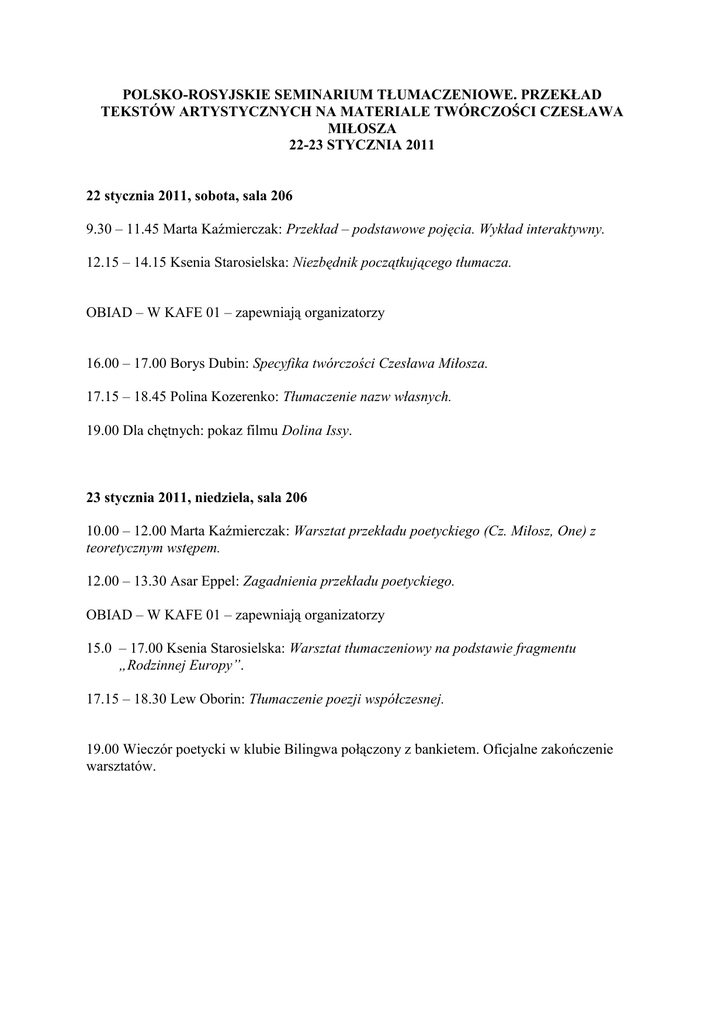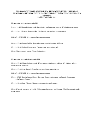 POLSKO-ROSYJSKIE SEMINARIUM TŁUMACZENIOWE. PRZEKŁAD TEKSTÓW ARTYSTYCZNYCH NA MATERIALE TWÓRCZOŚCI CZESŁAWA MIŁOSZA 22-23 STYCZNIA 2011 22 stycznia 2011, sobota, sala 206 9.30 – 11.45 Marta Kaźmierczak: Przekład – podstawowe pojęcia. Wykład interaktywny. 12.15 – 14.15 Ksenia Starosielska: Niezbędnik początkującego tłumacza. OBIAD – W KAFE 01 – zapewniają organizatorzy 16.00 – 17.00 Borys Dubin: Specyfika twórczości Czesława Miłosza. 17.15 – 18.45 Polina Kozerenko: Tłumaczenie nazw własnych. 19.00 Dla chętnych: pokaz filmu Dolina Issy. 23 stycznia 2011, niedziela, sala 206 10.00 – 12.00 Marta Kaźmierczak: Warsztat przekładu poetyckiego (Cz. Miłosz, One) z teoretycznym wstępem. 12.00 – 13.30 Asar Eppel: Zagadnienia przekładu poetyckiego. OBIAD – W KAFE 01 – zapewniają organizatorzy 15.0 – 17.00 Ksenia Starosielska: Warsztat tłumaczeniowy na podstawie fragmentu „Rodzinnej Europy”. 17.15 – 18.30 Lew Oborin: Tłumaczenie poezji współczesnej. 19.00 Wieczór poetycki w klubie Bilingwa połączony z bankietem. Oficjalne zakończenie warsztatów.