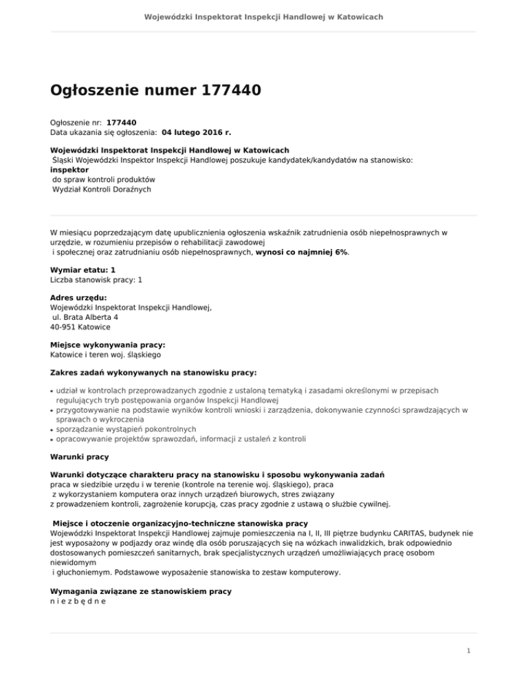 Wojewódzki Inspektorat Inspekcji Handlowej w Katowicach Ogłoszenie numer 177440 Ogłoszenie nr: 177440 Data ukazania się ogłoszenia: 04 lutego 2016 r. Wojewódzki Inspektorat Inspekcji Handlowej w Katowicach Śląski Wojewódzki Inspektor Inspekcji Handlowej poszukuje kandydatek/kandydatów na stanowisko: inspektor do spraw kontroli produktów Wydział Kontroli Doraźnych W miesiącu poprzedzającym datę upublicznienia ogłoszenia wskaźnik zatrudnienia osób niepełnosprawnych w urzędzie, w rozumieniu przepisów o rehabilitacji zawodowej i społecznej oraz zatrudnianiu osób niepełnosprawnych, wynosi co najmniej 6%. Wymiar etatu: 1 Liczba stanowisk pracy: 1 Adres urzędu: Wojewódzki Inspektorat Inspekcji Handlowej, ul. Brata Alberta 4 40-951 Katowice Miejsce wykonywania pracy: Katowice i teren woj. śląskiego Zakres zadań wykonywanych na stanowisku pracy: ● ● ● ● udział w kontrolach przeprowadzanych zgodnie z ustaloną tematyką i zasadami określonymi w przepisach regulujących tryb postępowania organów Inspekcji Handlowej przygotowywanie na podstawie wyników kontroli wnioski i zarządzenia, dokonywanie czynności sprawdzających w sprawach o wykroczenia sporządzanie wystąpień pokontrolnych opracowywanie projektów sprawozdań, informacji z ustaleń z kontroli Warunki pracy Warunki dotyczące charakteru pracy na stanowisku i sposobu wykonywania zadań praca w siedzibie urzędu i w terenie (kontrole na terenie woj. śląskiego), praca z wykorzystaniem komputera oraz innych urządzeń biurowych, stres związany z prowadzeniem kontroli, zagrożenie korupcją, czas pracy zgodnie z ustawą o służbie cywilnej. Miejsce i otoczenie organizacyjno-techniczne stanowiska pracy Wojewódzki Inspektorat Inspekcji Handlowej zajmuje pomieszczenia na I, II, III piętrze budynku CARITAS, budynek nie jest wyposażony w podjazdy oraz windę dla osób poruszających się na wózkach inwalidzkich, brak odpowiednio dostosowanych pomieszczeń sanitarnych, brak specjalistycznych urządzeń umożliwiających pracę osobom niewidomym i głuchoniemym. Podstawowe wyposażenie stanowiska to zestaw komputerowy. Wymagania związane ze stanowiskiem pracy niezbędne 1 Wojewódzki Inspektorat Inspekcji Handlowej w Katowicach wykształcenie: średnie pozostałe wymagania niezbędne: umiejętność obsługi komputera(pakiet MS Office) , znajomość przepisów ustawy z dnia 15 grudnia 2000 r. o Inspekcji Handlowej (t.j.: Dz.U. z 2014 r., poz. 148 ze zm.), znajomość ustawy z dnia 2 lipca 2004 r. o swobodzie działalności gospodarczej (t.j.: Dz.U. z 2015 r., poz. 584 ze zm.), znajomość ustawy z dnia 14 czerwca 1960 r. Kodeks postępowania administracyjnego (t.j.: Dz.U. z 2016 r., poz. 23), znajomość ustawy z dnia 21 listopada 2008 r. o służbie cywilnej (t.j.: Dz.U. z 2014 r., poz. 1111 ze zm.), umiejętność interpretacji i stosowania przepisów prawnych, umiejętność zwięzłego redagowania tekstów. wymagania dodatkowe -wykształcenie wyższe, -zdolność analitycznego myślenia i rozwiązywania problemów , -umiejętność pracy pod presją czasu , -dyspozycyjność ( kontrole w różnych porach dnia), -umiejętność pracy w zespole, komunikatywność , -czynne prawo jazdy kat. B, -rzetelność, dokładność i terminowość, odpowiedzialność i sumienność, - orientacja w bieżącej problematyce konsumenckiej , -roczny staż absolwencki w administracji publicznej, -znajomość języka angielskiego w stopniu komunikatywnym. Wymagane dokumenty i oświadczenia: ● ● ● ● ● ● ● życiorys i list motywacyjny oświadczenie o wyrażeniu zgody na przetwarzanie danych osobowych do celów rekrutacji oświadczenie o korzystaniu z pełni praw publicznych oświadczenie o nieskazaniu prawomocnym wyrokiem za umyślne przestępstwo lub umyślne przestępstwo skarbowe kopie dokumentów potwierdzających wykształcenie kopia dokumentu potwierdzającego posiadanie polskiego obywatelstwa lub oświadczenie o posiadaniu obywatelstwa polskiego kopia świadectw pracy i dokumentów potwierdzających posiadane kwalifikacje Termin składania dokumentów: 16-02-2016 Miejsce składania dokumentów: Wojewódzki Inspektorat Inspekcji Handlowej 40-951 Katowice ul. Brata Alberta 4 Sekretariat I piętro ( z zaznaczeniem na kopercie "oferta pracy- inspektor KD”) Inne informacje: Wynagrodzenie zasadnicze 1873,84 brutto + dodatek z tytułu wysługi lat pracy ( od 5% do 20% wynagrodzenia zasadniczego). Życiorys w formie CV. Oferty niepodpisane, niekompletne, niespełniające wymogów formalnych oraz złożone po terminie (decyduje data stempla pocztowego) nie będą rozpatrywane. Osoby, których oferty zostały odrzucone nie będą powiadamiane. Oferty można odebrać w terminie 3 miesięcy od daty zakończenia naboru. Po tym terminie Komisja zastrzega sobie prawo do zniszczenia dokumentów. 2 Wojewódzki Inspektorat Inspekcji Handlowej w Katowicach Postępowanie rekrutacyjne odbędzie się w Inspekcji Handlowej w Katowicach i składać się będzie z dwóch części pisemnej (z testu sprawdzającego wiedzę) oraz części ustnej (rozmowy kwalifikacyjnej). Zakres zadań Inspekcji Handlowej prezentuje nasza strona internetowa www.katowice.wiih.gov.pl Nasz urząd jest pracodawcą równych szans i wszystkie aplikacje są rozważane z równą uwagą bez względu na płeć, wiek, niepełnosprawność, rasę, narodowość, przekonania polityczne, przynależność związkową, pochodzenie etniczne, wyznanie, orientację seksualną czy też jakąkolwiek inną cechę prawnie chronioną. Dodatkowe informacje pod nr telefonu (32) 3568135 lub (32)3568120. 3