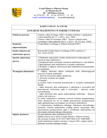 Urząd Miasta w Piławie Górnej ul. Piastowska 29 58 – 240 Piława Górna tel. (074) 832 – 49 – 10 fax. (074) 837 – 13 – 86 e-mail: [email protected] www.pilawagorna.pl KARTA USŁUG Nr USC/06 ZAWARCIE MAŁŻEŃSTWA W FORMIE CYWILNEJ Podstawa prawna Komórka Ustawa z dnia 25 lutego 1964 r. Kodeks rodzinny i opiekuńczy ( tekst jednolity Dz. U. z 2012 r. poz. 788)), Ustawa z dnia 29 września 1986 r. Prawo o aktach stanu cywilnego ( tekst jednolity Dz.U. z 2011 r. Nr 212 poz. 1264). Urząd Stanu Cywilnego w Piławie Górnej (USC) odpowiedzialna Osoba właściwa do załatwienia sprawy Sposób załatwienia sprawy Wymagane dokumenty Opłata skarbowa Kierownik Urzędu Stanu Cywilnego (USC), pokój nr 3 Tel. 74-83-24-916 1.Odebranie zapewnień o braku okoliczności wyłączających zawarcie tego małżeństwa. 2.Zorganizowanie ceremonii zawarcia małżeństwa w sali ślubów. 3.Sporządzenie aktu małżeństwa w księdze małżeństw. 4.Wydanie 3 odpisów skróconych aktu małżeństwa bezpośrednio po ceremonii. 1. Odpisy skrócone aktów urodzenia osób zamierzających zawrzeć związek małżeński. 2. Dowód uiszczenia opłaty skarbowej. 3. Dowody osobiste do wglądu . 4 Ponadto : a) Osoba, która wcześniej pozostawała w związku małżeńskim składa: - odpis skrócony aktu małżeństwa z adnotacją o rozwodzie lub prawomocne orzeczenie sądu o rozwodzie – dotyczy osoby rozwiedzionej - odpis skrócony aktu zgonu poprzedniego małżonka – dotyczy wdowy lub wdowca. b) Jeżeli małżeństwo zamierza zawrzeć kobieta niepełnoletnia, która ukończyła lat 16, to składa prawomocne postanowienie sądu opiekuńczego zezwalające na zawarcie małżeństwa. c) Cudzoziemcy dodatkowo składają: dokument stwierdzający możność zwarcia małżeństwa według prawa ojczystego albo prawomocne postanowienie sądu o zwolnieniu cudzoziemca od obowiązku złożenia takiego dokumentu. Za sporządzenie aktu małżeństwa 84 zł. Opłatę uiszcza się w kasie Urzędu Miasta w Piławie Górnej lub na konto Urzędu Nr 83 9527 0007 0042 6767 2000 0005 Jeżeli małżeństwo będzie zawarte w innym USC, wpłaty należy dokonać na konto tamtego urzędu. Czas załatwienia sprawy Tryb odwoławczy Inne informacje Formularze do pobrania Dokumentację sporządza się w dniu zgłoszenia się stron. Po upływie 1 miesiąca od dnia złożenia zapewnienia o braku przeszkód do zawarcia małżeństwa, może być zawarte małżeństwo. W przypadku odmowy przyjęcia oświadczeń o wstąpieniu w związek małżeński kierownik USC powiadamia osobę zainteresowaną o przyczynach odmowy na piśmie. Osoba zainteresowana w terminie 14 dni od dnia doręczenia jej pisma może wystąpić do sądu rejonowego właściwego ze względu na siedzibę USC o rozstrzygnięcie, czy okoliczności przedstawione przez kierownika uzasadniają odmowę dokonania czynności. Prawomocne postanowienie sądu wiąże kierownika USC. 1.Nie mogą zawrzeć małżeństwa osoby niemające ukończonych lat 18, ubezwłasnowolnione całkowicie, dotknięte chorobą psychiczną, spokrewnione lub spowinowacone w linii prostej oraz pozostające w innym związku małżeńskim. 2. Z ważnych powodów sąd opiekuńczy może zezwolić na zwarcie małżeństwa kobiecie, która ukończyła lat 16. 3.Małżeństwo nie może być zawarte przed upływem miesiąca od dnia, kiedy osoby, zamierzające je zawrzeć złożyły kierownikowi USC, pisemne zapewnienie, że nie wiedzą o istnieniu okoliczności wyłączających zawarcie tego małżeństwa. 4.Kierownik USC może z ważnych względów zezwolić na zawarcie małżeństwa przed upływem wymaganego terminu oczekiwania . 5.Obcokrajowiec, nie znający języka polskiego, winien składać zapewnienie o braku przeszkód do zawarcia małżeństwa oraz oświadczenie o wstąpieniu w związek małżeński w obecności tłumacza przysięgłego. 6.Bezpośrednio po zawarciu małżeństwa małżonkowie składają oświadczenia o tym jakie nazwisko będzie nosić każdy z nich oraz ich wspólne dzieci. Wskazane w oświadczeniu nazwisko dzieci można zmienić przez ponowne, zgodne oświadczenie małżonków złożone przy sporządzaniu aktu urodzenia pierwszego wspólnego dziecka. Wniosek składa się ustnie. Opracował: Kierownik USC-2013 Sprawdził: Sekretarz Gminy Zatwierdził: Burmistrz Piławy Górnej