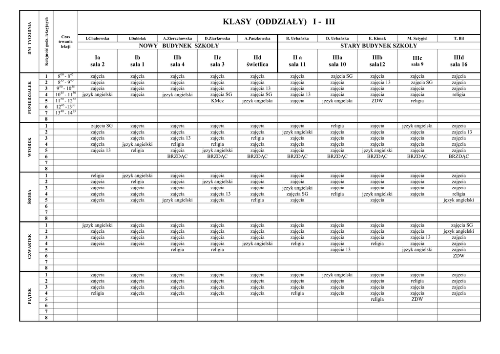 Kolejność godz. lekcyjnych DNI TYGODNIA PONIEDZIAŁEK WTOREK ŚRODA CZWARTEK PIĄTEK 1 2 3 4 5 6 7 8 1 2 3 4 5 6 7 8 1 2 3 4 5 6 7 8 1 2 3 4 5 6 7 8 1 2 3 4 5 6 7 8 KLASY (ODDZIAŁY) I - III Czas trwania lekcji 800 - 845 855 - 940 950 - 1035 1045 - 1130 1150 - 1235 1245 -1330 1340 - 1425 I.Chabowska I.Dubielak A.Zierzchowska D.Ziarkowska A.Paczkowska B. Urbańska NOWY BUDYNEK SZKOŁY Ia sala 2 Ib sala 1 IIb sala 4 zajęcia zajęcia zajęcia język angielski zajęcia zajęcia zajęcia zajęcia zajęcia zajęcia zajęcia język angielski zajęcia SG zajęcia zajęcia zajęcia zajęcia 13 zajęcia zajęcia zajęcia język angielski religia religia zajęcia zajęcia zajęcia zajęcia język angielski religia zajęcia zajęcia zajęcia język angielski zajęcia zajęcia zajęcia zajęcia zajęcia zajęcia religia zajęcia zajęcia zajęcia 13 religia zajęcia BRZDĄC IIc sala 3 zajęcia zajęcia zajęcia zajęcia SG KMcz D. Urbańska E. Kimak M. Sztygiel T. Bil STARY BUDYNEK SZKOŁY IId świetlica zajęcia zajęcia zajęcia 13 zajęcia SG język angielski II a sala 11 zajęcia zajęcia zajęcia zajęcia 13 zajęcia IIIa sala 10 zajęcia SG zajęcia zajęcia zajęcia język angielski IIIb sala12 sala 9 zajęcia zajęcia 13 zajęcia zajęcia ZDW zajęcia zajęcia SG zajęcia zajęcia religia IIIc IIId sala 16 zajęcia zajęcia zajęcia religia zajęcia zajęcia zajęcia religia język angielski BRZDĄC zajęcia zajęcia religia zajęcia zajęcia BRZDĄC zajęcia język angielski zajęcia zajęcia zajęcia BRZDĄC religia zajęcia zajęcia zajęcia zajęcia BRZDĄC zajęcia zajęcia zajęcia zajęcia język angielski BRZDĄC język angielski zajęcia zajęcia zajęcia zajęcia BRZDĄC zajęcia zajęcia zajęcia zajęcia język angielski zajęcia język angielski zajęcia zajęcia 13 zajęcia zajęcia zajęcia zajęcia zajęcia religia zajęcia zajęcia język angielski zajęcia SG zajęcia zajęcia zajęcia zajęcia religia zajęcia zajęcia zajęcia język angielski zajęcia zajęcia zajęcia zajęcia zajęcia zajęcia zajęcia zajęcia religia język angielski zajęcia zajęcia zajęcia zajęcia zajęcia zajęcia zajęcia zajęcia religia zajęcia zajęcia zajęcia zajęcia religia zajęcia zajęcia zajęcia język angielski zajęcia zajęcia zajęcia religia zajęcia zajęcia zajęcia religia zajęcia zajęcia zajęcia 13 zajęcia język angielski zajęcia SG język angielski zajęcia zajęcia zajęcia ZDW zajęcia zajęcia zajęcia zajęcia zajęcia zajęcia zajęcia zajęcia zajęcia zajęcia zajęcia zajęcia zajęcia zajęcia zajęcia zajęcia zajęcia zajęcia zajęcia religia zajęcia zajęcia zajęcia zajęcia religia zajęcia religia zajęcia zajęcia ZDW zajęcia zajęcia zajęcia zajęcia zajęcia zajęcia zajęcia zajęcia zajęcia 13 język angielski zajęcia zajęcia zajęcia zajęcia zajęcia 13 zajęcia zajęcia zajęcia BRZDĄC