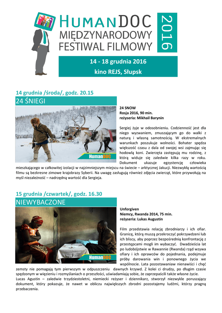 14 - 18 grudnia 2016 kino REJS, Słupsk 14 grudnia /środa/, godz. 20.15 24 ŚNIEGI 24 SNOW Rosja 2016, 90 min. reżyseria: Mikhail Barynin Sergiej żyje w odosobnieniu. Codzienność jest dla niego wyzwaniem, zmuszającym go do walki z naturą i własną samotnością. W ekstremalnych warunkach poszukuje wolności. Bohater spędza większość czasu z dala od swojej wsi zajmując się hodowlą koni. Zwierzęta zastępują mu rodzinę, z którą widuje się zaledwie kilka razy w roku. Dokument ukazuje egzystencję człowieka mieszkającego w całkowitej izolacji w najzimniejszym miejscu na świecie – arktycznej Jakucji. Niezwykłą wartością filmu są bezkresne zimowe krajobrazy Syberii. Na uwagę zasługują również zdjęcia zwierząt, które przywołują na myśl niezależność – nadrzędną wartość dla Sergieja. 15 grudnia /czwartek/, godz. 16.30 NIEWYBACZONE Unforgiven Niemcy, Rwanda 2014, 75 min. reżyseria: Lukas Augustin Film przedstawia relację zbrodniarzy i ich ofiar. Granicę, którą muszą przekroczyć pokrzywdzeni lub ich bliscy, aby poprzez bezpośrednią konfrontację z przestępcami mogli im wybaczyć. Dwadzieścia lat po ludobójstwie w Rawannie (Rwanda) rząd wzywa ofiary i ich oprawców do pojednania, podejmuje próby darowania win i ponownego życia we wspólnocie. Lata pozostawaniaw nienawiści i chęć zemsty nie pomagają tym pierwszym w odpuszczeniu dawnych krzywd. Z kolei ci drudzy, po długim czasie spędzonym w więzieniu i rozmyślaniach o przeszłości, uświadamiają sobie, że zaprzepaścili także własne życie. Lucas Agustin – zaledwie trzydziestoletni, niemiecki reżyser i dziennikarz, stworzył niezwykle poruszający dokument, który pokazuje, że nawet w obliczu największych zbrodni pozostajemy ludźmi, którzy pragną przebaczenia. 16 grudnia /piątek/, godz. 16.00 INNE DZIECI The Other Kids Hiszpania 2016, 84 min. reżyseria: Pablo de la Chica Dokument w reżyserii Pablo De La Chica to inspirująca opowieść o potędze piłki nożnej, która może zmienić życie. Setki milionów dzieci uprawiają ten sport każdego dnia. Dla wielu z nich dotacje piłkarskie są jedynym sposobem, aby uzyskać dostęp do edukacji, są szansą na lepszą przyszłość. Los Mubiry Rigana zależy właśnie od jednego z takich stypendiów. W jego przypadku to wręcz jedyny sposób na przetrwanie. Chłopiec marzy, że strzeli kiedyś gola, dzięki któremu jego kraj zdobędzie Puchar Afryki. Tak, jak to zrobił Torres dla Hiszpanii podczas Mistrzostw Europy. Film pozwala nam śledzić ponad rok z życia Rigana. Przez cały ten czas chłopiec dąży do zrealizowania swojego planu. Jego determinacja i wiara zderzają się z ciężkimi, warunkami, w których przyszło mu żyć. 17 grudnia /sobota/, godz. 20.30 PRZEZ PIEKŁO DO EUROPY Crossing Hell: Anything To Get To Europe Francja 2013, 90 min. reżyseria: Renaud Fessaguet, zespół w Libii: Camille Courcy, Olivier Azpitarte, Paul Comiti, zespół w Afganistanie: Claire Billet, Olivier Jobard Film przedstawia wyczerpującą wędrówkę dwóch nielegalnych grup emigrantów do ich wyśnionego Eldorado – Europy. Wśród nich znajdują się: Afgańczycy, którzy opuszczają Kabul oraz Kameruńczycy wyruszający ze środkowej Afryki. W swojej tułaczce przypominają niewolników. Są bici i okradani, a mimo to są gotowi zapłacić każdą cenę, by dotrzeć do celu. Te dwie skomplikowane historie zostały nakręcone w niebezpiecznych warunkach. Ta droga to walka o przetrwanie. Po raz pierwszy sami możemy się przekonać, przez co muszą przejść emigranci, żeby dostać się do Europy. 18 grudnia /niedziela/, godz. 18.00 GORĄCZKA ZŁOTA Gold Fiver USA, Gwatemala, Kanada 2016, 83 min. reżyser: J.T. Haines Gold Fever porusza problem przemysłu złotniczego w Ameryce Łacińskiej. Budowa kopalni w Gwatemali uderza w najbiedniejszych. Mieszkańcy muszą toczyć walkę o swoje ziemie z wielkimi korporacjami i prywatnymi inwestorami. W filmie zabierają głos osoby z różnych środowisk: rolnicy, artyści i przedsiębiorcy. Dokument wyróżniono nagrodą The 2013 Rigoberta Menchú Grand Prix na festiwalu First Peoples Festival w Montrealu. Został on doceniony za bezkompromisowość w ukazywaniu wyzysku i destrukcyjnego wpływu transnarodowego górnictwa na lokalne społeczności.