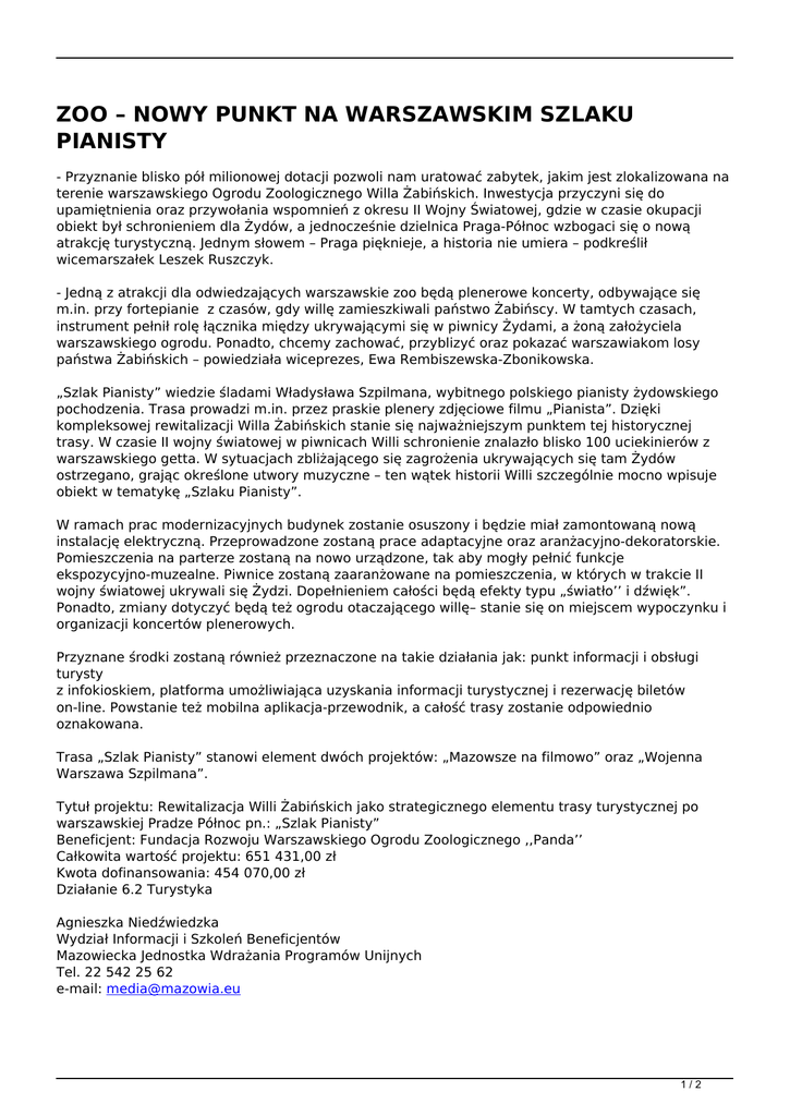 ZOO – NOWY PUNKT NA WARSZAWSKIM SZLAKU PIANISTY - Przyznanie blisko pół milionowej dotacji pozwoli nam uratować zabytek, jakim jest zlokalizowana na terenie warszawskiego Ogrodu Zoologicznego Willa Żabińskich. Inwestycja przyczyni się do upamiętnienia oraz przywołania wspomnień z okresu II Wojny Światowej, gdzie w czasie okupacji obiekt był schronieniem dla Żydów, a jednocześnie dzielnica Praga-Północ wzbogaci się o nową atrakcję turystyczną. Jednym słowem – Praga pięknieje, a historia nie umiera – podkreślił wicemarszałek Leszek Ruszczyk. - Jedną z atrakcji dla odwiedzających warszawskie zoo będą plenerowe koncerty, odbywające się m.in. przy fortepianie z czasów, gdy willę zamieszkiwali państwo Żabińscy. W tamtych czasach, instrument pełnił rolę łącznika między ukrywającymi się w piwnicy Żydami, a żoną założyciela warszawskiego ogrodu. Ponadto, chcemy zachować, przyblizyć oraz pokazać warszawiakom losy państwa Żabińskich – powiedziała wiceprezes, Ewa Rembiszewska-Zbonikowska. „Szlak Pianisty” wiedzie śladami Władysława Szpilmana, wybitnego polskiego pianisty żydowskiego pochodzenia. Trasa prowadzi m.in. przez praskie plenery zdjęciowe filmu „Pianista”. Dzięki kompleksowej rewitalizacji Willa Żabińskich stanie się najważniejszym punktem tej historycznej trasy. W czasie II wojny światowej w piwnicach Willi schronienie znalazło blisko 100 uciekinierów z warszawskiego getta. W sytuacjach zbliżającego się zagrożenia ukrywających się tam Żydów ostrzegano, grając określone utwory muzyczne – ten wątek historii Willi szczególnie mocno wpisuje obiekt w tematykę „Szlaku Pianisty”. W ramach prac modernizacyjnych budynek zostanie osuszony i będzie miał zamontowaną nową instalację elektryczną. Przeprowadzone zostaną prace adaptacyjne oraz aranżacyjno-dekoratorskie. Pomieszczenia na parterze zostaną na nowo urządzone, tak aby mogły pełnić funkcje ekspozycyjno-muzealne. Piwnice zostaną zaaranżowane na pomieszczenia, w których w trakcie II wojny światowej ukrywali się Żydzi. Dopełnieniem całości będą efekty typu „światło’’ i dźwięk”. Ponadto, zmiany dotyczyć będą też ogrodu otaczającego willę– stanie się on miejscem wypoczynku i organizacji koncertów plenerowych. Przyznane środki zostaną również przeznaczone na takie działania jak: punkt informacji i obsługi turysty z infokioskiem, platforma umożliwiająca uzyskania informacji turystycznej i rezerwację biletów on-line. Powstanie też mobilna aplikacja-przewodnik, a całość trasy zostanie odpowiednio oznakowana. Trasa „Szlak Pianisty” stanowi element dwóch projektów: „Mazowsze na filmowo” oraz „Wojenna Warszawa Szpilmana”. Tytuł projektu: Rewitalizacja Willi Żabińskich jako strategicznego elementu trasy turystycznej po warszawskiej Pradze Północ pn.: „Szlak Pianisty” Beneficjent: Fundacja Rozwoju Warszawskiego Ogrodu Zoologicznego ,,Panda’’ Całkowita wartość projektu: 651 431,00 zł Kwota dofinansowania: 454 070,00 zł Działanie 6.2 Turystyka Agnieszka Niedźwiedzka Wydział Informacji i Szkoleń Beneficjentów Mazowiecka Jednostka Wdrażania Programów Unijnych Tel. 22 542 25 62 e-mail: [email protected] 1/2 Biuro Prasowe Urząd Marszałkowski Województwa Mazowieckiego w Warszawie tel. 22 59 79 602, kom. 510 591 974 e-mail: [email protected] 2/2