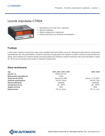 Produkty Kontrola, sterowanie i zasilanie Liczniki Liczniki Licznik impulsów CTR24 Wyświetlacz LCD, 8 cyfr, 8mm wysokości Zasilanie bateryjne Wejścia statyczne lub napięciowe Przycisk kasowania na obudowie lub zewnętrzny Funkcja Liczniki czasu używane są do pmiaru czasu pracy urządzeń takich jak silników, pomp itp. Oferujemy liczniki zarówno z podświetlanym wyświetlaczem jak i bez podświetlania. Zliczanie rozpoczyna się gdy pojawi się napięcie na wejściu licznika lub gdy zewrzemy bezpotenc zestyk. Zanik napięcia lub rozwarcie zestyku powodują zatrzymanie zliczania a wartość zliczonego czasu jest wyświetlana. Częstotliwość 50 - 60 Hz nie ma znaczenia dla liczników z wejściem napięciowym. Dane techniczne Typ Zaciski 1-6 Maksymalna częstotliwość Wolny licznik (30 Hz) Zasilanie podświetlania Wymiary [WxSxG] Temperatura pracy Stopień ochrony Dopuszczenia 2241, 2251, 2341 i 2351 PNP/4-30 V DC 12kHz zaciski 2-6, NPN 24V DC, 50mA 22x45x48 -20...+60oC IP65 CE, UL, cULul 2242 i 2342 zaciski 1-3 10-260 V AC/DC 24V DC, 50mA 22x45x48 -20...+60oC IP65 CE, UL, cULul WWW.OEMAUTOMATIC.PL, [email protected], TEL: +48 22 863 27 22, FAX: +4 Wymiary Ramka montażowa Nr katalogowy 26546844 Numer katalogowy 26546843 Adapter na szynę DIN numer katalogowy 26546840 WWW.OEMAUTOMATIC.PL, [email protected], TEL: +48 22 863 27 22, FAX: +4 Podłączenie Typ 2241, 2251, 2341 ja 2351 Typ 2242 ja 2342 1. Wynik na wyświetlaczu 2. wyjście niskiej częstotl, max 30 Hz) 3. Reset, 12 ms (2-3) 4. Aktywacja przycisku kasowania (4-6) 5. Ustawienie zakresu tryb 1 6. Minus (0 V) (23xx) 7. Ustawienie zakresu tryb 2 8. Zasilanie podświetlania (23xx) 1. wejście licznika 2. AC / DC Masa 3. Kasowanie 4. Aktywacja przycisku kasowania (4-6) 5. Ustawienie zakresu tryb 1 6. Minus (0 V) (23xx) 7. Ustawienie zakresu tryb 2 8. Zasilanie podświetlania (23xx)) Numery katalogowe Numer katalogowy 87622061 87622062 87622070 87622081 87622082 87622090 26546843 26546844 26546840 Model Opis 2241 2251 2242 2241 2251 2242 Ramka Ramka Adapter DIN Licznik impulsów LCD, wejście: PNP / NPN Licznik impulsów LCD, wejście: NPN / PNP Licznik impulsów LCD, wejście napięciowe Licznik impulsów pomarańczowo podświetlany LCD, PNP/NPN Licznik impulsów pomarańczowo podświetlany LCD, NPN.PNP Licznik impulsów pomarańczowo podświetlany LCD, wejście napięciowe Ramka 40 x 56 mm do otworu 25 x 50 mm Frame 28 x 53 mm do otworu 25 x 50 mm Adapter do montażu na szynie DIN WWW.OEMAUTOMATIC.PL, [email protected], TEL: +48 22 863 27 22, FAX: +4