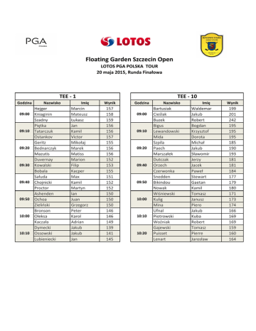 Floating Garden Szczecin Open LOTOS PGA POLSKA TOUR 20 maja 2015, Runda Finałowa TEE - 1 Godzina 09:00 09:10 09:20 09:30 09:40 09:50 10:00 10:10 Nazwisko Hejger Kniaginin Szadny Piętka Tatarczuk Ostankov Geritz Bednarczyk Mazutis Duvernay Kowalski Bobala Sałuda Chojnicki Proctor Ashenden Ochoa Zieliński Bronson Oleksa Kaczała Dymecki Ossowski Lubieniecki TEE - 10 Imię Marcin Mateusz Łukasz Jan Kamil Victor Mikołaj Marek Matiss Marion Filip Kacper Max Kamil Martyn Ian Juan Grzegorz Peter Karol Adrian Jakub Jakub Jan Wynik 157 158 159 156 156 157 155 156 156 152 153 155 151 152 152 150 150 150 146 146 149 139 141 145 Godzina 09:00 09:10 09:20 09:40 09:50 10:00 10:10 10:20 Nazwisko Bartusiak Cieślak Buzek Bigus Lewandowski Mida Szpila Paech Marszałek Dutczak Orzech Czerwonka Snedden Bikindou Nowak Wiśniewski Kulig Mina Ufnal Piotrowski Woźniak Gajewski Puisset Lenart Imię Waldemar Jakub Robert Bogdan Krzysztof Dorota Michał Jakub Sławomir Jerzy Jacek Paweł Stewart Gaetan Kamil Tomasz Janusz Piero Jakub Kuba Robert Tomasz Pierre Jarosław Wynik 199 201 242 195 195 195 185 190 193 181 181 184 177 179 180 171 173 174 166 169 169 159 160 164