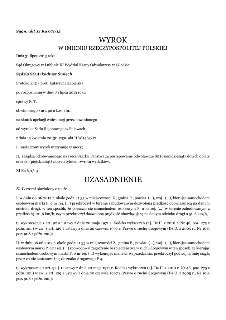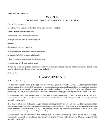 Sygn. akt XI Ka 671/13 WYROK W IMIENIU RZECZYPOSPOLITEJ POLSKIEJ Dnia 31 lipca 2013 roku Sąd Okręgowy w Lublinie XI Wydział Karny Odwoławczy w składzie: Sędzia SO Arkadiusz Śmiech Protokolant: - prot. Katarzyna Zabielska po rozpoznaniu w dniu 31 lipca 2013 roku sprawy K. T. obwinionego z art. 92 a k.w. i in. na skutek apelacji wniesionej przez obwinionego od wyroku Sądu Rejonowego w Puławach z dnia 15 kwietnia 2013r. sygn. akt II W 1463/12 I. zaskarżony wyrok utrzymuje w mocy; II. zasądza od obwinionego na rzecz Skarbu Państwa za postępowanie odwoławcze 80 (osiemdziesiąt) złotych opłaty oraz 50 (pięćdziesiąt) złotych tytułem zwrotu wydatków. XI Ka 671/13 UZASADNIENIE K. T. został obwiniony o to, że I. w dniu 06.06.2012 r. około godz. 11.35 w miejscowości Z., gmina P., powiat (...), woj. (...), kierując samochodem osobowym marki P. o nr rej. (...) przekroczył w terenie zabudowanym dozwoloną prędkość obowiązującą na danym odcinku drogi, w ten sposób, że poruszał się samochodem osobowym P. o nr rej. (...) w terenie zabudowanym z prędkością 101,6 km/h, czym przekroczył dozwoloną prędkość obowiązującą na danym odcinku drogi o 51, 6 km/h, tj. wykroczenie z art. 92 a ustawy z dnia 20 maja 1971 r. Kodeks wykroczeń (t.j. Dz.U. z 2010 r. Nr 46, poz. 275 z późn. zm.) w zw. z art. 129 a ustawy z dnia 20 czerwca 1997 r. Prawo o ruchu drogowym (Dz.U. z 2005 r., Nr 108, poz. 908 z późn. zm.); II. w dniu 06.06.2012 r. około godz. 11.35 w miejscowości Z., gmina P., powiat (...), woj. (...), kierując samochodem osobowym marki P. o nr rej. (...) spowodował zagrożenie bezpieczeństwa w ruchu drogowym w ten sposób, że kierując samochodem osobowym marki P. o nr rej. (...) wykonując manewr wyprzedzania, przekroczył podwójną linię ciągłą przez co nie zastosował się do znaku drogowego P-4, tj. wykroczenie z art. 92 § 1 ustawy z dnia 20 maja 1971 r. Kodeks wykroczeń (t.j. Dz.U. z 2010 r. Nr 46, poz. 275 z późn. zm.) w zw. z art. 129 a ustawy z dnia 20 czerwca 1997 r. Prawo o ruchu drogowym (Dz.U. z 2005 r., Nr 108, poz. 908 z późn. zm.); III. w dniu 06.06.2012 r. około 11.35 w miejscowości Z., gmina P., powiat (...), woj. (...), kierując samochodem osobowym marki P. o nr rej. (...) spowodował umyślne zagrożenie bezpieczeństwa w ruchu drogowym w ten sposób, że kierując samochodem osobowym marki P. o nr rej. (...), wykonywał manewr wyprzedzania na skrzyżowaniu, tj. wykroczenie z art. 97 ustawy z dnia 20 maja 1971 r. Kodeks wykroczeń (t.j. Dz.U. z 2010 r. Nr 46, poz. 275 z późn. zm.) w zw. z art. 24 ust. 7 pkt 3, art. 129 a ustawy z dnia 20 czerwca 1997 r. Prawo o ruchu drogowym (Dz.U. z 2005 r., Nr 108, poz. 908 z późn. zm.); IV. w dniu 06.06.2012 r. około 11.35 w miejscowości Z., gmina P., powiat (...), woj. (...), kierując samochodem osobowym marki P. o nr rej. (...) spowodował umyślne zagrożenie bezpieczeństwa w ruchu drogowym w ten sposób, że kierując samochodem osobowym marki P. o nr rej. (...), wykonywał manewr wyprzedzania na przejściu dla pieszych, tj. wykroczenie z art. 97 ustawy z dnia 20 maja 1971 r. Kodeks wykroczeń (t.j. Dz.U. z 2010 r. Nr 46, poz. 275 z późn. zm.) w zw. z art. 26 ust. 3 pkt 1, art. 129 a ustawy z dnia 20 czerwca 1997 r. Prawo o ruchu drogowym (Dz.U. z 2005 r., Nr 108, poz. 908 z późn. zm.); Wyrokiem z dnia 15 kwietnia 2013 r. Sąd Rejonowy w Puławach obwinionego K. T.: uznał za winnego popełnienia czynu zarzucanego mu w punkcie I wniosku o ukaranie, wyczerpującego dyspozycję art. 92a kw oraz w ramach czynów zarzucanych mu w punkcie II, III i IV wniosku o ukaranie uznał za winnego tego, że w dniu 6 czerwca 2012 roku, około godziny 11:35 w miejscowości Z., gmina P., powiat (...), województwo (...), kierując samochodem osobowym marki P. o numerze rejestracyjnym (...) wykonał manewr wyprzedzania na skrzyżowaniu oraz przejściu dla pieszych, a nadto nie zastosował się do znaku poziomego P – 4 „podwójna linia ciągła”, to jest czynu wyczerpującego dyspozycję art. 92 § 1 kw w zb. z art. 97 kw w zw. z art. 9 § 1 kw i za to na podstawie art. 92a kw w zw. z art. 9 § 2 kw wymierzył mu karę 800 (ośmiuset) złotych grzywny; zwolnił obwinionego K. T. od zapłaty na rzecz Skarbu Państwa kosztów sądowych i ustalił, że wchodzące w ich skład zryczałtowane wydatki postępowania ponosi Skarb Państwa. Apelację od powyższego wyroku wniósł obwiniony zarzucając: obrazę przepisów prawa materialnego, mogącą mieć wpływ na treść wydanego orzeczenia, a mianowicie art. 24 § 3 i art. 33 § 2 i § 3, art. 39 § 1, 2 i 4 kodeksu wykroczeń poprzez ich niezastosowanie, wyrażające się w wymierzeniu obwinionemu kary niewspółmiernie wysokiej z pominięciem zasady indywidualizacji wymiaru kary, dyrektyw wymiaru kary oraz okoliczności wpływających na jej nadzwyczajne złagodzenie. Wniósł o zmianę wyroku poprzez odstąpienie od wymierzenia kary, ewentualnie nadzwyczajne złagodzenie orzeczonej kary grzywny i nie obciążanie obwinionego kosztami postępowania przed Sądem II instancji. Sąd Okręgowy zważył, co następuje: Apelacja nie jest zasadna i nie zasługiwała na uwzględnienie. W toku kontroli odwoławczej nie stwierdzono, by Sąd Rejonowy rozpoznając sprawę dopuścił się obrazy przepisów postępowania, błędu w ustaleniach faktycznych, bądź popełnił inne uchybienia, które dyskwalifikowałyby trafność wydanego rozstrzygnięcia. Postępowanie dowodowe w sprawie zostało przeprowadzone rzetelnie oraz dokładnie, a ustalenia faktyczne poczynione przez Sąd Rejonowy i wyprowadzone z nich wnioski znalazły odzwierciedlenie w części dyspozytywnej wyroku stanowiąc rezultat kompleksowej oceny całości zgromadzonego w sprawie materiału dowodowego. Ocena ta jest zgodna z regułami zawartymi w art. 4 kpk w zw. z art. 8 kpw, art. 7 kpk w zw. z art. 8 kpw i 410 kpk w zw. z art. 82 § 1 kpw. Jest bowiem wszechstronna, obiektywna, t