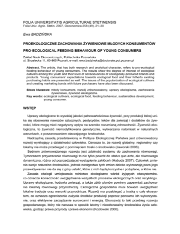 FOLIA UNIVERSITATIS AGRICULTURAE STETINENSIS Folia Univ. Agric. Stetin. 2007, Oeconomica 258 (49), 21–30 Ewa BADZIŃSKA PROEKOLOGICZNE ZACHOWANIA ŻYWIENIOWE MŁODYCH KONSUMENTÓW PRO-ECOLOGICAL FEEDING BEHAVIOUR OF YOUNG CONSUMERS Zakład Nauk Ekonomicznych, Politechnika Poznańska ul. Strzelecka 11, 60-965 Poznań, e-mail: [email protected] Abstract. The article, that has both research and analytical character, refers to pro-ecological feeding behaviour of young consumers. The results show the degree of interest of ecological cultivars among the youth and their level of consciousness of ecologically-produced brands and products. Young consumers’ expectations towards ecological food and their hitherto existing purchasing habits are presented as well. The issues of the popularization of ecological cultivars and creating marketing bonds with future purchasers have also been discussed. Słowa kluczowe: młody konsument, rozwój zrównoważony, uprawy ekologiczne, zachowania żywieniowe, żywność ekologiczna. Key words: ecological cultivars, ecological food, feeding behaviour, sustainables development, young consumer. WSTĘP Uprawy ekologiczne to wysokiej jakości pełnowartościowa żywność, przy produkcji której unika się stosowania nawozów sztucznych, pestycydów, leków dla zwierząt i dodatków do żywności, które mogą mieć negatywny wpływ na szeroko rozumianą zdrowotność. Żywność ekologiczna, to żywność niemodyfikowana genetycznie, wytwarzana natomiast w naturalnych warunkach, z poszanowaniem otaczającego środowiska. Nadrzędną zasadą przedstawioną w Polityce Ekologicznej Państwa jest zrównoważony rozwój wynikający z działalności człowieka. Oznacza to, że rozwój globalny, regionalny czy lokalny nie może przebiegać z pominięciem troski o środowisko (Jaworski 2006). Sednem zrównoważonego rozwoju jest zdolność systemu do zachowania równowagi. Tymczasem przywracanie równowagi to nie tylko powrót do status quo ante, ale równowaga dynamiczna, różna od poprzedzającej wystąpienie zakłóceń (Habuda 2007). Człowiek zmienia swoje naturalne środowisko, jednak następstwa tych zmian daleko wykraczają poza jego przewidywania i nie da się z góry ustalić, które z nich będą korzystne i pożądane, a które nie. Zasada ekologii umiejscawia rolnictwo ekologiczne wśród żyjących ekosystemów, co oznacza konieczność uwzględniania wszystkich procesów ekologicznych oraz recyklingu. Uprawy ekologiczne, hodowla zwierząt, a także zbiór plonów powinny zapewniać zachowanie lokalnej równowagi przyrodniczej. Ekologiczna gospodarka musi bowiem uwzględniać lokalne tradycje oraz warunki przyrodnicze. Rozwój ma przebiegać z troską o cały ekosystem, co oznacza ograniczenie zużycia środków produkcji poprzez ponowne ich wykorzystanie, oraz efektywne zarządzanie surowcami i energią. Ekorozwój to taki przebieg rozwoju gospodarczego, który nie narusza w sposób istotny i nieodwracalny środowiska życia człowieka, godząc prawa przyrody i prawa ekonomii (Kozłowski 2000). 22 E. Badzińska Realizacja tych założeń spowoduje poprawę stanu środowiska, odtworzenie i wzbogacenie zasobów przyrody, a także pozwoli chronić zapasy dla przyszłych pokoleń. Celem rolnictwa ekologicznego – zarówno produkcji rolniczej, przetwórstwa, dystrybucji, jak i konsumpcji – jest utrzymanie i wzmacnianie zdrowotności ekosystemów i organizmów (IFOAM – Zasady i cele rolnictwa ekologicznego 2006). Rolnictwo ekologiczne ma zatem wspierać zdrowotność gleby, roślin, zwierząt, człowieka i Ziemi, jako elementów niepodzielnej całości. Tylko zdrowie wszystkich ekosystemów przyniesie efekt w postaci zdrowych społeczeństw. Żyjące systemy stanowią bowiem integralną całość i nie można traktować jednych z pominięciem drugich. Fundamentalne zasady rolnictwa ekologicznego, określone przez Międzynarodową Federację Rolnictwa Ekologicznego IFOAM (The International Federation of Organic Agriculture Movements), to: zdrowotność, ekologia, sprawiedliwość i troskliwość. Jest to zespół norm etycznych, które mają inspirować do działania na rzecz rozwoju zrównoważonego. Wyrażają one priorytety oraz wskazują wizję poprawy rolnictwa w skali globalnej. Obejmują poszanowanie krajobrazu oraz całej wspólnoty istnień – wartości składających się na dziedzictwo przyszłych pokoleń (IFOAM – Zasady i cele rolnictwa ekologicznego 2007). W celu zgłębienia problematyki zachowań żywieniowych młodych konsumentów, ich świadomości dotyczącej upraw ekologicznych, a także znajomości marek i produktów wytwarzanych ekologicznie w marcu i kwietniu 2007 roku przeprowadzone zostały ilościowe badania sondażowe z wykorzystaniem ankiety audytoryjnej na celowo dobranej zbiorowości próbnej 364 respondentów. Próba została dobrana, kwotowo zgodnie z zasadą proporcjonalnego doboru statystycznego na podstawie danych opublikowanych przez Urząd Statystyczny w Poznaniu (Edukacja i wychowanie 2006) – 66% mężczyzn, 34% kobiet. Podmiotem badań byli studenci studiów stacjonarnych Politechniki Poznańskiej do trzeciego roku włącznie, pochodzący z województwa wielkopolskiego. Badaną próbę sklasyfikowano według określonych cech statystycznych (płeć, wiek, kierunek studiów, miejsce zamieszkania, dochód na członka rodziny). Artykuł ma charakter badawczo-analityczny. Podstawą jego opracowania była literatura przedmiotu, dotycząca upraw ekologicznych i problematyki młodych ludzi jako konsumentów, oraz analiza wyników badań empirycznych przeprowadzonych przez autorkę. POSTAWY MŁODYCH KONSUMENTÓW WOBEC UPRAW EKOLOGICZNYCH W wyniku rozwoju hiperkonkurencji na rynkach międzynarodowych konsumenci zyskali dostęp do ogromnego bogactwa produktów i usług, które spełniają podobne standardy jakościowe i są oferowane po zbliżonych cenach. Branża spożywcza jest tego wyraźnym przykładem. Paleta produkt