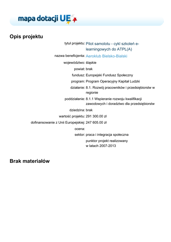 Opis projektu tytuł projektu: Pilot samolotu - cykl szkoleń e- learningowych do ATPL(A) nazwa beneficjenta: Aeroklub Bielsko-Bialski województwo: śląskie powiat: brak fundusz: Europejski Fundusz Społeczny program: Program Operacyjny Kapitał Ludzki działanie: 8.1. Rozwój pracowników i przedsiębiorstw w regionie poddziałanie: 8.1.1 Wspieranie rozwoju kwalifikacji zawodowych i doradztwo dla przedsiębiorstw dziedzina: brak wartość projektu: 291 300.00 zł dofinansowanie z Unii Europejskiej: 247 605.00 zł ocena: sektor: praca i integracja społeczna punktor projekt realizowany w latach 2007-2013 Brak materiałów