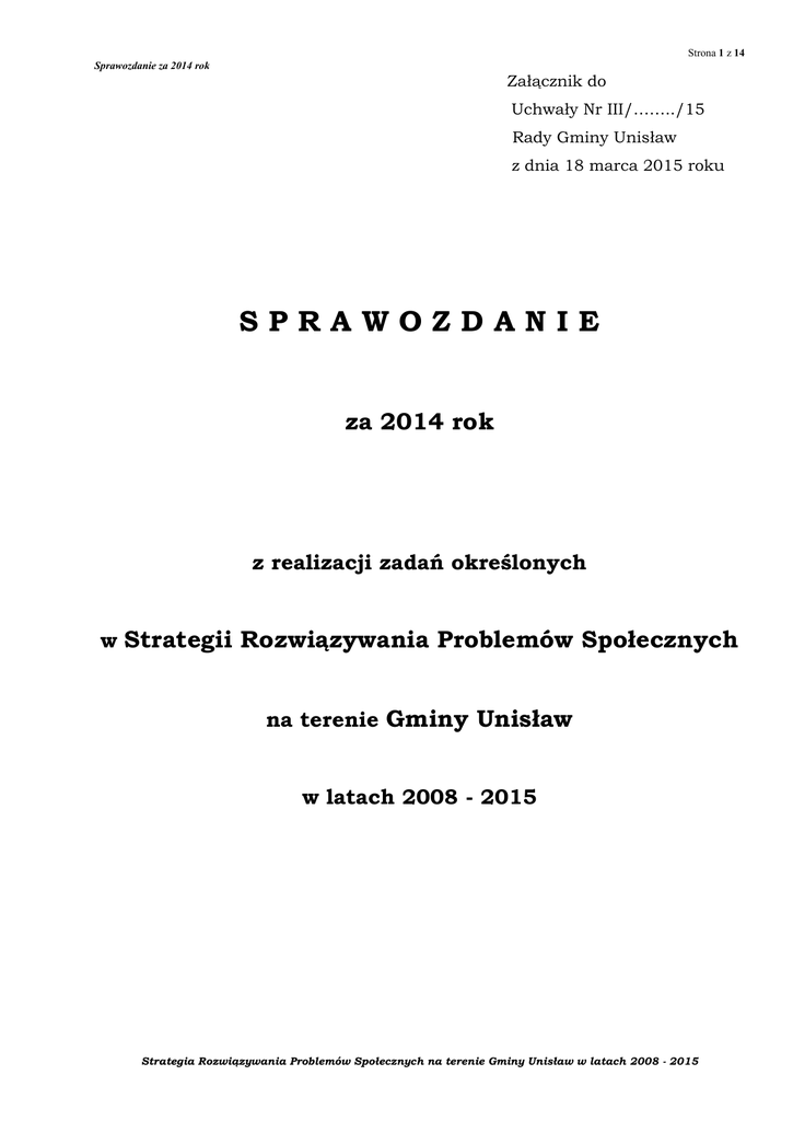 Strona 1 z 14 Sprawozdanie za 2014 rok Załącznik do Uchwały Nr III/……../15 Rady Gminy Unisław z dnia 18 marca 2015 roku SPRAWOZDANIE za 2014 rok z realizacji zadań określonych w Strategii Rozwiązywania Problemów Społecznych na terenie Gminy Unisław w latach 2008 - 2015 Strategia Rozwiązywania Problemów Społecznych na terenie Gminy Unisław w latach 2008 - 2015 Strona 2 z 14 Sprawozdanie za 2014 rok Spis treści Wstęp …………………………………………………………………………………………………. I. Zwalczanie bezrobocia i przeciwdziałanie jego skutkom …………………………. II. Poprawa jakości życia ludzi starszych oraz zapobieganie marginalizacji życia starszego pokolenia ………………………………………………………………… III. str. 6 str. 7 Działania na rzecz poprawy funkcjonowania rodzin patologicznych i zagrożonych patologiami …………………………………………………………………. VI. str. 4 Poprawa warunków społecznego funkcjonowania osób niepełnosprawnych w społeczności lokalnej i integracja społeczna ……………………………………… V. str. 4 Budowa systemu profilaktyki przeciwalkoholowej oraz bieżące rozwiązywanie problemów z tym związanych wśród społeczności lokalnej ……………………… IV. str. 3 str. 9 Zatrzymanie mechanizmów społecznego wykluczenia i marginalizacji wśród dzieci i młodzieży ………………..………………………………………………………… str. 10 VII. Zwalczanie problemu narkomanii ……………………………………………………… str. 12 VIII. Zwiększenie aktywności społecznej mieszkańców …………………………………. str. 12 IX. Wzmocnienie oddziaływania instytucji odpowiedzialnych za politykę społeczną w gminie ……………………………………………………………………….. str. 13 Podsumowanie ……………………………………………………………………………………… str. 14 Strategia Rozwiązywania Problemów Społecznych na terenie Gminy Unisław w latach 2008 - 2015 Strona 3 z 14 Sprawozdanie za 2014 rok Wstęp Strategia Rozwiązywania Problemów Społecznych jest dokumentem opracowywanym w celu kształtowania lokalnej polityki społecznej, poprzez wyznaczanie głównych celów i zadań do realizacji, ukierunkowanych na poprawę życia mieszkańców gminy Unisław, powstałym w oparciu o diagnozę stanu problemów społecznych. Cele integracji powinny być wyrazem dążeń i aspiracji społeczności lokalnej zmierzających do rozwiązania zidentyfikowanych problemów, likwidacji barier i zagrożeń oraz do wykorzystania wszelkich szans tkwiących w potencjale ludzkim i materialnym dla przyszłej integracji. Niniejsze opracowanie stanowi aktualizację, która uzupełnia i uszczegóławia o kwestie lokalnej polityki społecznej Strategię Rozwoju Gminy Unisław na lata 2008 - 2015. Konieczność opracowania i realizacji gminnej strategii rozwiązywania problemów społecznych wynika z art. 17 ust. 1 ustawy o pomocy społecznej z dnia 12 marca 2004 roku. Jest to zadanie własne gminy o charakterze obowiązkowym. W dniu 19 listopada 2008 roku uchwałą Nr VIII/45/08 Rady Gminy w Unisławiu została przyjęta Strategia Rozwiązywania Problemów Społecznych na lata 2008 - 2015. Określono w niej najważniejsze cele strategiczne, które mają zapewnić bezpieczeństwo socjalne mieszkańcom naszej gminy oraz podejmowanie różnorodnych działań dla poprawy warunków zaspokojenia potrzeb przez wybrane kategorie osób i rodzin. Dokument ten został opracowany przez Gminny Ośrodek Pomocy Społecznej przy wykorzystaniu własnych materiałów sprawozdawczych, analiz oraz informacji i materiałów przygotowanych przez jednostki administracji publicznej. Przyjęte w nim koncepcje wskazują sposoby zaradzenia problemom społecznym na terenie Gminy Unisław. Sprawozdanie z realizacji Strategii Rozwiązywania Problemów społecznych stanowi prezentację projektów i działań podejmowanych w celu realizacji przyjętych zadań wraz ze wskazaniem ich realizatorów na rzecz mieszkańców Gminy Unisław. Strategia Rozwiązywania Problemów Społecznych na terenie Gminy Unisław w latach 2008 - 2015 Strona 4 z 14 Sprawozdanie za 2014 rok I - Zwalczanie bezrobocia i przeciwdziałanie jego skutkom 1. Urząd Gminy w Unisławiu zorganizował roboty publiczne dla 54 osób bezrobotnych, na staż dla osób bezrobotnych zostało przyjętych 29 osób. 2. Gminny Ośrodek Pomocy Społecznej wspierał osoby dotknięte bezrobociem pomocą w formie zasiłku okresowego, zasiłku celowego, dożywiania w ramach programu wieloletniego „Pomoc państwa w zakresie dożywiania” – pomoc z tytułu bezrobocia otrzymało 222 rodziny. W ramach programu „Dostarczanie żywności dla najuboższej Ludności Unii Europejskiej” pośredniczył w przekazywaniu pomocy żywnościowej – w 2014 roku z pomocy tej skorzystało 591 osób - najbiedniejszych mieszkańców gminy. 3. Zespól Szkół w Unisławiu realizował program: Doradztwo edukacyjno – zawodowe – „Atrakcyjne kształcenie zawodowe w powiecie chełmińskim ” dla Zasadniczej Szkoły Zawodowej. 4. Gminny Ośrodek Kultury w Unisławiu organizował zajęcia, które pozwalają zdobyć nowe umiejętności: język angielski, zajęcia plastyczne, Akademia Dorosłego Człowieka, zespoły wokalne, orkiestra, szachy, klub gier planszowych, zajęcia ruchowe (joga, fitness, aerobik). 5. Gminna Biblioteka Publiczna przeciwdziałając wykluczeniu cyfrowemu zorganizowała kurs 50+, który trwał 18 godzin/osobę. Obejmował podstawę obsługi komputera i Internetu, program World, założenie poczty e-mail oraz obsługę wybranego portalu społecznościowego. W kursie wzięło udział 12 osób. II - Poprawa jakości życia ludzi starszych oraz zapobieganie marginalizacji życia starszego pokolenia