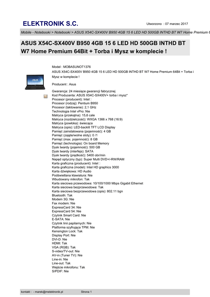 ELEKTRONIK S.C. Utworzono : 07 marzec 2017 Mobile - Notebooki > Notebooki > ASUS X54C-SX400V B950 4GB 15 6 LED HD 500GB INTHD BT W7 Home Premium 6 ASUS X54C-SX400V B950 4GB 15 6 LED HD 500GB INTHD BT W7 Home Premium 64Bit + Torba i Mysz w komplecie ! Model : MOBASUNOT1376 ASUS X54C-SX400V B950 4GB 15 6 LED HD 500GB INTHD BT W7 Home Premium 64Bit + Torba i Mysz w komplecie ! Producent : Asus Gwarancja: 24 miesiące gwarancji fabrycznej Kod Producenta: ASUS X54C-SX400V+ torba i mysz* Procesor (producent): Intel� Procesor (rodzaj): Pentium B950 Procesor (taktowanie): 2,1 GHz Technologia Intel vPro: Nie Matryca (przekątna): 15,6 cale Matryca (rozdzielczość): WXGA 1366 x 768 (16:9) Matryca (powłoka): świecąca Matryca (opis): LED-backlit TFT LCD Display Pamięć zainstalowana (pojemność): 4 GB Pamięć (zajęte/wolne sloty): 0 /1 Pamięć (max. pojemność): 8 GB Pamięć (technologia): On board Memory Dysk twardy (pojemność): 500 GB Dysk twardy (interfejs): SATA Dysk twardy (prędkość): 5400 obr/min Napęd optyczny (typ): Super Multi DVD+/-RW/RAM Karta graficzna (producent): Intel� Karta graficzna (model): Intel HD graphics 3000 Karta dźwiękowa: HD Audio Podświetlana klawiatura: Nie Wbudowany mikrofon: Tak Karta sieciowa przewodowa: 10/100/1000 Mbps Gigabit Ethernet Karta sieciowa bezprzewodowa: Tak Karta sieciowa bezprzewodowa (opis): 802.11 bgn Bluetooth: Tak Modem 3G: Nie Fax modem: Nie ExpressCard 34: Nie ExpressCard 54: Nie Czytnik Smart Card: Nie E-SATA: Nie Czytnik linii papilarnych: Nie Platforma szyfrująca TPM: Nie Kensington Lock: Tak Display Port: Nie DVI-D: Nie HDMI: Tak VGA (RGB): Tak S-video/TV-out: Nie AV-in (Tuner TV): Nie Line-in: Nie Line-out: Tak Wejście mikrofonu: Tak S/PDIF: Nie kontakt : - [email protected] Strona 1 ELEKTRONIK S.C. Utworzono : 07 marzec 2017 Mobile - Notebooki > Notebooki > ASUS X54C-SX400V B950 4GB 15 6 LED HD 500GB INTHD BT W7 Home Premium 6 ASUS X54C-SX400V B950 4GB 15 6 LED HD 500GB INTHD BT W7 Home Premium 64Bit + Torba i Mysz w komplecie ! RS232 (szeregowy): Nie Czytnik kart pamięci: Tak Panel klawiszy multimedialnych: Nie Złącze replikatora portów: Nie Fire-Wire (IEEE1394): Nie USB 2.0: 2 szt. USB 3.0: 1 szt. System operacyjny: Windows 7 Home Premium 64 bit System operacyjny (wer. Językowa): polski Wbudowana kamera: Tak Wymiary (wysokość): 37 mm Wymiary (szerokość): 378 mm Wymiary (głębokość): 253 mm Waga: 2,6 kg Gwarancja: 24 mies Gwarancja międzynarodowa: Nie Gwarancja baterii: 12 mies Wyposażenie: + Torba i Mysz w komplecie ! Opis: * brak raportowania i dodatkowych upustów ze strony ASUS, Adres www producenta: Link na stronę opisu technicznego Serwis producenta: Wsparcie Techniczne Asus +48 22 571 80 40 Cena : 1.804,08 zł Brutto ( 1.478,75 zł Netto) Dostępność: Produkt dostępny w naszym sklepie od 23 czerwiec 2012 kontakt : - [email protected] Strona 2
