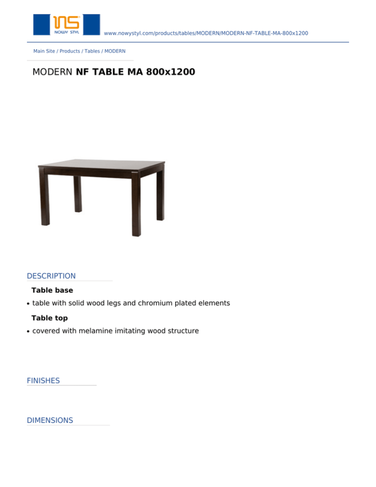 www.nowystyl.com/products/tables/MODERN/MODERN-NF-TABLE-MA-800x1200 Main Site / Products / Tables / MODERN MODERN NF TABLE MA 800x1200 DESCRIPTION Table base ● table with solid wood legs and chromium plated elements Table top ● covered with melamine imitating wood structure FINISHES DIMENSIONS All rights reserved 2013 Nowy Styl Group CONTACT Nowy Styl Sp. z o.o. Pużaka 49 38-400 Krosno Tel. +48 13 43 76 100 Fax +48 13 43 62 732 [email protected] Export Department Mięsowicza 6 38-400 Krosno Poland Tel. +48 13 43 76 111 [email protected] Marketing Department Warszawska 15 32-086 Węgrzce Poland Tel. +48 12 63 98 602