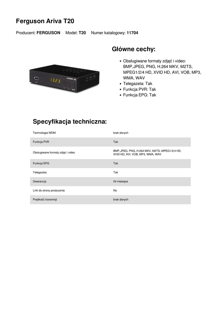 Ferguson Ariva T20 Producent: FERGUSON Model: T20 Numer katalogowy: 11704 Główne cechy: Obsługiwane formaty zdjęć i video: BMP,JPEG, PNG, H.264 MKV, M2TS, MPEG1/2/4 HD, XVID HD, AVI, VOB, MP3, WMA, WAV Telegazeta: Tak Funkcja PVR: Tak Funkcja EPG: Tak Specyfikacja techniczna: Technologia WDM brak danych Funkcja PVR Tak Obsługiwane formaty zdjęć i video BMP,JPEG, PNG, H.264 MKV, M2TS, MPEG1/2/4 HD, XVID HD, AVI, VOB, MP3, WMA, WAV Funkcja EPG Tak Telegazeta Tak Gwarancja 24 miesiące Link do strony producenta No Prędkość transmisji brak danych