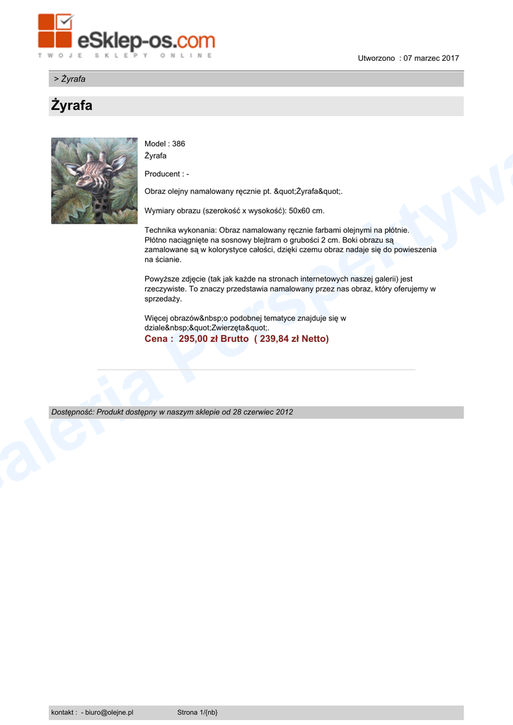 Utworzono : 07 marzec 2017 > Żyrafa Żyrafa Model : 386 Żyrafa w y t Producent : Obraz olejny namalowany ręcznie pt. "Żyrafa". Wymiary obrazu (szerokość x wysokość): 50x60 cm. k e Technika wykonania: Obraz namalowany ręcznie farbami olejnymi na płótnie. Płótno naciągnięte na sosnowy blejtram o grubości 2 cm. Boki obrazu są zamalowane są w kolorystyce całości, dzięki czemu obraz nadaje się do powieszenia na ścianie. p rs Powyższe zdjęcie (tak jak każde na stronach internetowych naszej galerii) jest rzeczywiste. To znaczy przedstawia namalowany przez nas obraz, który oferujemy w sprzedaży. e P a Więcej obrazów o podobnej tematyce znajduje się w dziale "Zwierzęta". Cena : 295,00 zł Brutto ( 239,84 zł Netto) i r e l a G Dostępność: Produkt dostępny w naszym sklepie od 28 czerwiec 2012 kontakt : - [email protected] Strona 1/{nb}