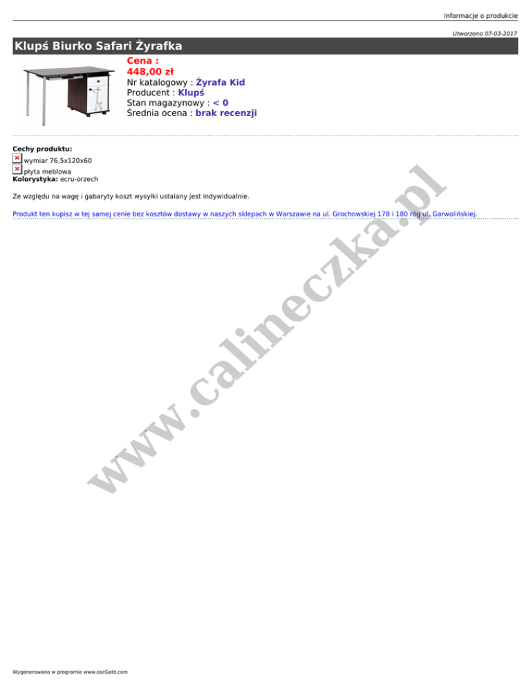 Informacje o produkcie Utworzono 07-03-2017 Klupś Biurko Safari Żyrafka Cena : 448,00 zł Nr katalogowy : Żyrafa Kid Producent : Klupś Stan magazynowy : < 0 Średnia ocena : brak recenzji Cechy produktu: wymiar 76,5x120x60 pl płyta meblowa Kolorystyka: ecru-orzech Ze względu na wagę i gabaryty koszt wysyłki ustalany jest indywidualnie. w w w .c al in ec zk a. Produkt ten kupisz w tej samej cenie bez kosztów dostawy w naszych sklepach w Warszawie na ul. Grochowskiej 178 i 180 róg ul. Garwolińskiej. Wygenerowano w programie www.oscGold.com