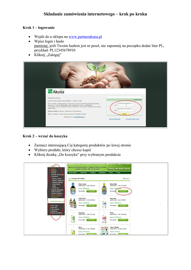 Składanie zamówienia internetowego – krok po kroku Krok 1 – logowanie Wejdź do e-sklepu na www.partnerakuna.pl Wpisz login i hasło pamietaj: jeśli Twoim hasłem jest nr pesel, nie zapomnij na początku dodać liter PL, przykład: PL12345678910 Kliknij „Zaloguj” Krok 2 – wrzuć do koszyka Zaznacz interesującą Cię kategorię produktów po lewej stronie Wybierz produkt, który chcesz kupić Kliknij ikonkę „Do koszyka” przy wybranym produkcie Krok 3 – przejscie do koszyka Kliknij na ikonkę koszyka w prawym górnym rogu Krok 4 – wybór ilości Kliknij w okienko „Ilość” przy produkcie i wpisz ile jego sztuk chcesz zamówić Powtórz czynność dla każdego produktu znajdującego się w koszyku Kliknij „Aktualizuj” w lewym dolnym rogu strony Jeśli zawartość koszyka po aktualizacji jest zgodna z tym, co chcesz kupić, kliknij „Realizuję zamówienie” Krok 5 – adres dostawy/dane do faktury Aby nie wpisywać danych odbiorcy za każdym razem można je zapisać klikając w okienko i zaznaczając „ptaszkiem” opcję „zapisz odbiorcę pod nazwą” Wybieramy opcję faktury uwaga: należy osobno zaznaczyć dane na transport i na towar W opcjach dotyczących towaru można wybrać opcję tzw. obie (zamówienie części towaru na firmę, a części na osobę fizyczną uwaga: nie dotyczy Zestawów Krok 6 – informacja o złożeniu zamówienia Sprawdź, czy wszystko się zgadza (zamówiony towar, dane zamawiającego, adres dostawy itp.). Jeśli tak, kliknij „Realizuj Zamówienie” Spisz numer zamówienia, który należy podać w tytule wpłaty Kopia zamówienia zostanie przesłana na Twój adres e-mail, jak również będzie widoczna w historii zamówień